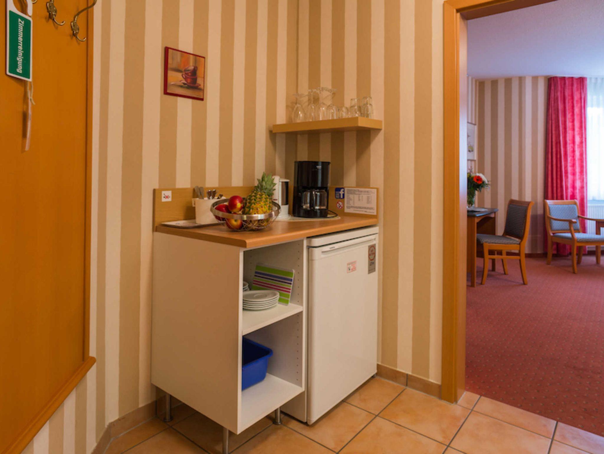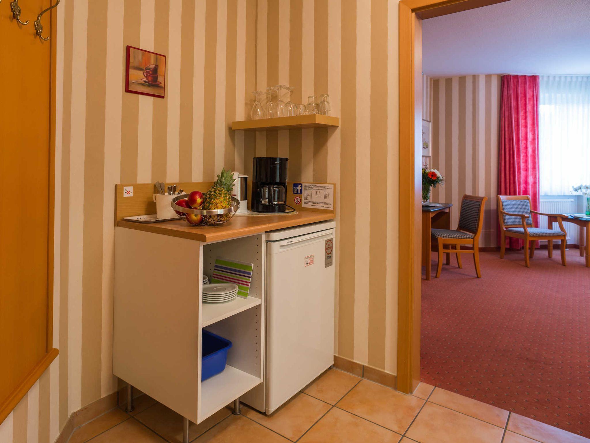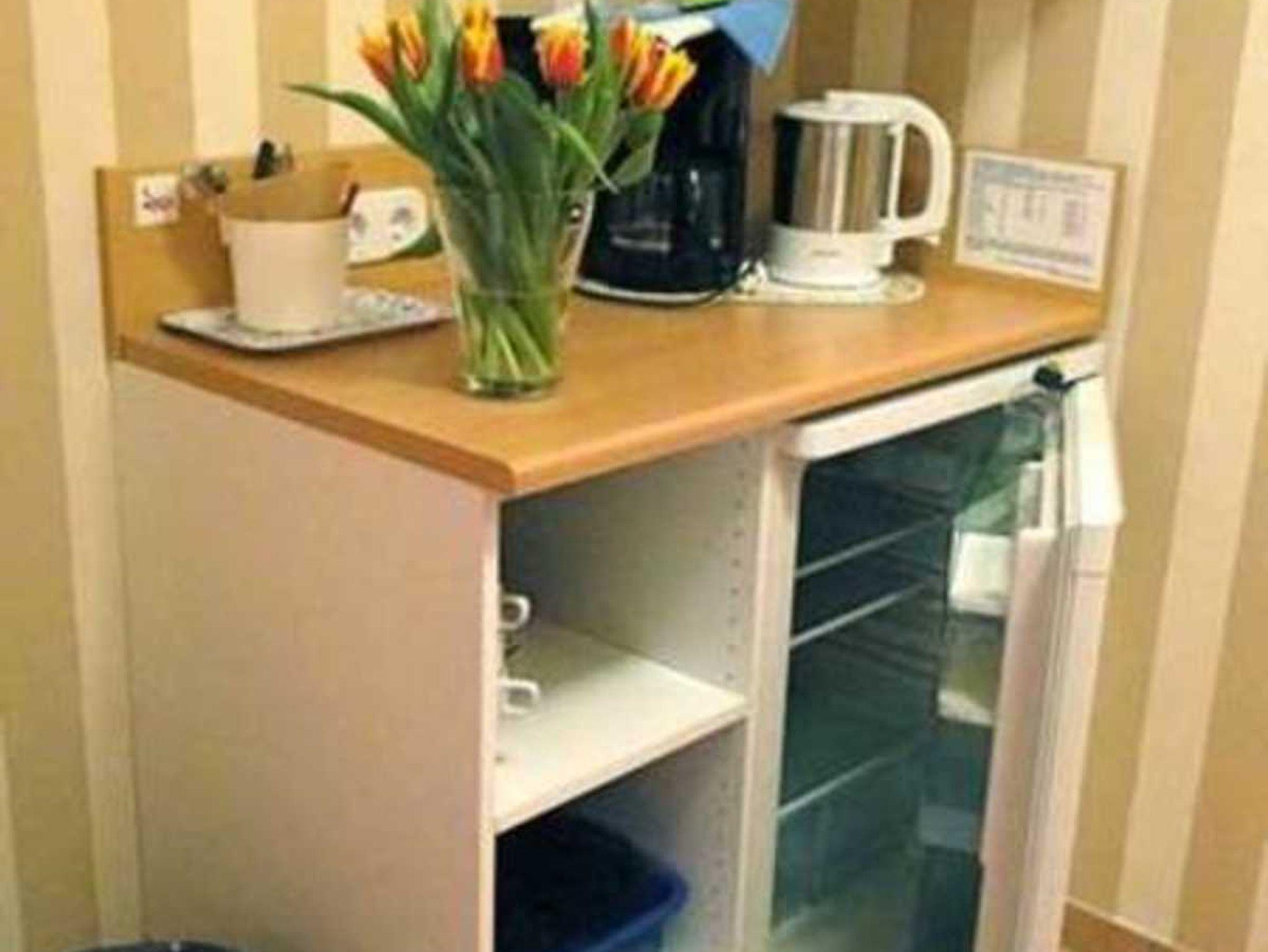 • Küchenblock mit Kühlschrank, Kaffeemaschine, Wasserkocher, Geschirr und Besteck u.v.m.; keine Kochmöglichkeit