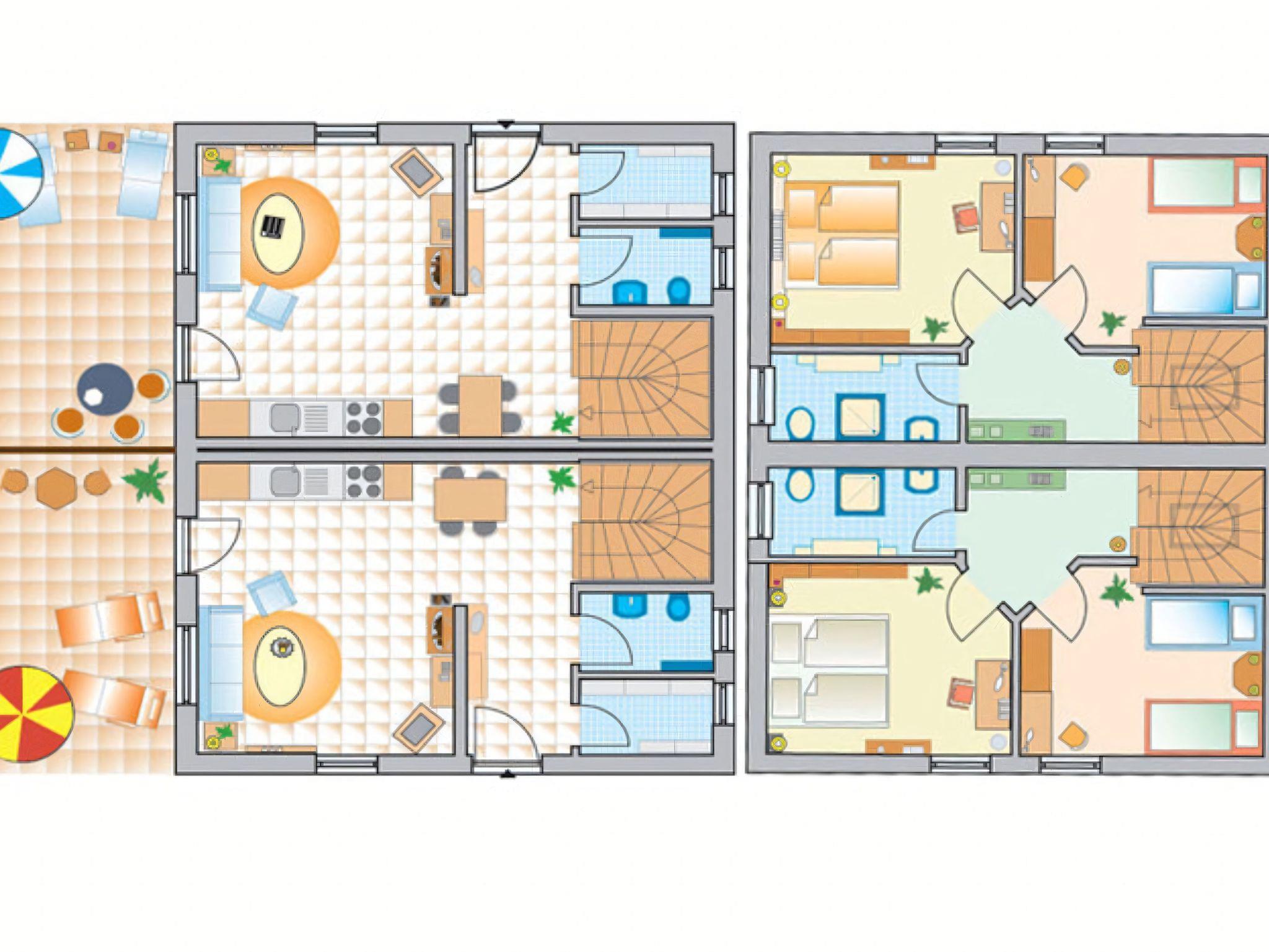 Das Ferienhaus weist 2 Doppelhaushälften mit je 62qm Wohnfläche über 2 Etagen und eigenem Eingang auf. Pro Wohneinheit finden 4 Erwachsene und 1 Kleinkind bis 2 Jahre Platz, mit Aufbettungsmöglichkeit für 2 Personen im Wohnzimmer.