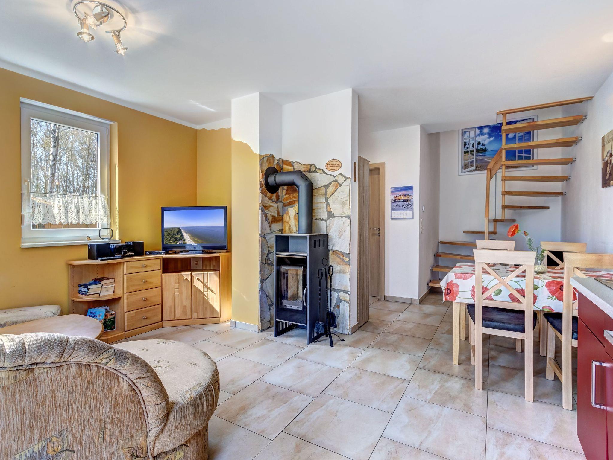 Das Wohnzimmer ist mit einer gemütlichen Schlafcouch, einem Kaminofen und TV ausgestattet.