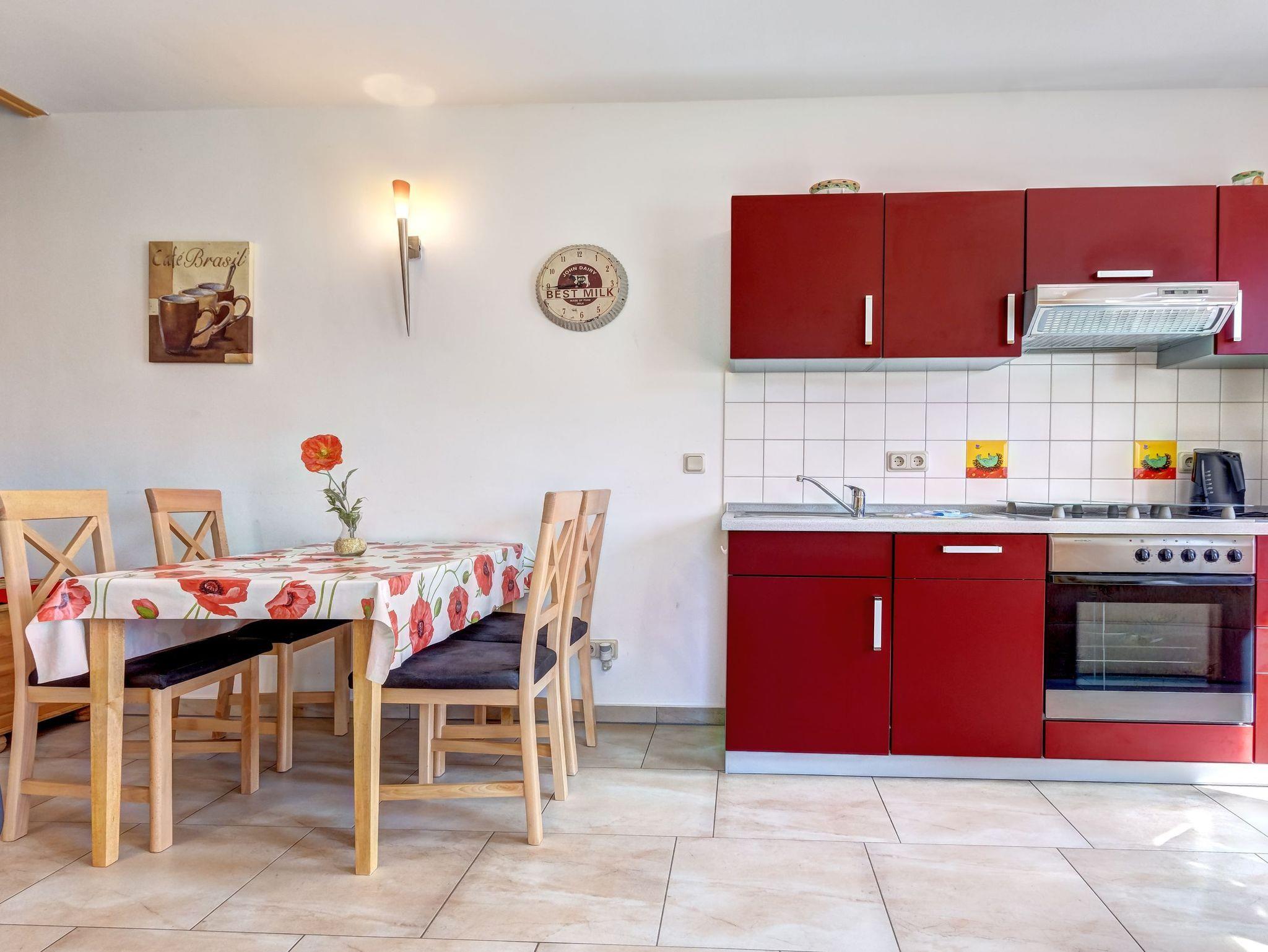 In der offenen Küchenzeile ist ein Geschirrspüler, ein Herd mit Backofen, eine Kühl-/Gefrierkombi und eine Mikrowelle integriert.