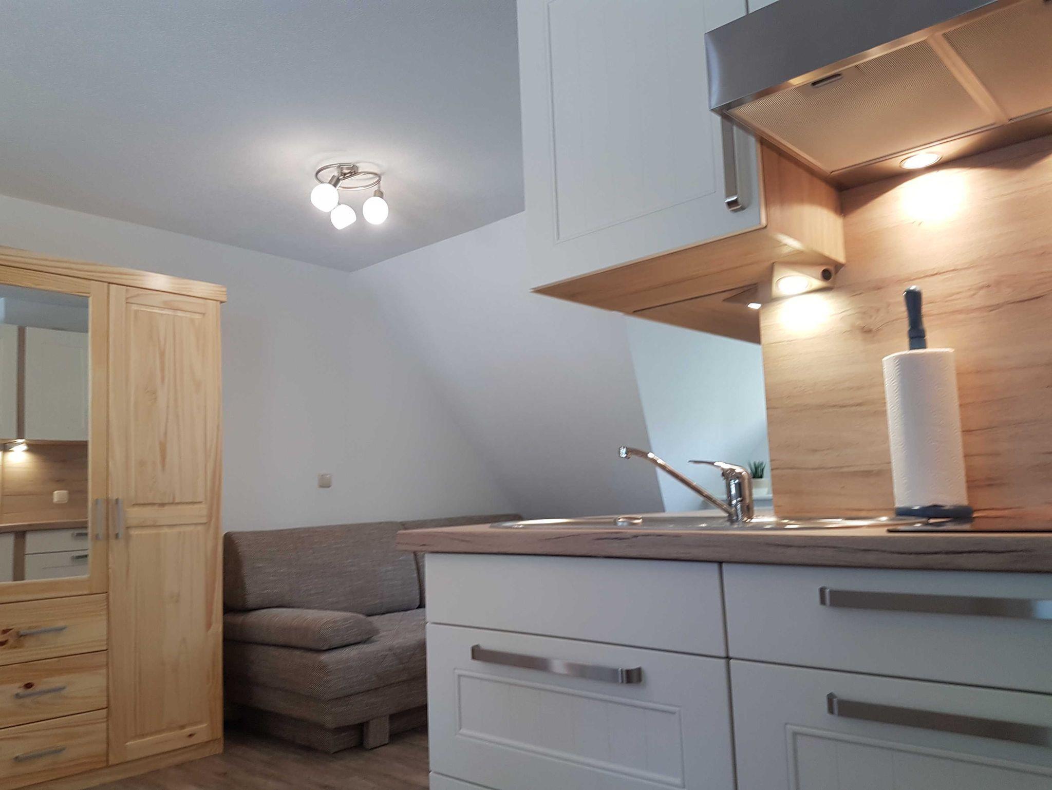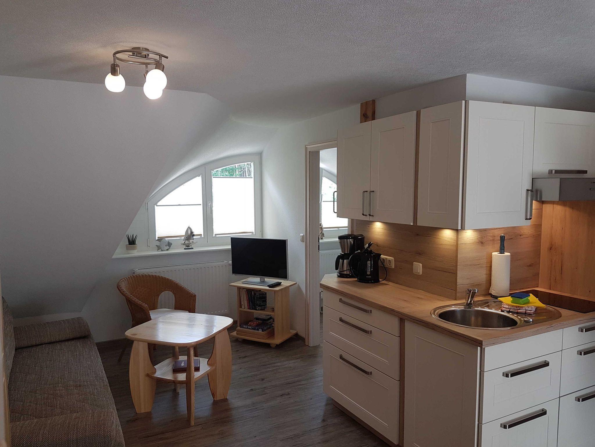 Die OG-Fewo besteht aus Wohn-, Schlaf- und Küchenbereich,Bad sowie einem geräumigen Schlafboden.Zum Wohnbereich gehören Couch, - tisch, Radio/TV. Zum Küchenbereich Winkelküche mit u.a.Herd incl.Backofen,Kühlschrank mit Gefrierfach, Essecke, Geschirr. Der Schlafbereich ist durch kleinen Raumteiler vom Wohnbereich getrennt u. besteht aus Doppelbett, Schrank u.Leiter zum Schlafboden. Auf dem Schlafboden gibt es ein Doppelbett. Es gibt eingeräumiges Bad mit Dusche, WC, Waschtisch, Fön. Zur Fewo gehören Terrasse, Holzkohlegrill, Parkplatz.