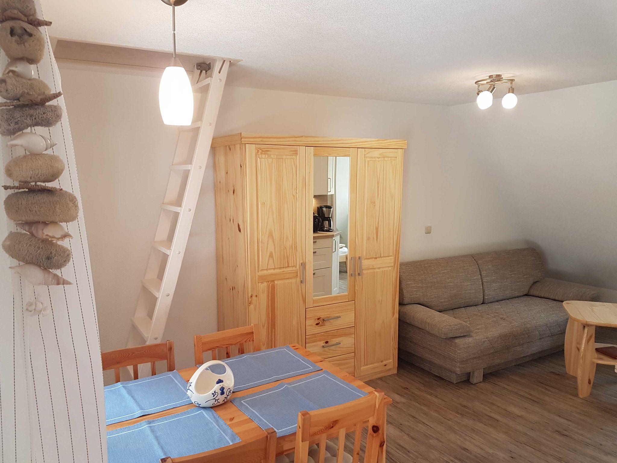 Der Wohnbereich mit Einbauküche ist mit Doppelbettcouch, TV/Radio, Couchtisch, Rattansessel u. Essecke ausgestattet, Schlafzimmer mit Doppelbett u. der Schlafboden ist über eine Raumspartreppe zu erreichen, dort befinden sich zwei Einzelbetten. Zur Küche gehören u.a.Kompakt-Backofen mit Mikrowelle, Kühlschrank mit Gefrierfach, Geschirr. Zum Bad gehört Dusche,WC u.Waschtisch, Fön. Zur Fewo gehören Terrasse, Balkon, Holzkohlegrill und Parkplatz.