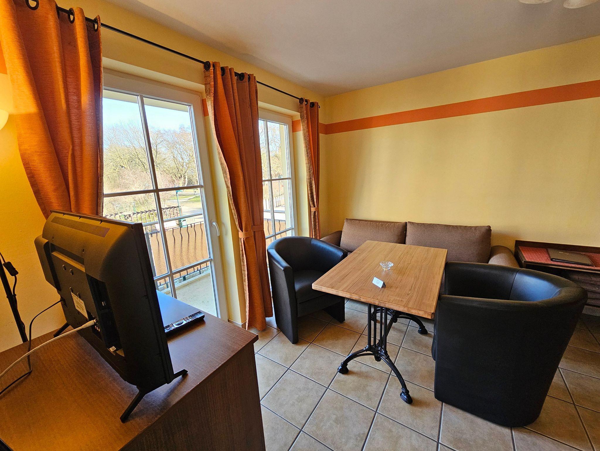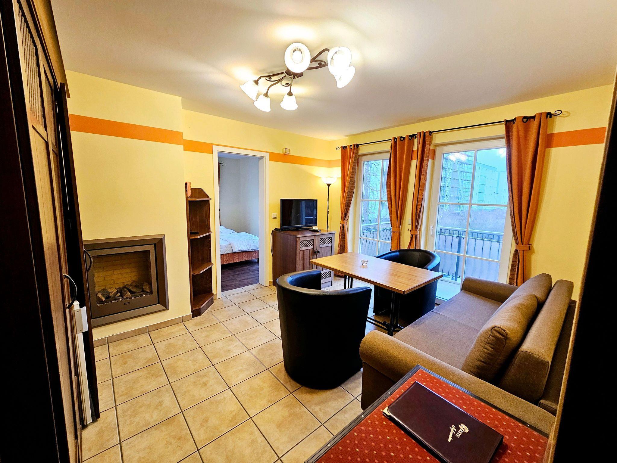 Das attraktive Ferienappartement im 1.OG besteht aus einem Schlaf- und einem Wohnraum mit Kamin und Balkon. Vom Balkon hat man teilweise einen Blick auf die Ostsee. Die Küche ist ausgestattet mit Geschirrspüler, Herd mit Ceranfeld, Mikrowelle mit Grill- und Backfunktion, Kühlschrank, Toaster und Kaffeemaschine. Im Wohnraum befindet sich ein Mediencenter mit SAT-TV, Radio und DVD-Spieler. Sie können die Mahlzeiten entweder im Restaurant im EG oder auf dem eigenen Balkon genießen. Neben dem Doppelbett im Schlafzimmer kann die Schlafcouch im Wohnzimmer zur Aufbettung genutzt werden. Der Boden ist mit Fußbodenheizung ausgestattet und mit Design-Vinyl Bodenbelag oder Fliesen belegt. Vom Balkon haben Sie einen tollen blick auf den Strandvorplatz und die Ostsee!