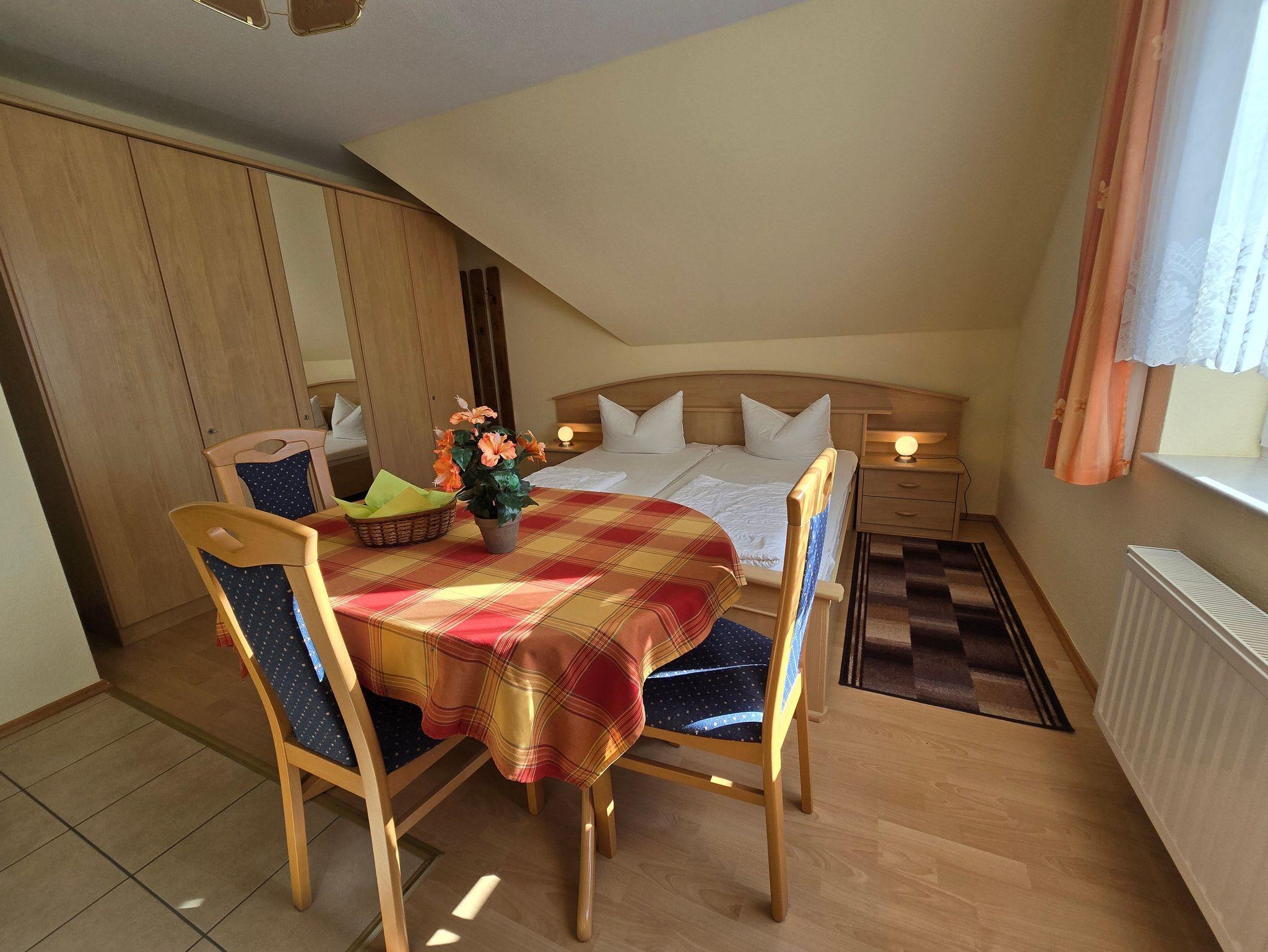 Wohnfläche 33 m², kombinierter Wohn-/ Schlafraum mit Küchenzeile, Farb-TV, Radio (SAT-Anlage), Doppelbett, Aufbettung möglich ( telefon.Anfrage erforderlich ), Bad mit Dusche und WC, Stellplätze für PKW und Fahrräder auf dem Grundstück des Einfamilienhauses mit Ferienwohnungen.