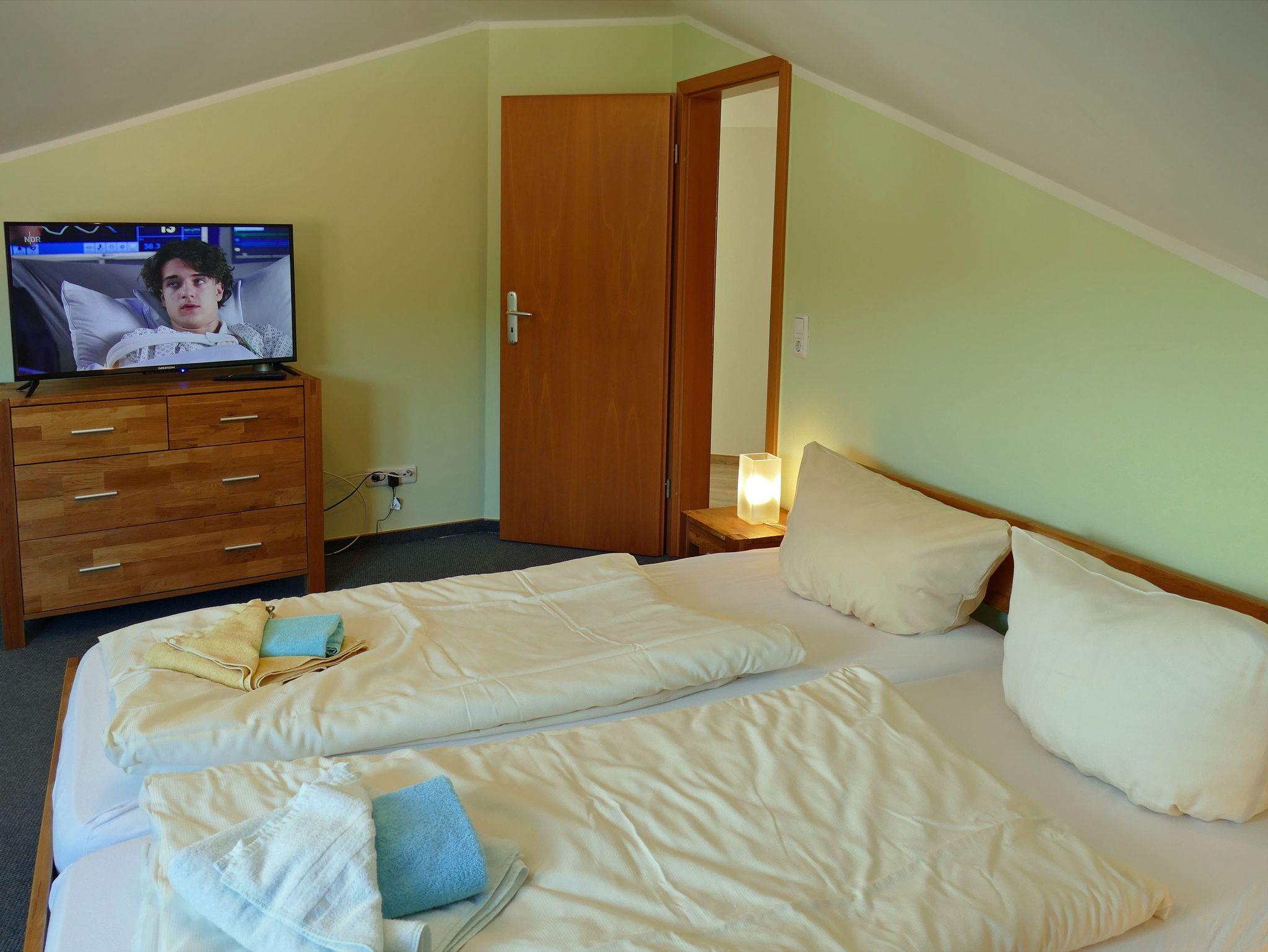 Drei der vier Schlafzimmer sind mit Doppelbetten (2 x 90/200), bzw. Einzelbetten (90/200) und Schrank ausgestattet. Das vierte Zimmer ist mit einem französisches Bett (140/200) ausgestattet. Zwei der Schlafzimmer verfügen jeweils über einen weiteren Fernseher.