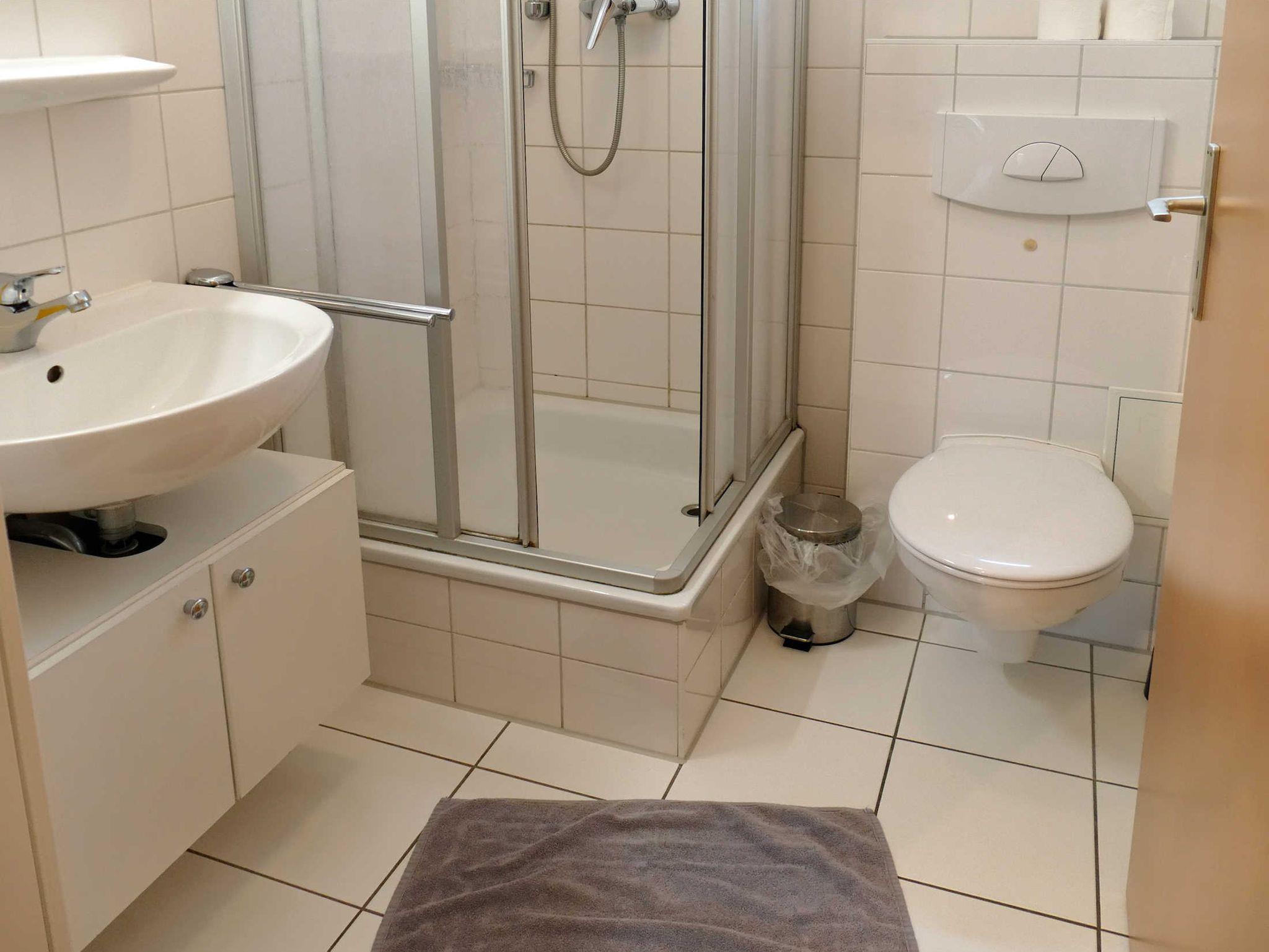 Im Bad befindet sich eine Badewanne mit Duschvorhang, ein Waschtisch und ein WC.