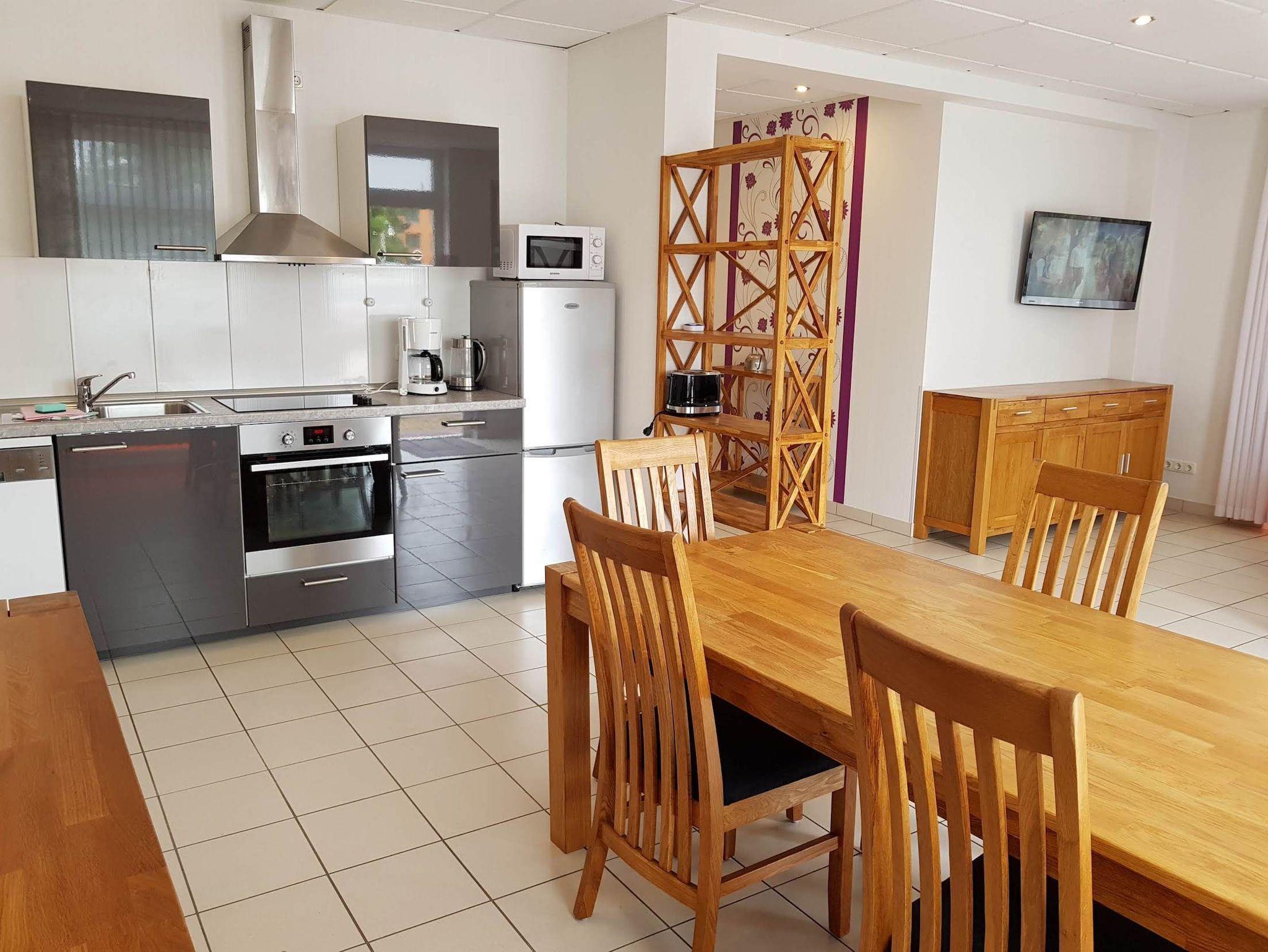 Die offene Küche bietet alles, was Sie für die Zubereitung Ihrer Lieblingsgerichte benötigen: ausreichend Geschirr, eine Spülmaschine, einen Kühlschrank mit Gefrierfach, einen Backofen mit Herd sowie eine Kaffeemaschine und viele weitere praktische Küchenutensilien. Am Esstisch finden bis zu sechs Personen bequem Platz, ideal für gesellige Mahlzeiten.