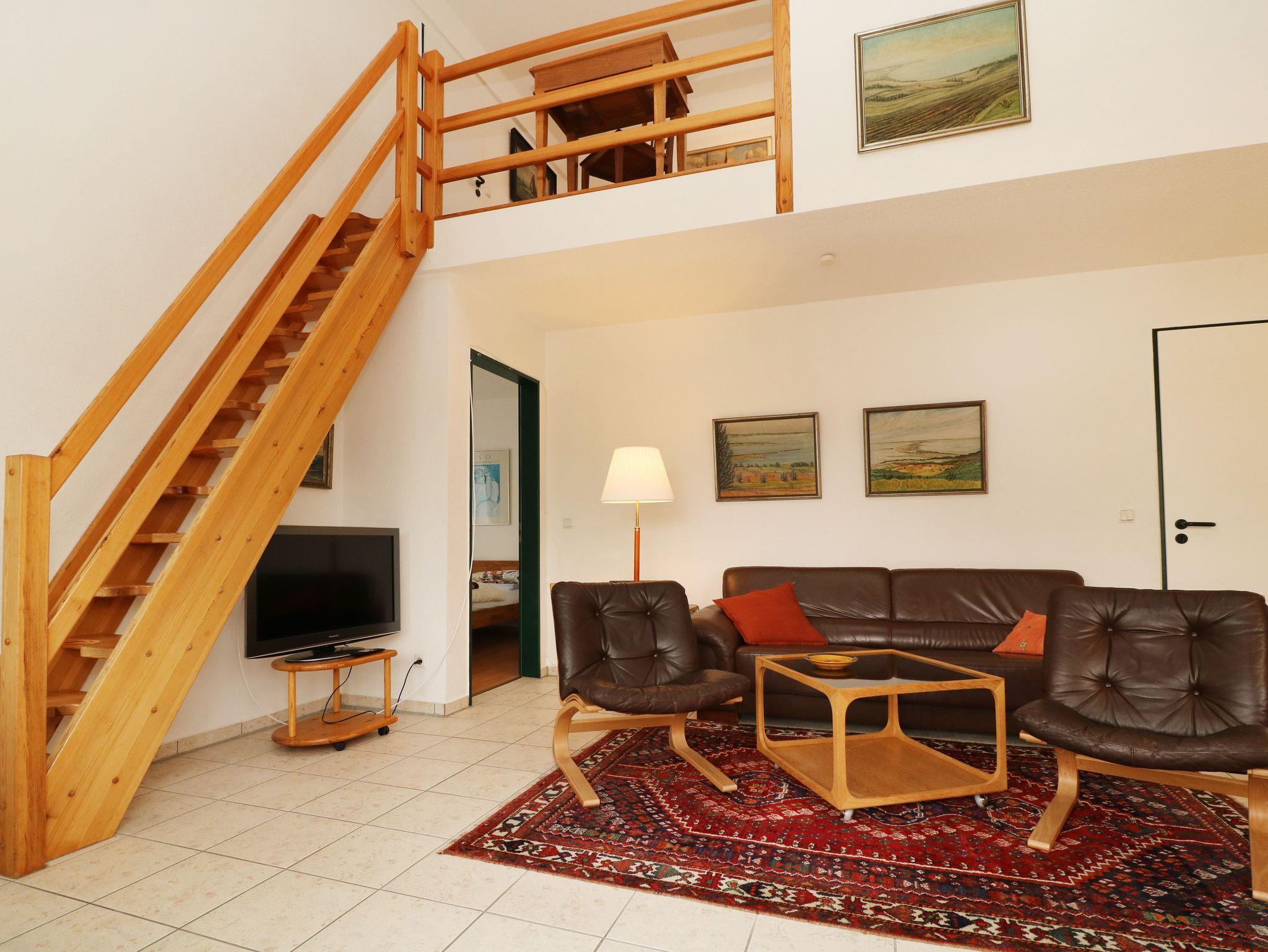 • Geräumiger Wohnbereich: Der große helle Wohnraum ist mit einer Leder-Sofa- /Sesselgarnitur und einem Fernseher ausgestattet. Darüber hinaus steht ein Essplatz mit 6 Stühlen zu Verfügung. Von hier aus haben Sie Zugang zur Galerie, welche zusätzlichen Raum für Entspannung und Spielmöglichkeiten bietet. Die Galerie (mit Brüstung) und der 2. Schlafraum sind über eine praktische Raumspartreppe erreichbar.