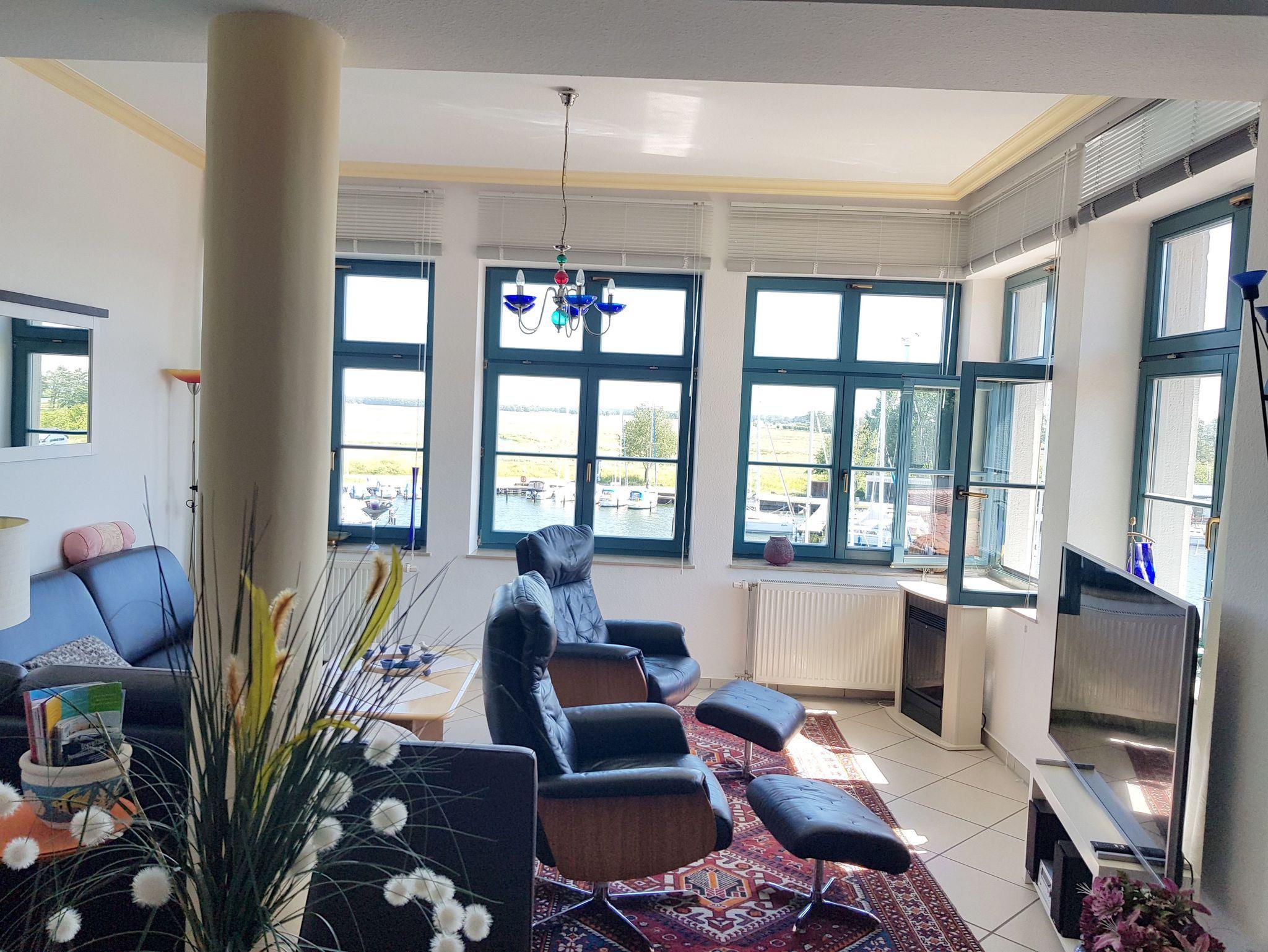 Wohnen direkt am Wasser mit traumhafter Aussicht - in unserer komfortablen und sonnigen Ferienwohnung Yachthafenidyll in direkter Wasserlage am idyllischen Hafen von Karlshagen genießen Sie einen erholsamen Urlaub. Die helle und großzügige 3-Raum-Wohnung (im 2. OG über Eck) verfügt über einen herrlichen Panoramablick auf den Segelhafen und die unbebauten Peenewiesen von allen Räumen (8 große Fenster) und ist somit ideal für alle, die Ruhe schätzen und die Natur genießen wollen. Aufgrund der günstigen Lage gibt es in die Wohnung keinerlei Einsicht, so dass Sie Ihren Aufenthalt ganz ungestört genießen können. Ein großer 58'' LCD-Fernseher mit Ambilight LED-Hintergrundbeleuchtung sorgt für ein ausgezeichnetes Fernseherlebnis. Mit der Smart-TV Funktion greifen Sie auch auf die Mediatheken und Inhalte aus dem Internet zu. Zwei Relaxsessel mit Fußstützen stehen für Sie bereit.