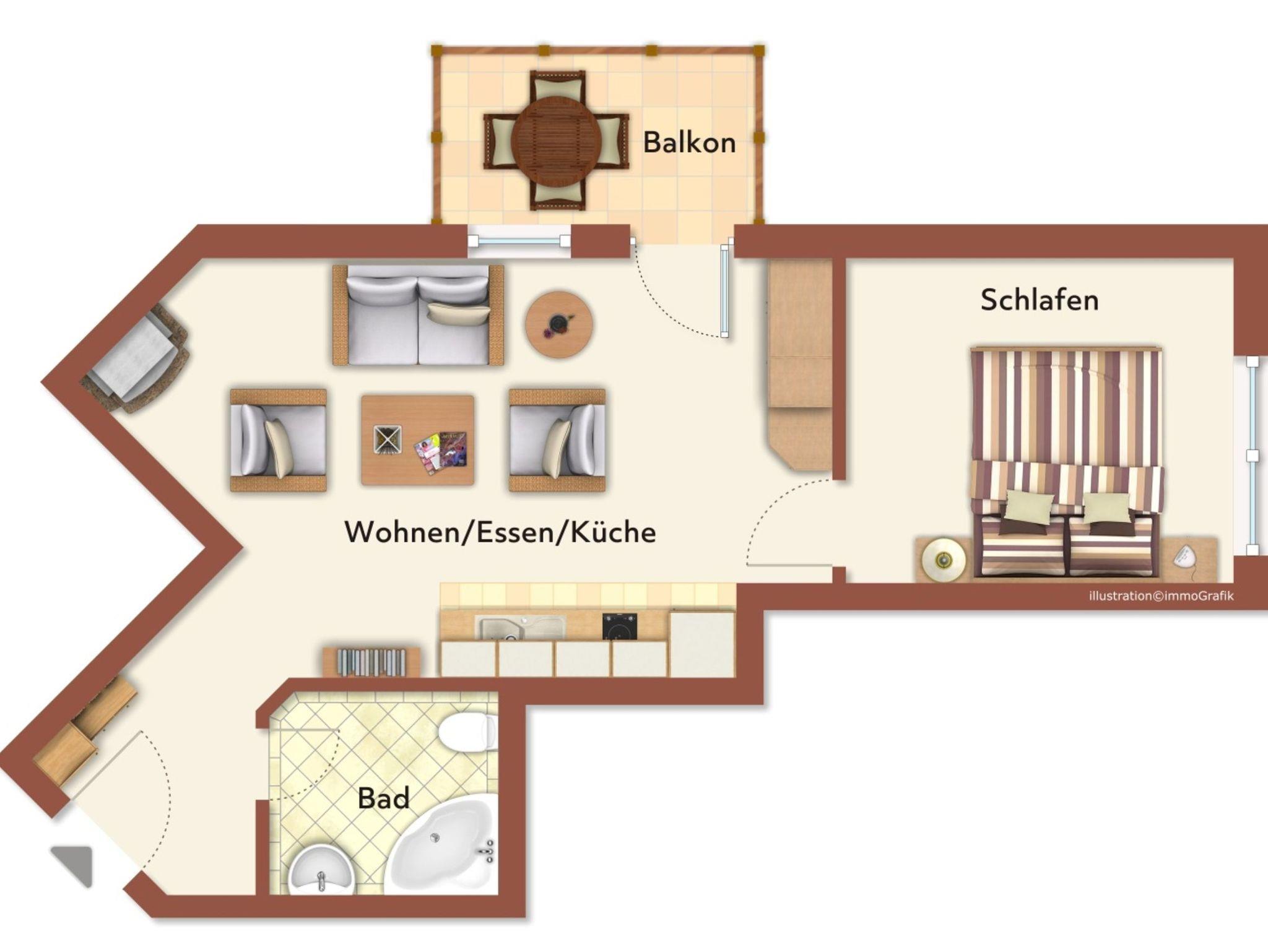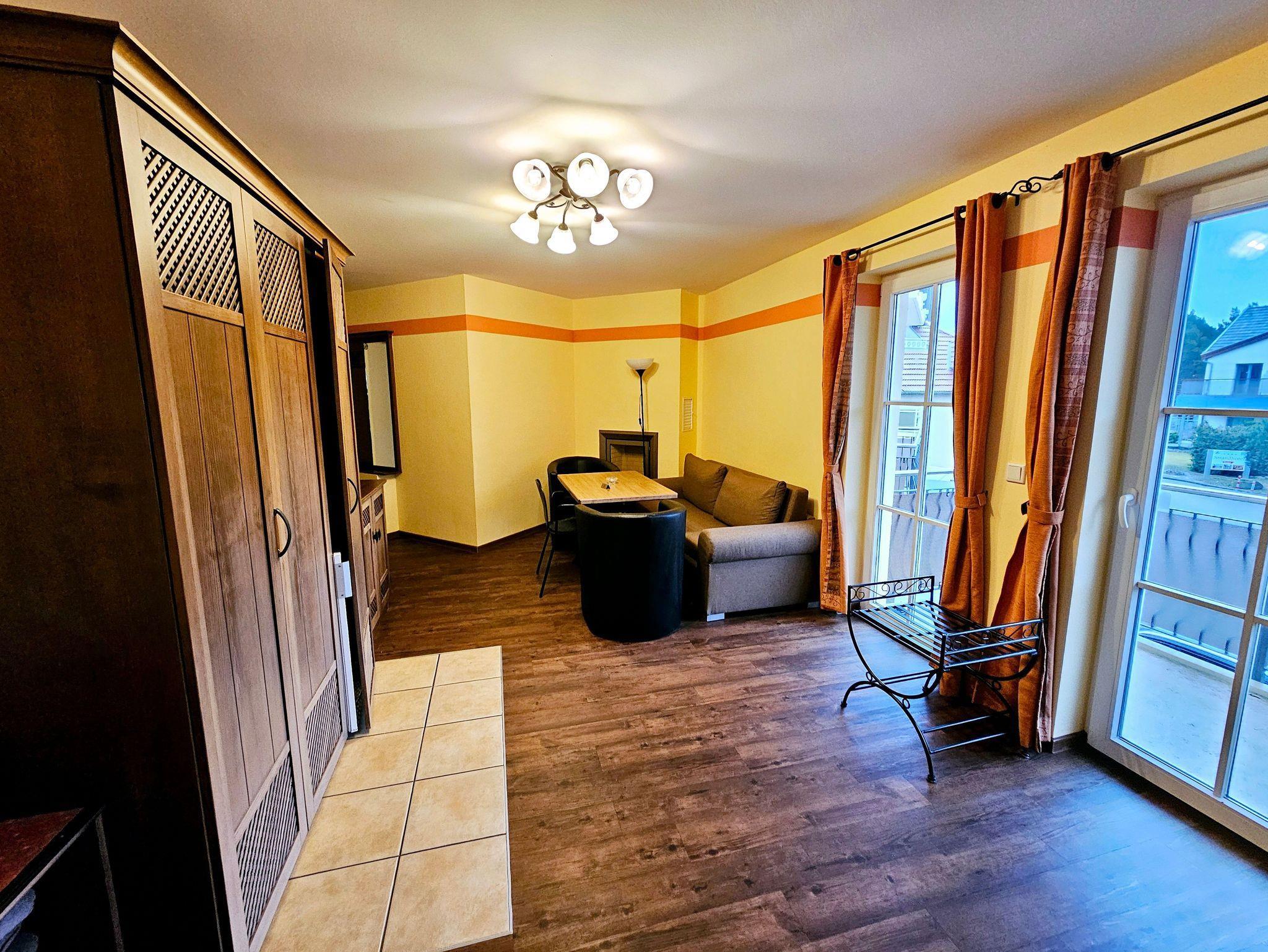 Das attraktive Ferienappartement im 1.OG besteht aus einem Schlaf- und einem Wohnraum mit Kamin und Balkon. Die Küche ist ausgestattet mit Geschirrspüler, Herd mit Ceranfeld, Mikrowelle mit Grill- und Backfunktion, Kühlschrank, Toaster und Kaffeemaschine. Im Wohnraum befindet sich ein Mediencenter mit SAT-TV, Radio und DVD-Spieler. Sie können die Mahlzeiten entweder im Restaurant im EG oder auf dem eigenen Balkon genießen. Neben dem Doppelbett im Schlafzimmer kann die Schlafcouch im Wohnzimmer zur Aufbettung genutzt werden. Der Boden ist mit Fußbodenheizung ausgestattet und mit Design-Vinyl Bodenbelag oder Fliesen belegt.