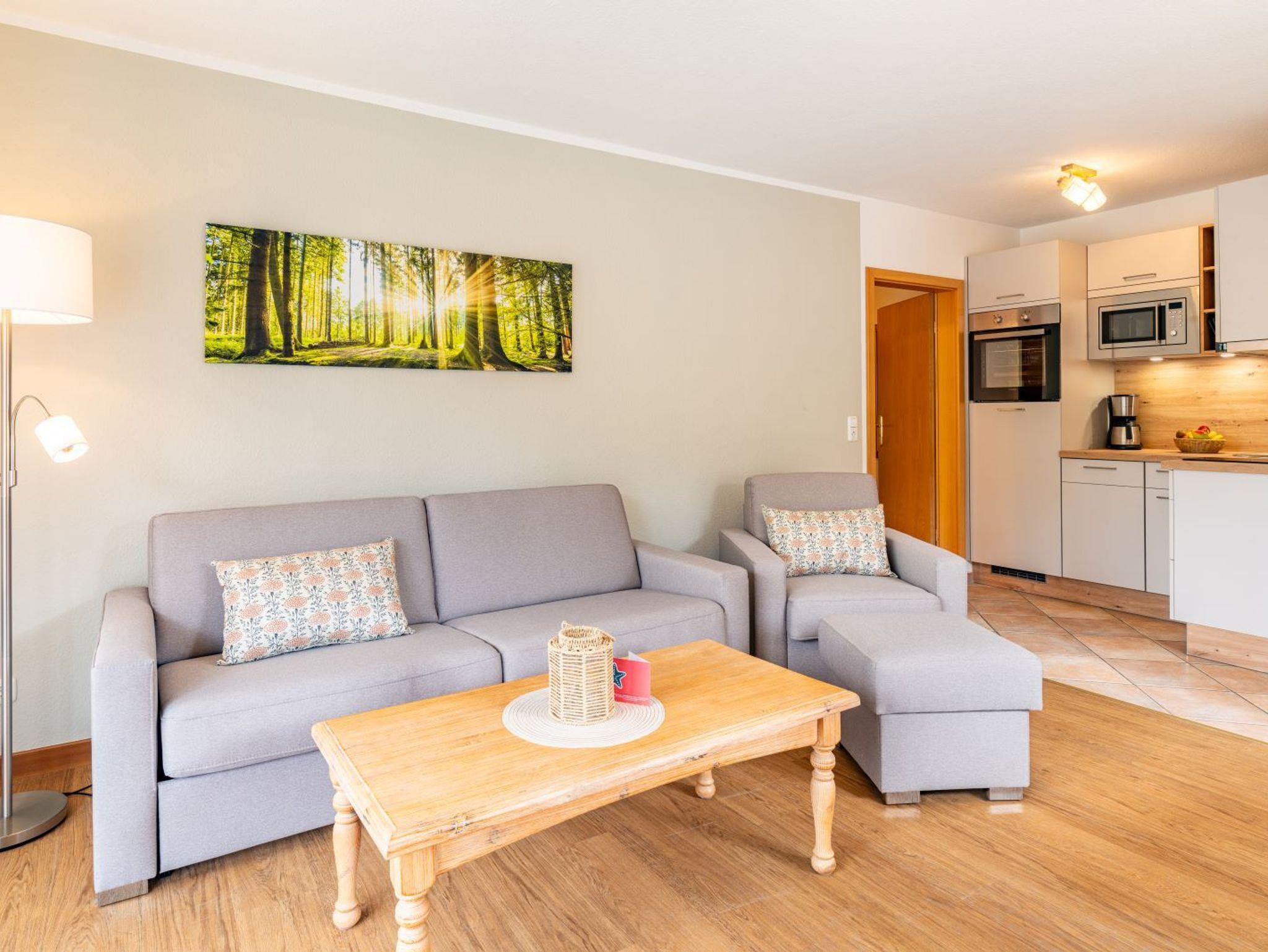 Die Ferienwohnungen am Maiglöckchenberg, Typ 1/2 sind gemütlich eingerichtet, 46m² groß und für bis zu 4 Personen ausgelegt (2 Pers. + 2 Aufbettungen). Sie besitzen ein Schlafzimmer, ein Wohnbereich mit einer offenen Küche und ein Badezimmer.