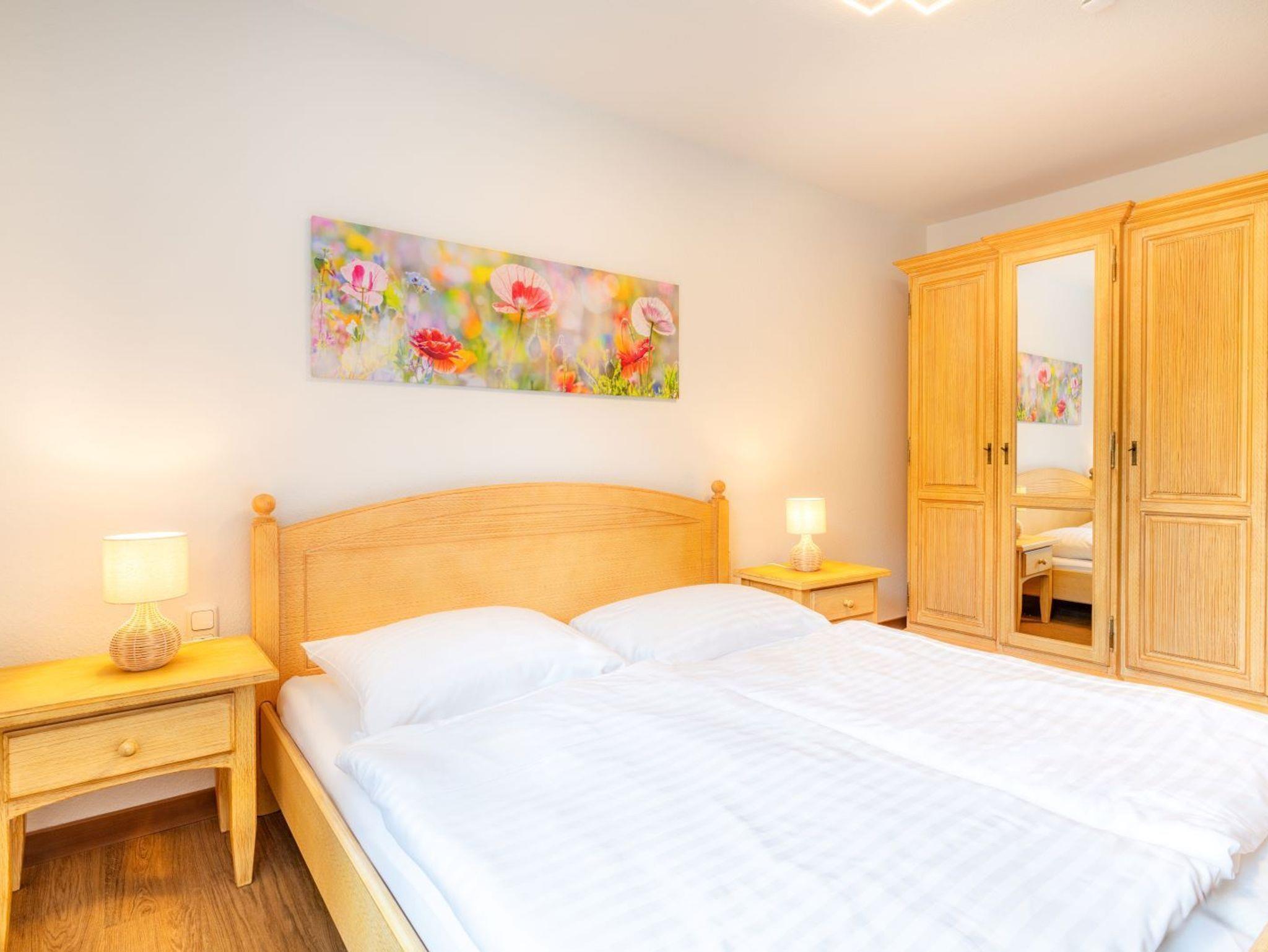 Die Ferienwohnung Klatschmohn präsentiert sich in einem modernen und einladenden Ambiente. Im geräumigen Schlafzimmer erwartet Sie ein gemütliches Doppelbett für erholsame Nächte. Zusätzlich bietet die komfortable Schlafcouch im Wohnbereich Platz für zwei weitere Gäste.