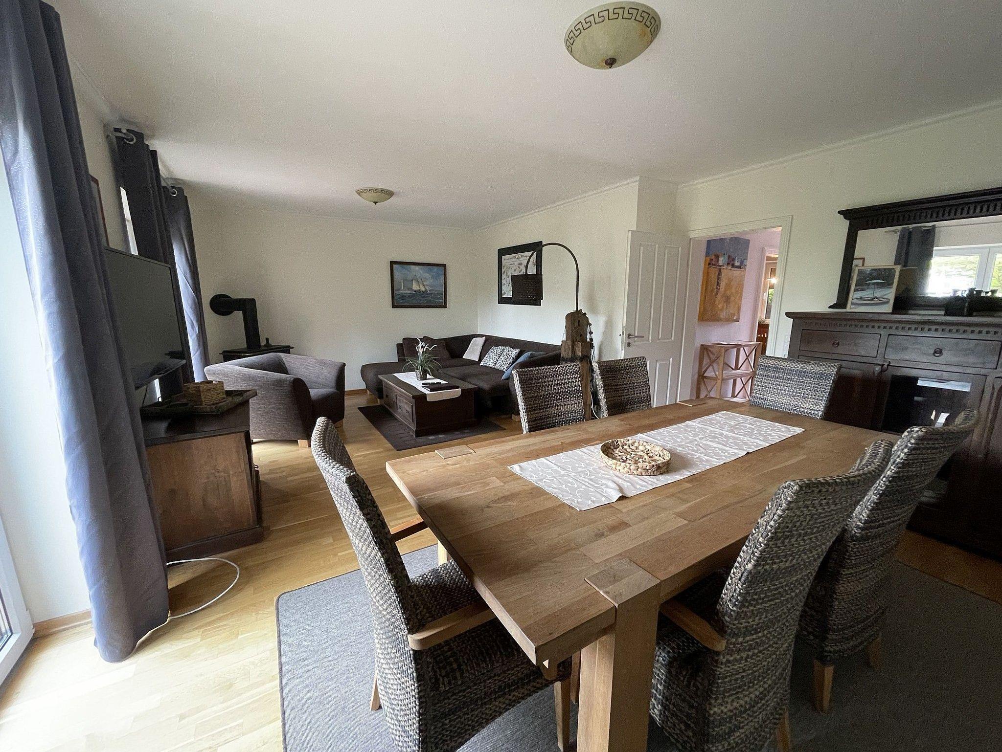 Im großzügigen Wohnzimmer befindet sich ein Esstisch für bis zu sechs Personen. Von hier aus gelangen Sie direkt auf die Terrasse mit einem kleinen Garten ? perfekt für entspannte Stunden im Freien.