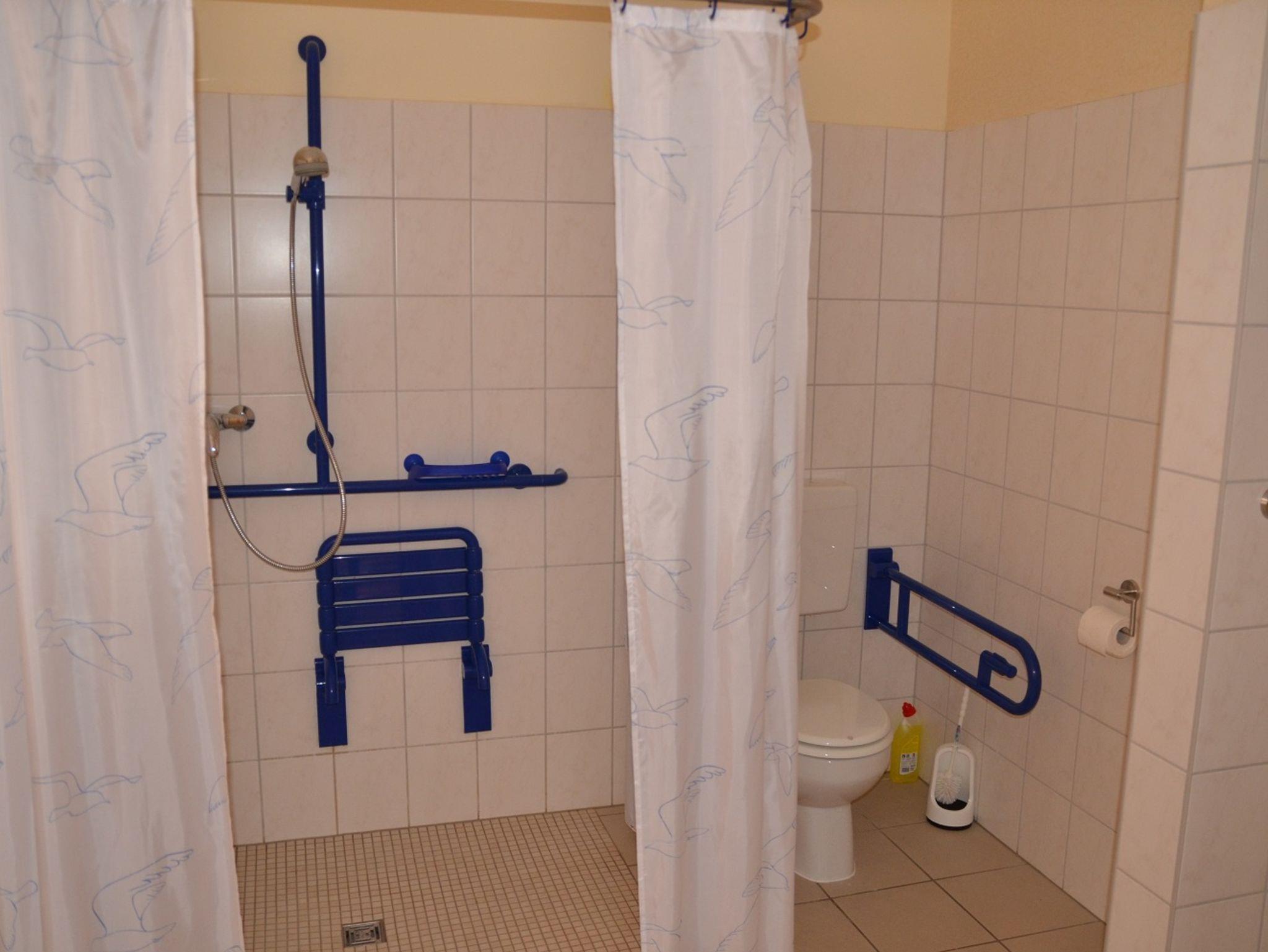 Die Wohnung ist ebenerdig, behindertengerecht begehbar und ausgestattet (siehe Bilder), jedoch ist der Zugang vom Wohnzimmer zur Terrasse nicht behindertengerecht, da eine Stufe vorhanden ist.