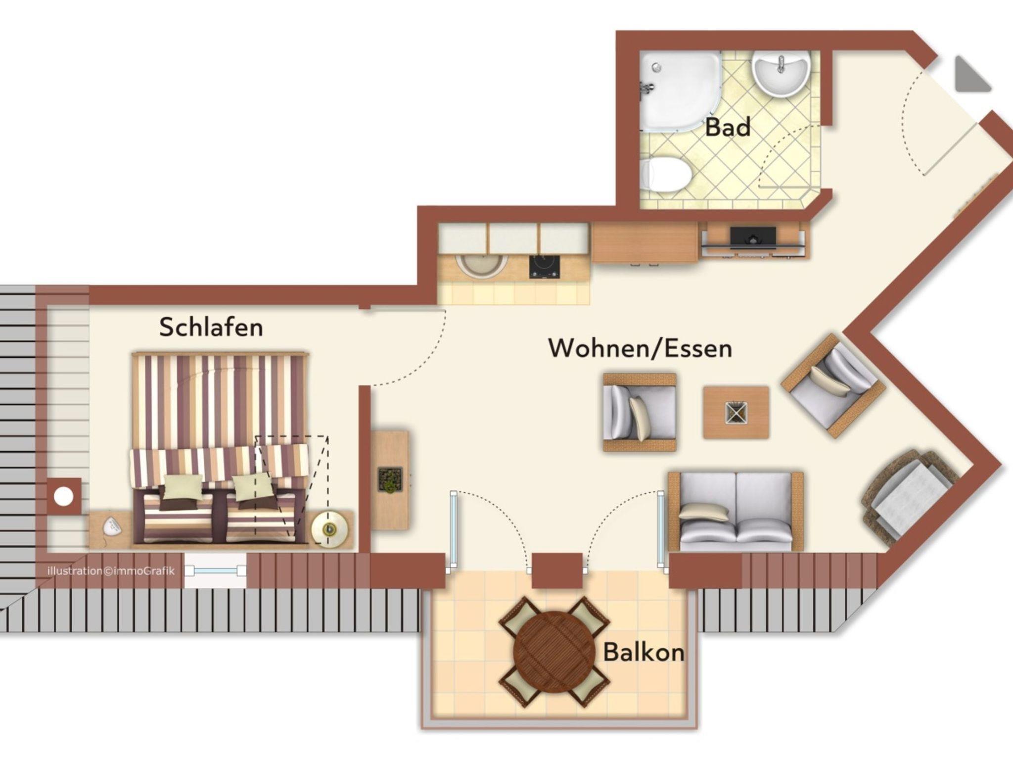 Das attraktive Ferienappartement im 2.OG besteht aus einem Schlaf- und einem Wohnraum mit Kamin und Balkon. Die Küche ist ausgestattet mit Geschirrspüler, Herd mit Ceranfeld, Mikrowelle mit Grill- und Backfunktion, Kühlschrank, Toaster und Kaffeemaschine. Im Wohnraum befindet sich ein Mediencenter mit SAT-TV, Radio und DVD-Spieler. Sie können die Mahlzeiten entweder im Restaurant im EG oder auf dem eigenen Balkon genießen. Neben dem Doppelbett im Schlafzimmer kann die Schlafcouch im Wohnzimmer zur Aufbettung genutzt werden. Der Boden ist mit Fußbodenheizung ausgestattet und mit Design-Vinyl Bodenbelag oder Fliesen belegt.