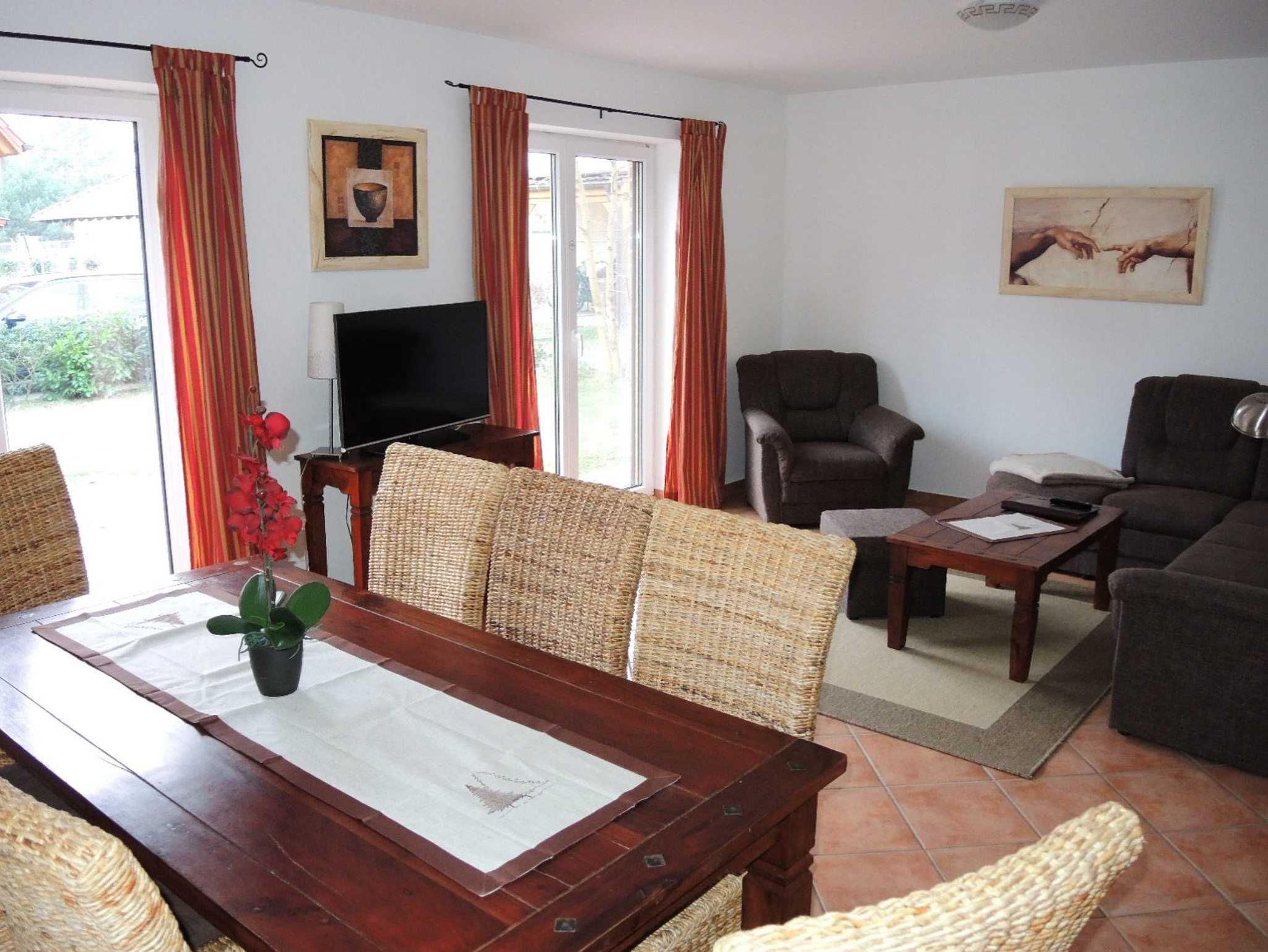 Im großzügigen Wohnzimmer befindet sich ein Esstisch für bis zu sechs Personen. Von hier aus gelangen Sie direkt auf die Terrasse mit einem kleinen Garten ? perfekt für entspannte Stunden im Freien.