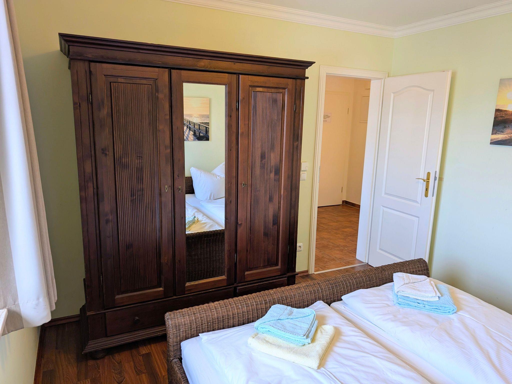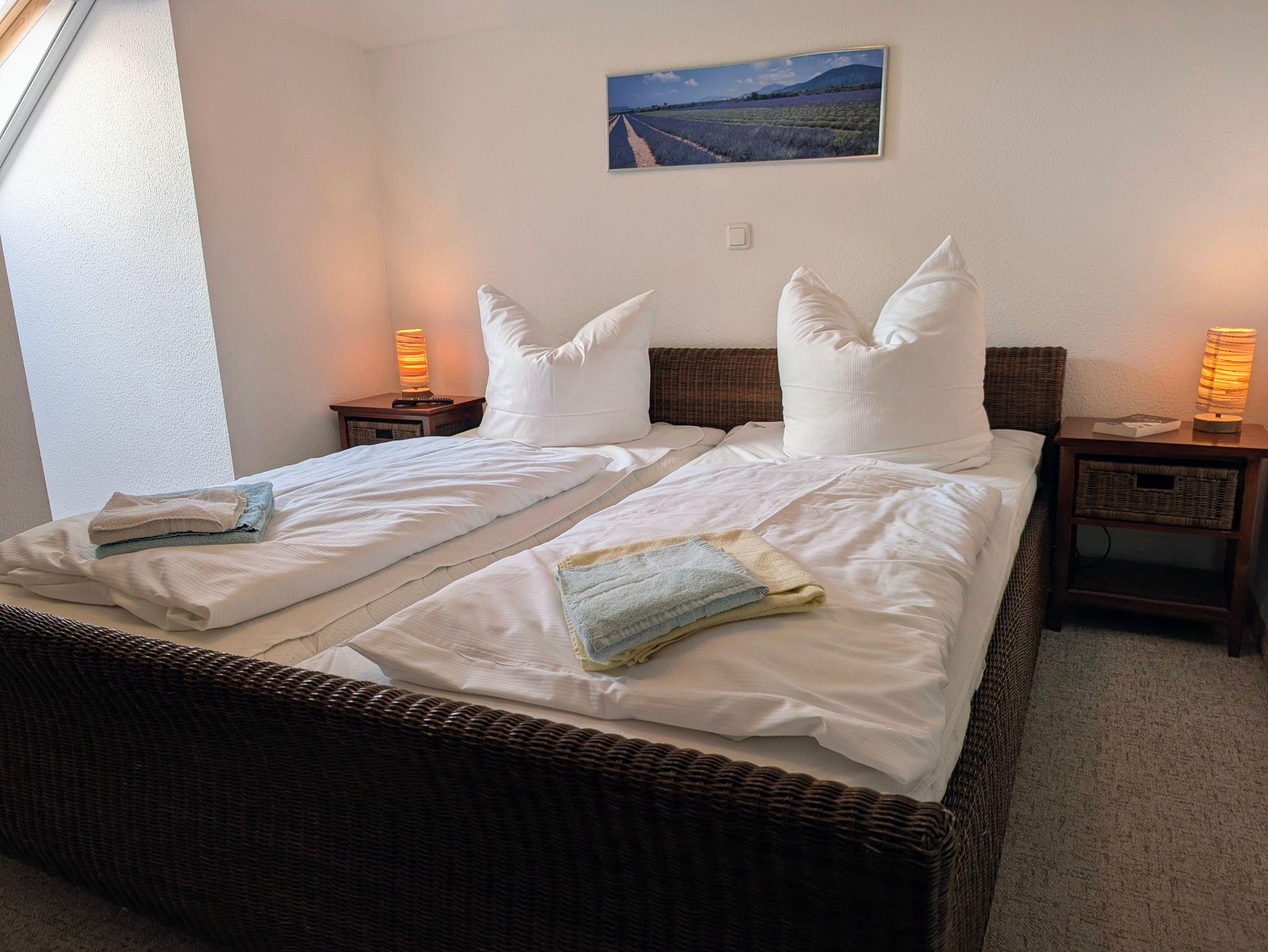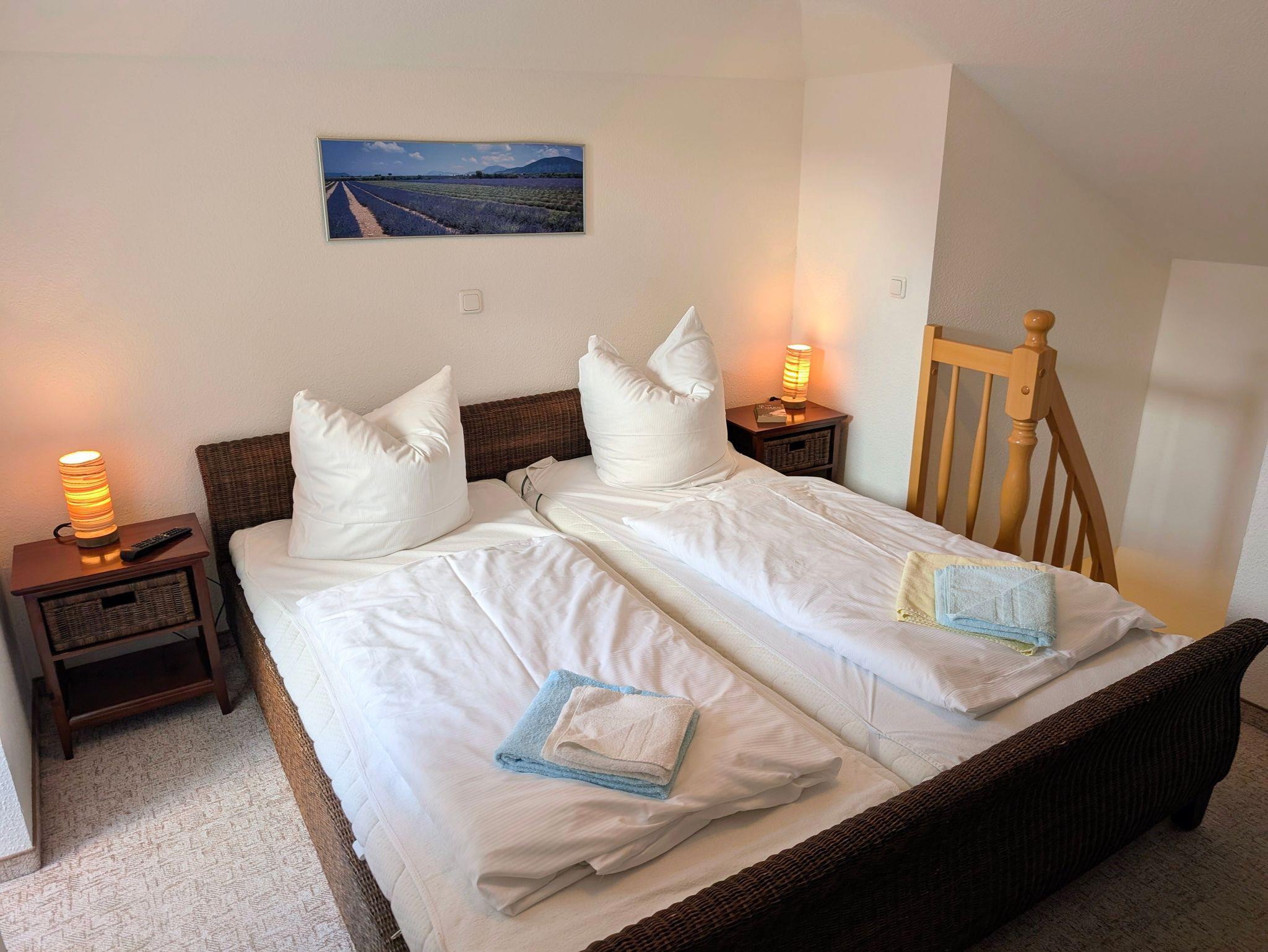 Das Schlafzimmer verfügt über ein komfortables Doppelbett (2 × 90/200 cm), zwei Einzelbetten (2 × 90/200 cm) sowie einen geräumigen Kleiderschrank. Eine weitere Schlafmöglichkeit bietet der offene Spitzboden, in dem sich ein weiteres Doppelbett (2 × 90/200 cm) und ein zusätzlicher TV befinden ideal für Familien oder befreundete Paare.