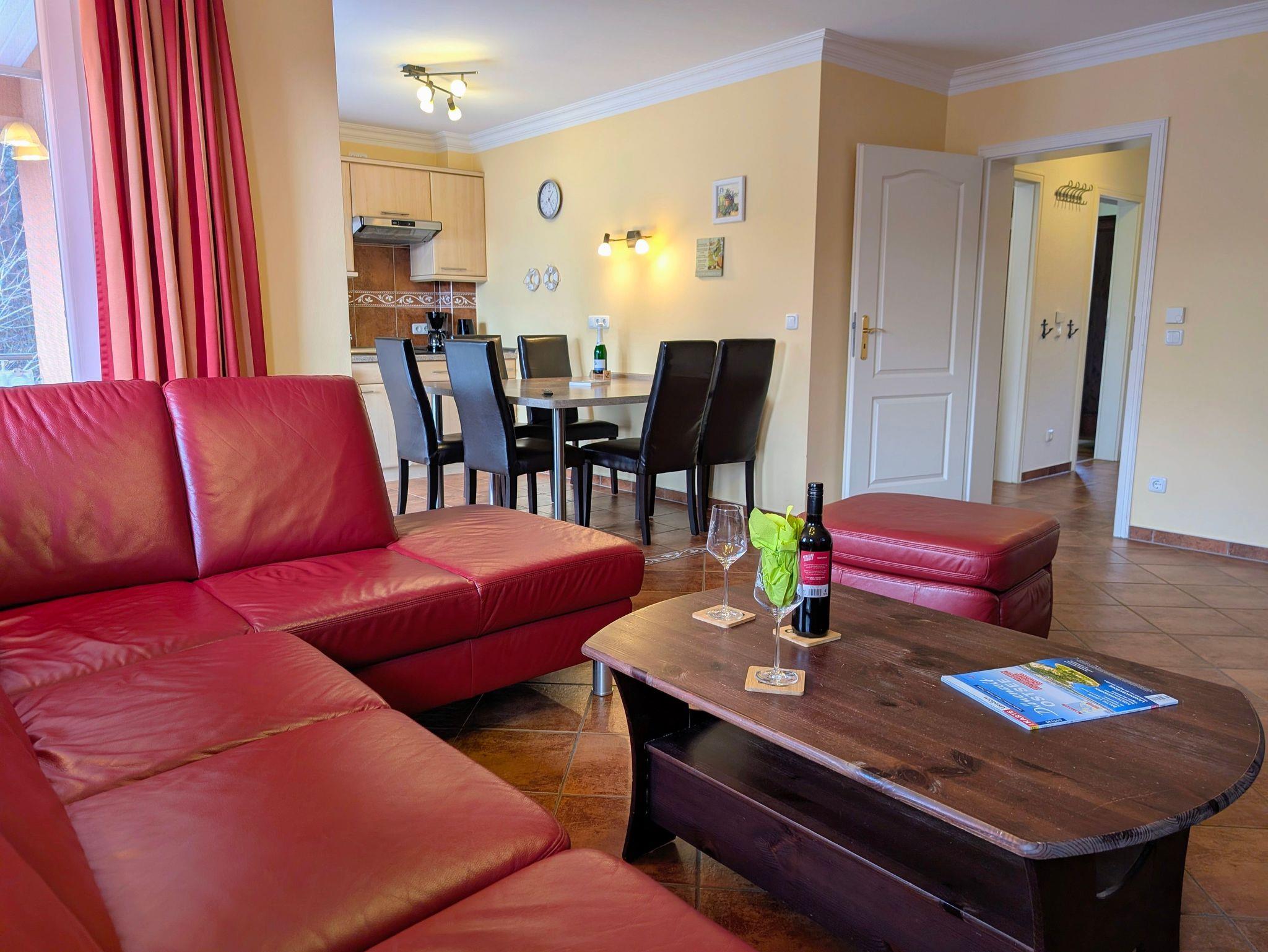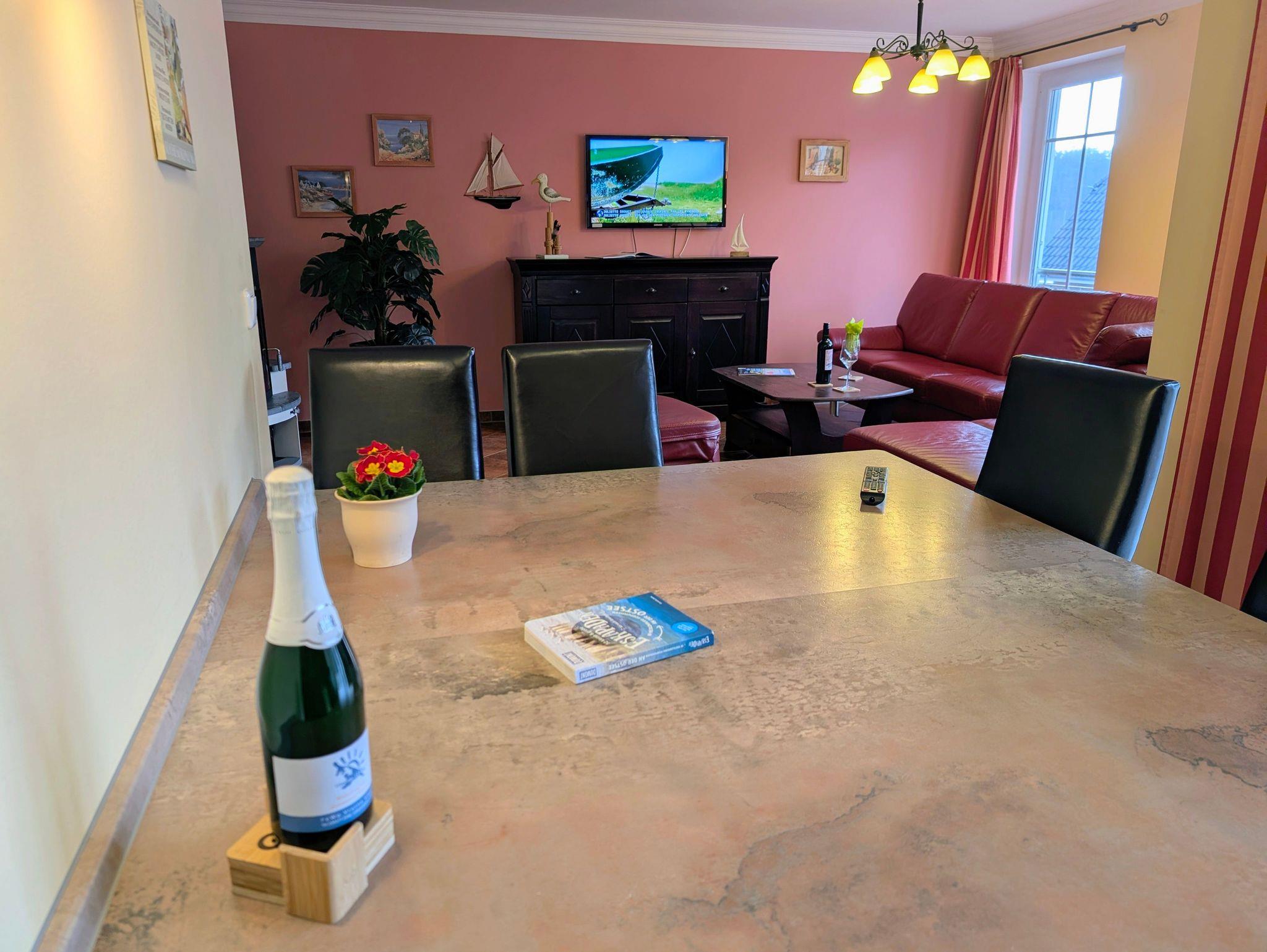 Die großzügige Drei-Raum-Ferienwohnung Waldblick mit etwa 75 m² befindet sich im 1. Obergeschoss des Ferienhauses und bietet viel Platz für einen erholsamen Urlaub. Sie verfügt über eine gut ausgestattete Kochnische, ein modernes Duschbad, einen Balkon, SAT-TV und viele weitere Annehmlichkeiten. Im Wohnbereich laden ein gemütliches Sofa, ein TV-Schrank mit HiFi-Anlage sowie ein Esstisch mit sechs bequemen Stühlen zum Verweilen ein. Besonders in der kühleren Jahreszeit sorgt der Kamin im Wohnzimmer für wohlige Wärme und gemütliche Abende in entspannter Atmosphäre. Durch die große Fensterfront nach Westen gelangen Sie auf den geräumigen Balkon mit Sitzmöbeln für vier Personen der ideale Ort, um den Tag entspannt ausklingen zu lassen.