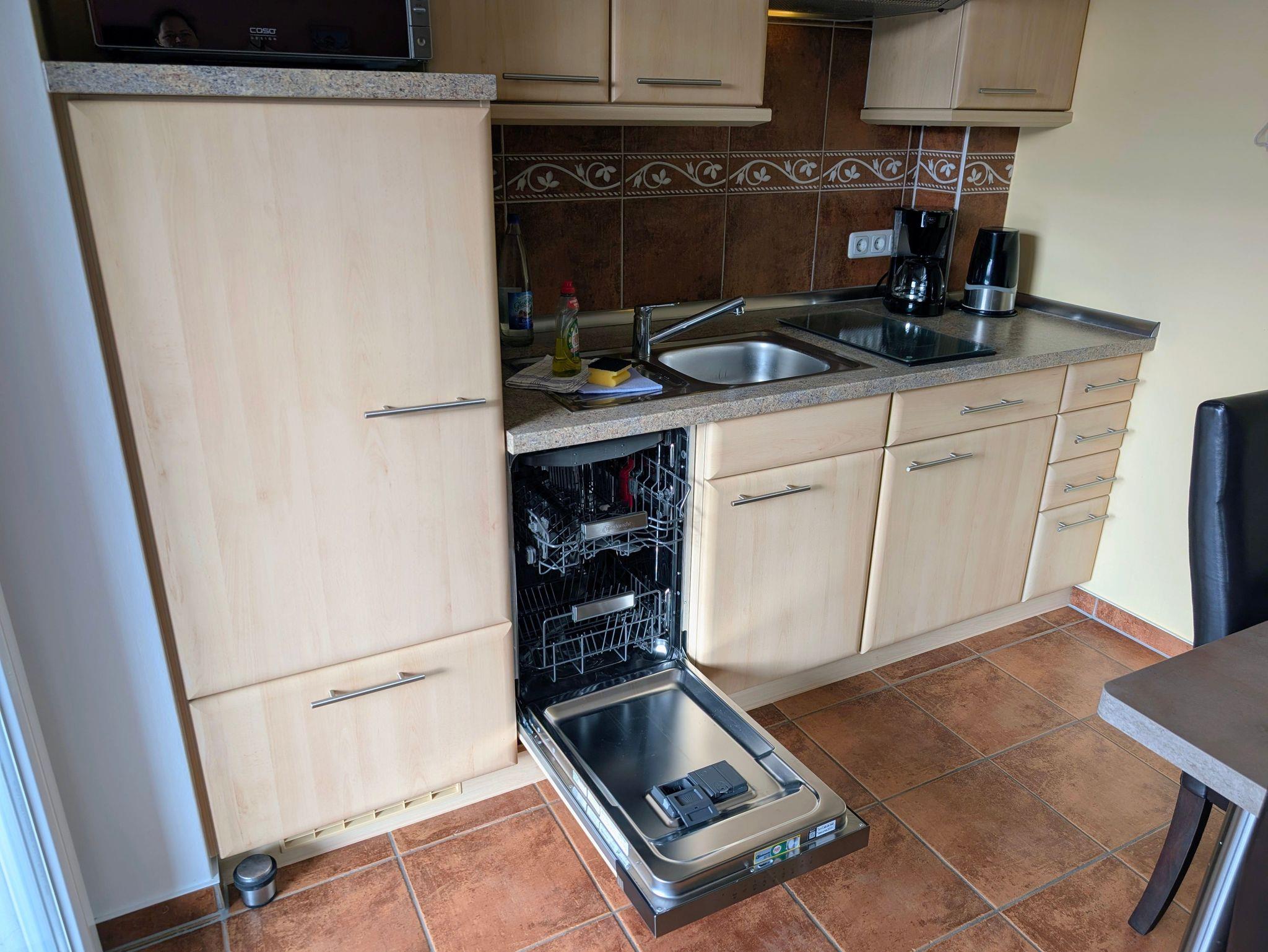 - Küche mit Geschirrspüler, 2-Platten-Herd, Microwelle, Kaffeemaschine, Wasserkocher, Geschirr & Besteck u.v.m.