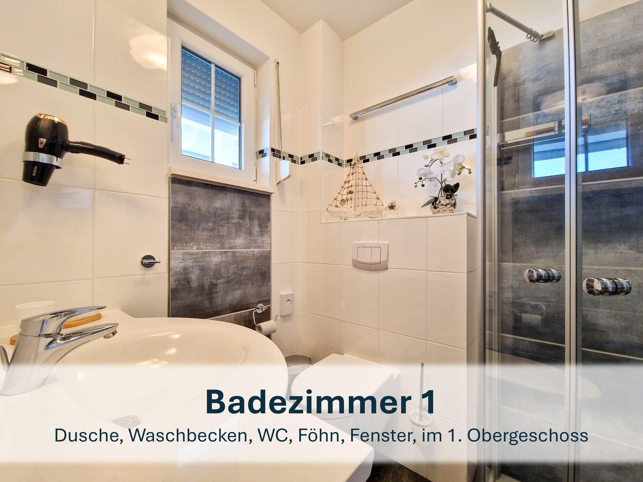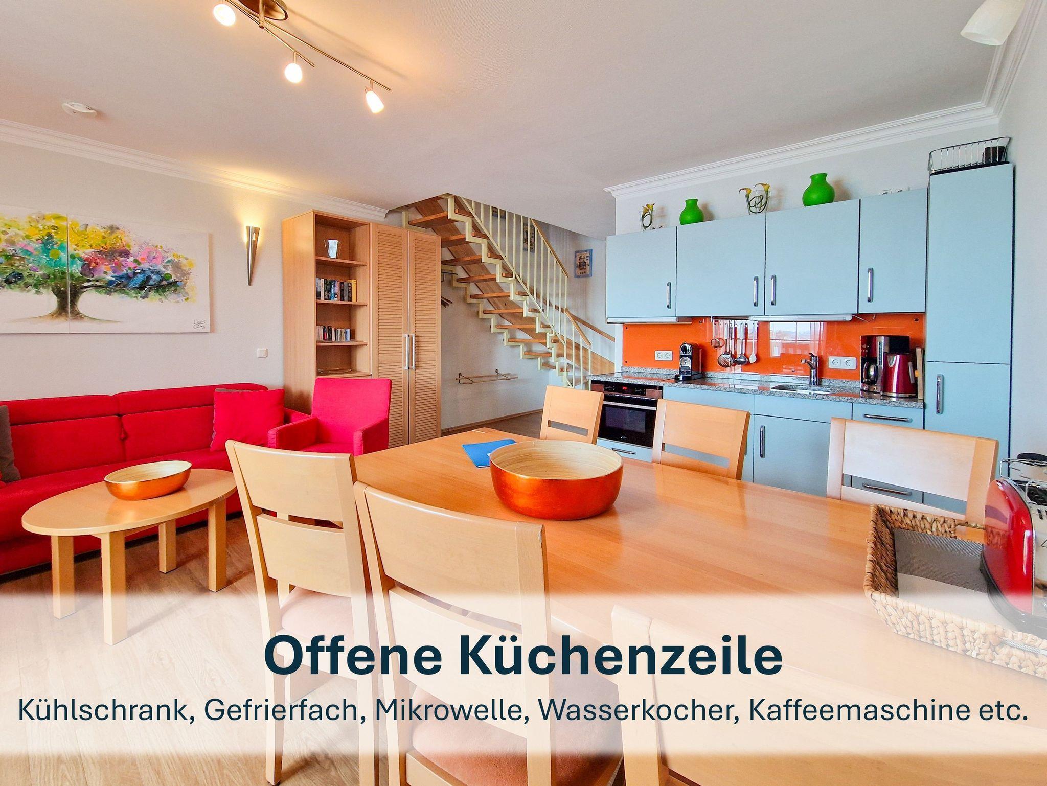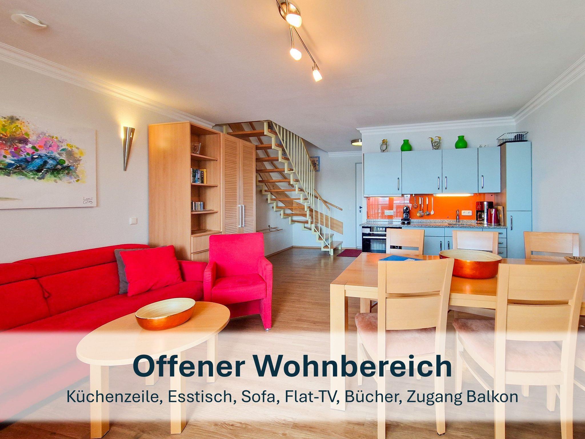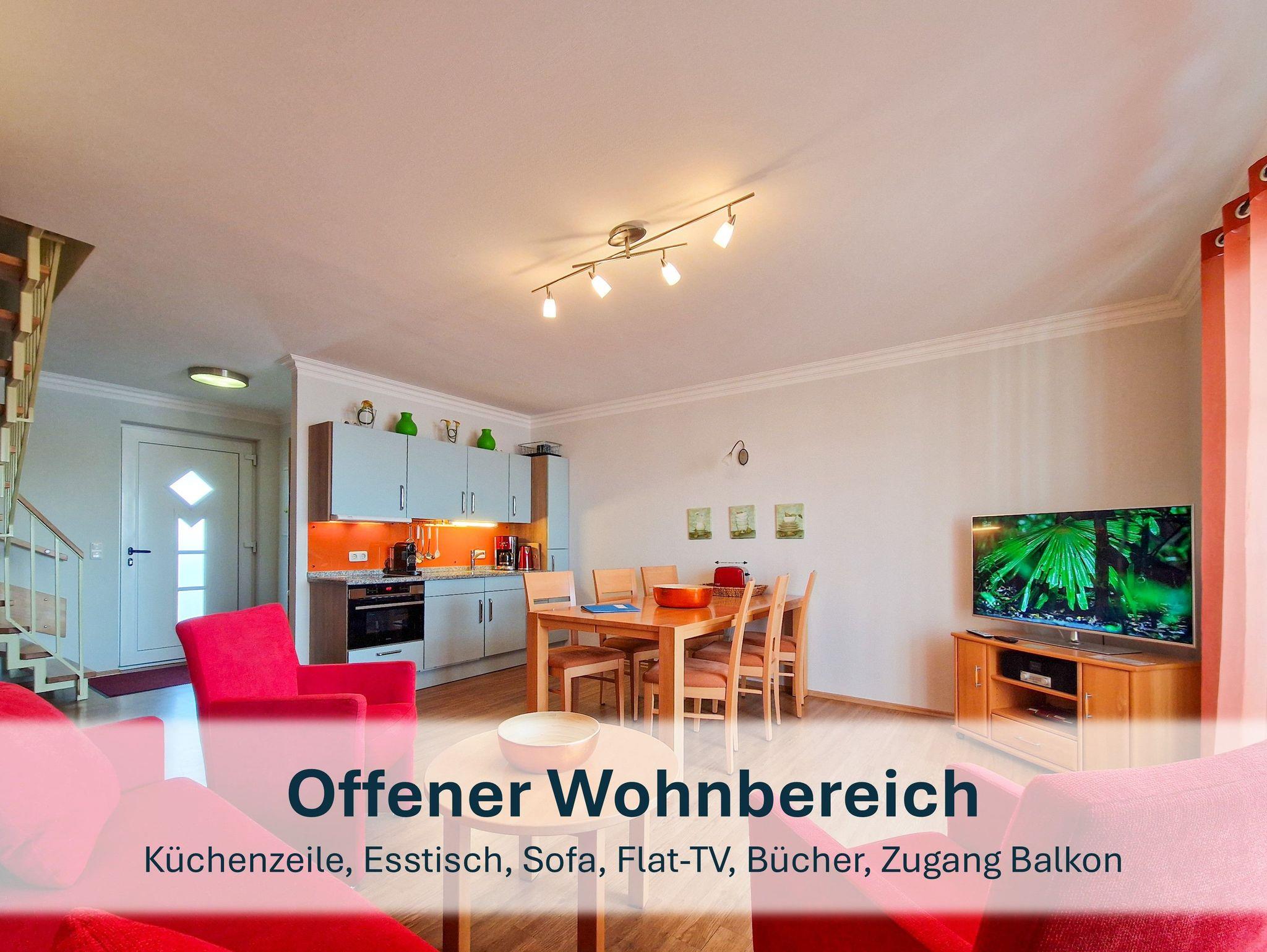 Im hellen Wohn-/Essbereich auf der 1. Etage erwarten Sie eine gemütliche Sitzecke mit Schlafsofa für 2 Personen, Sat-TV, Radio und ein Esstisch - ideal für entspannte Abende. Die moderne Einbauküche mit Backofen lässt keine Wünsche offen. Vom Balkon aus genießen Sie den atemberaubenden Blick auf das lebendige Treiben im Yachthafen Karlshagen. Ein geräumiges Bad/WC rundet das erste Stockwerk ab.