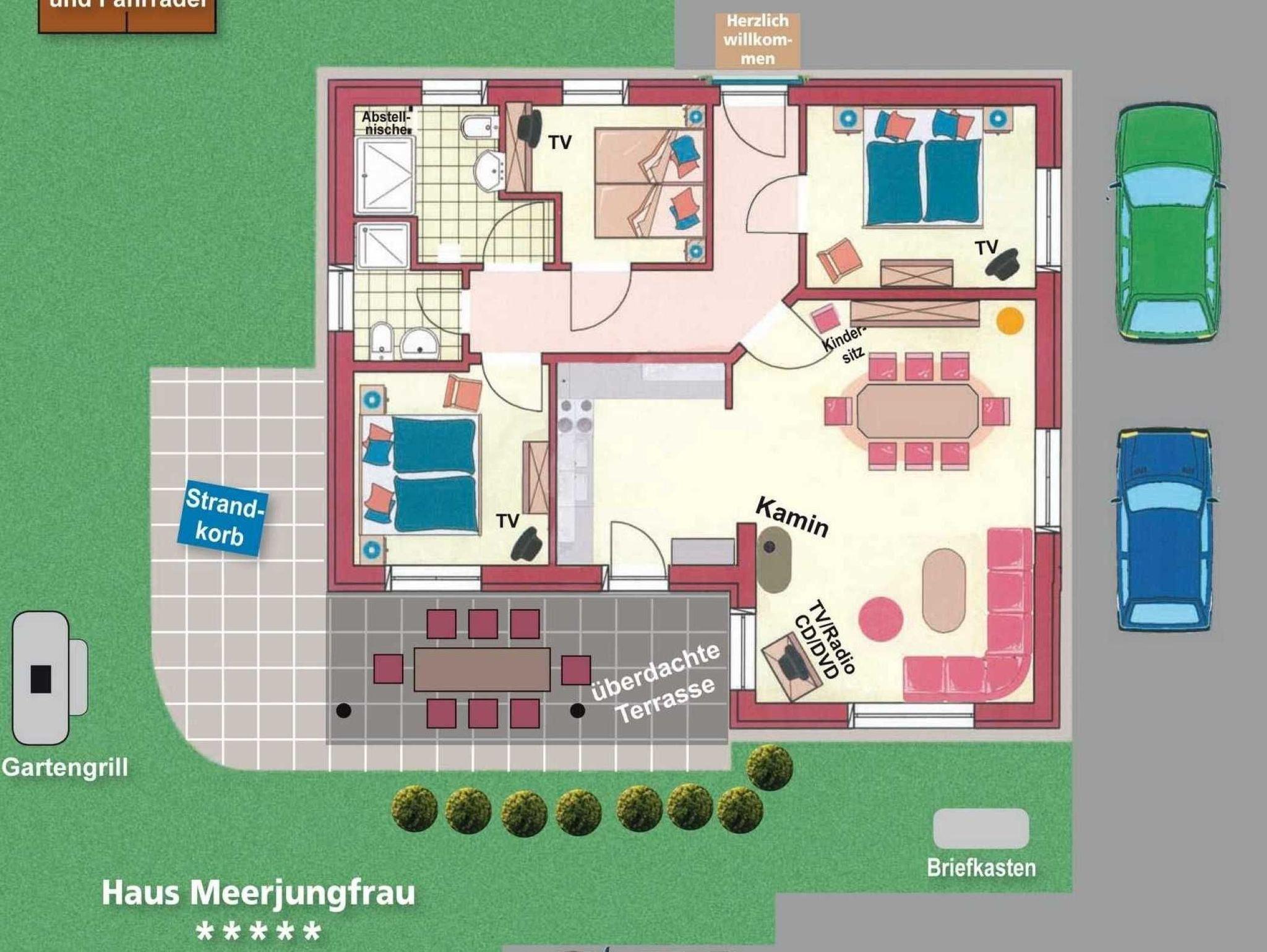 Das XXXL - Ferienhaus Meerjungfrau wurde vom DTV mit 4-Sternen ausgezeichnet. Es liegt in der 2008 erbauten Ferienhausanlage Vier Jahreszeiten und ist barrierefrei, behindertenfreundlich und rollstuhlgeeignet. Es sind keine Haustiere möglich. Die Wohnfläche beträgt ca. 100 m². Das Haus befindet sich auf einem Grundstück von ca. 452 m² Größe.