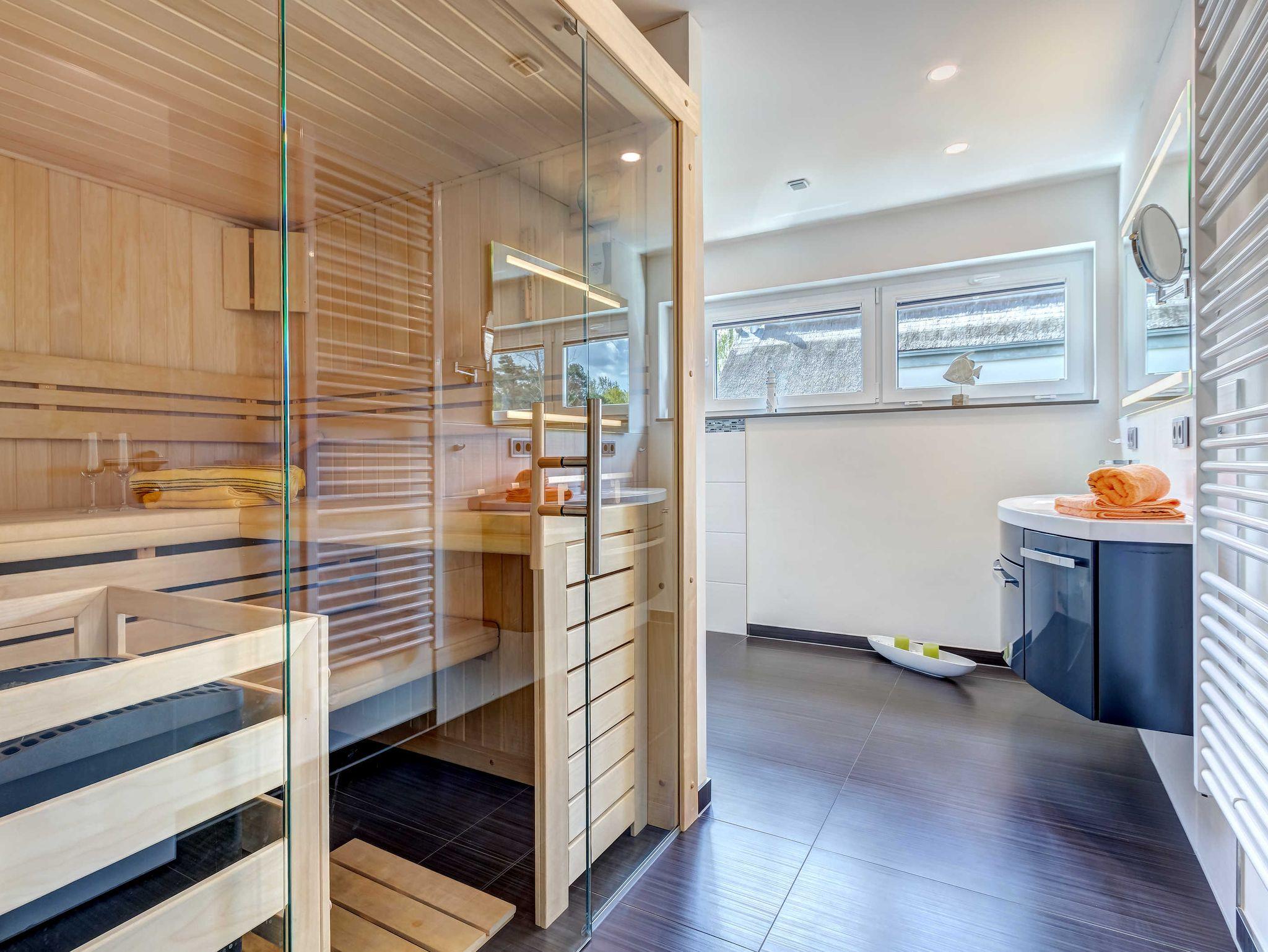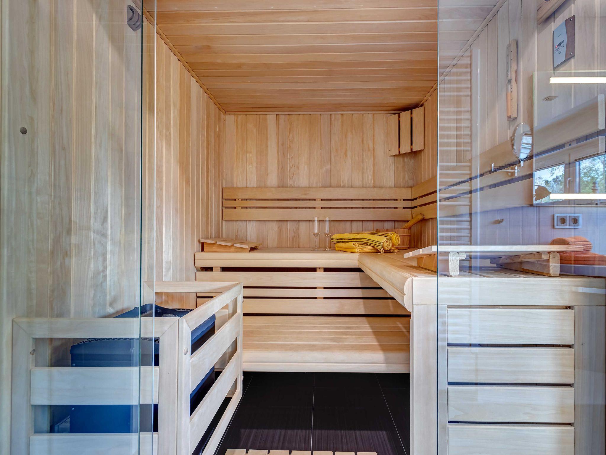 Das Obergeschoss glänzt mit einem zweiten Badezimmer, das mit einer hochwertigen Espenholzsauna ausgestattet ist - perfekt, um sich nach einem langen Tag zu erholen. Hier finden Sie auch zwei weitere Schlafzimmer: Eines mit einem großzügigen Doppelbett und das andere mit einem Doppelbett sowie zwei gemütlichen Einzelbetten - ideal für Familien oder Gruppen, die gemeinsam reisen.