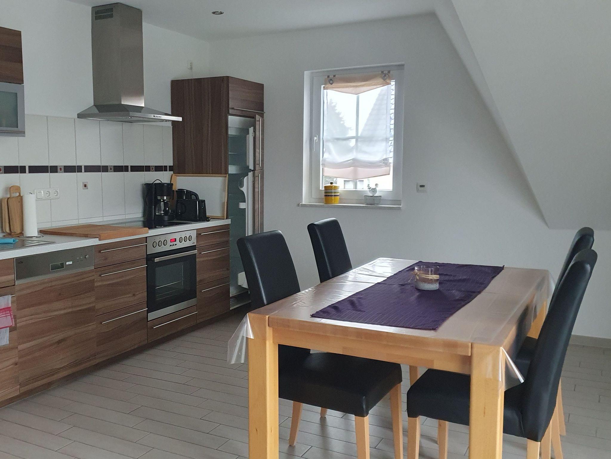 Die modern eingerichtete Dachgeschosswohnung im ersten Stock der Doppelhaushälfte verfügt über einen möblierten Balkon, eine gemütliche Eckcouch und SAT-TV. Die voll ausgestattete Küche mit Essplatz für 4 Personen grenzt an den Wohnbereich. Im Schlafzimmer mit Doppelbett ist Platz für ein Baby, das noch im Babybett schläft.