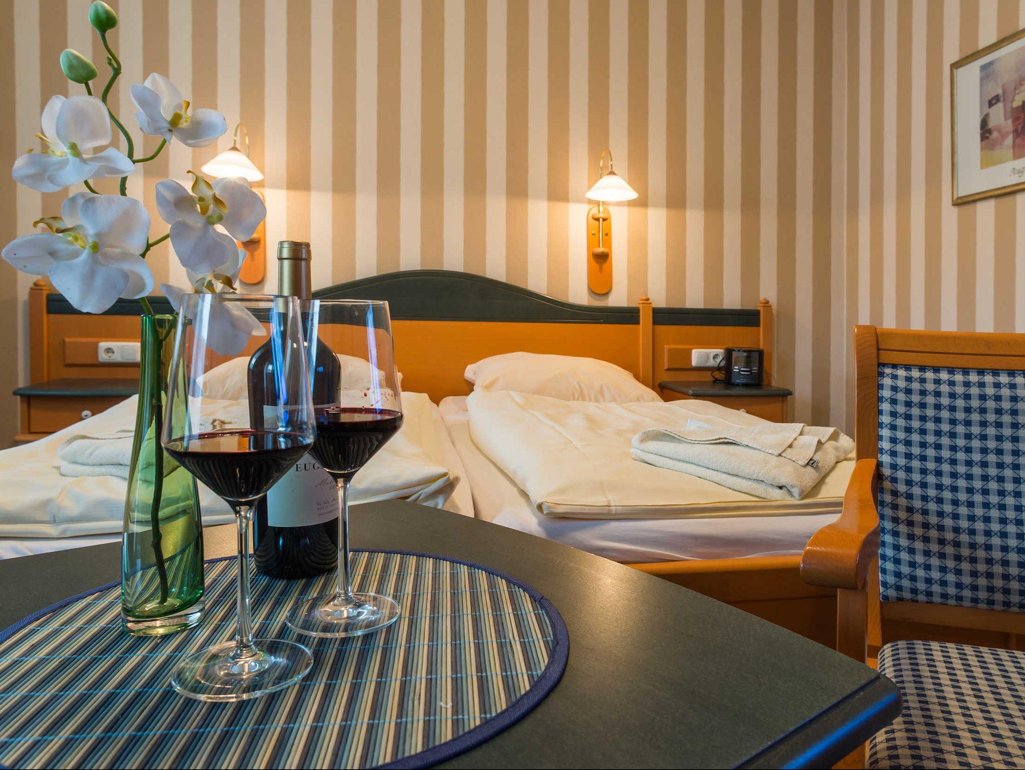 Ein morgendliches Highlight ist unser vielseitiges Frühstück, das Sie bei gutem Wetter auch in unserem einladenden Gästegarten genießen können. Zur Begrüßung wartet eine Flasche Sekt (alternativ Wein oder Wasser) auf Sie der ideale Start in einen entspannten Urlaub.
