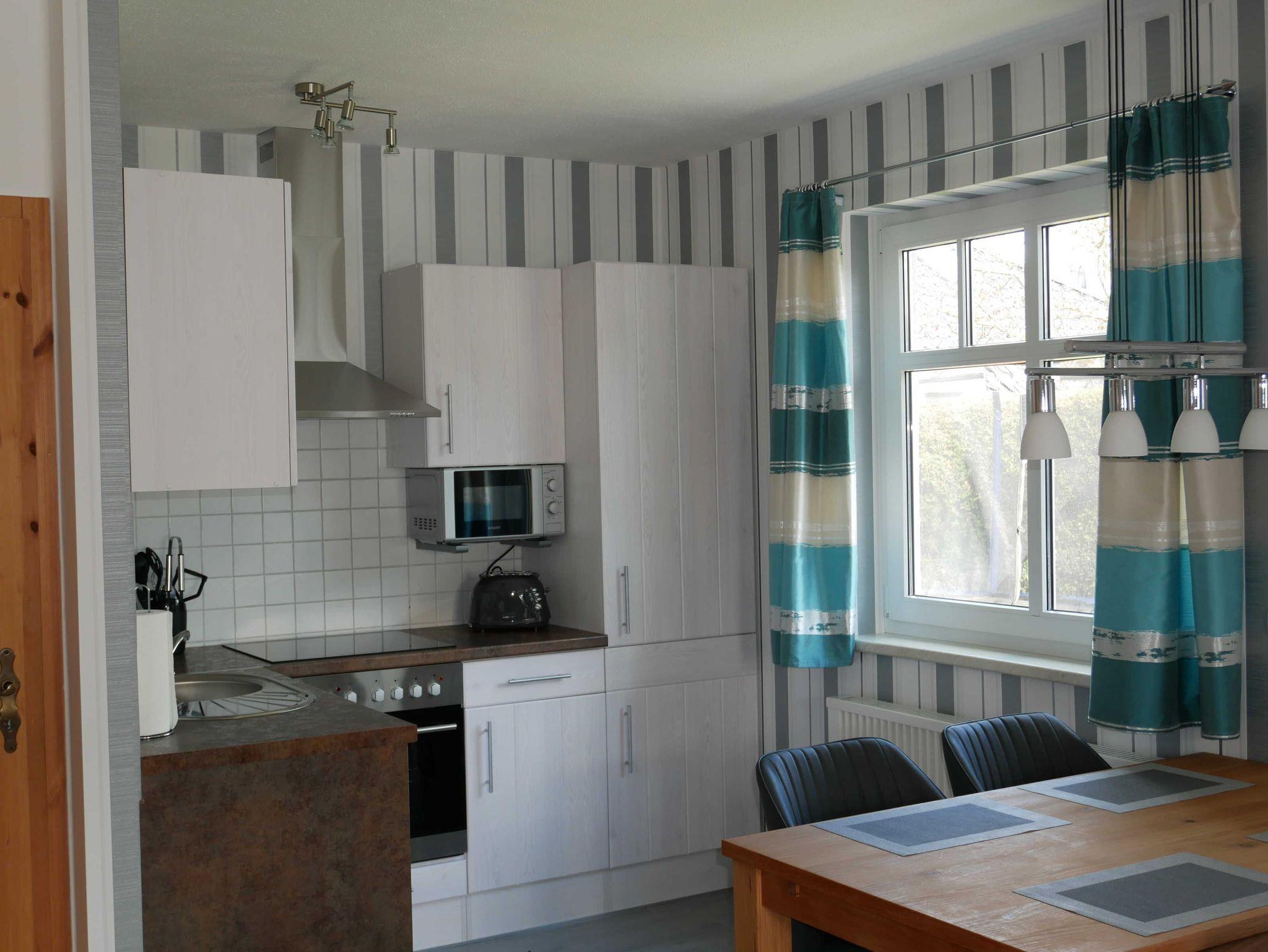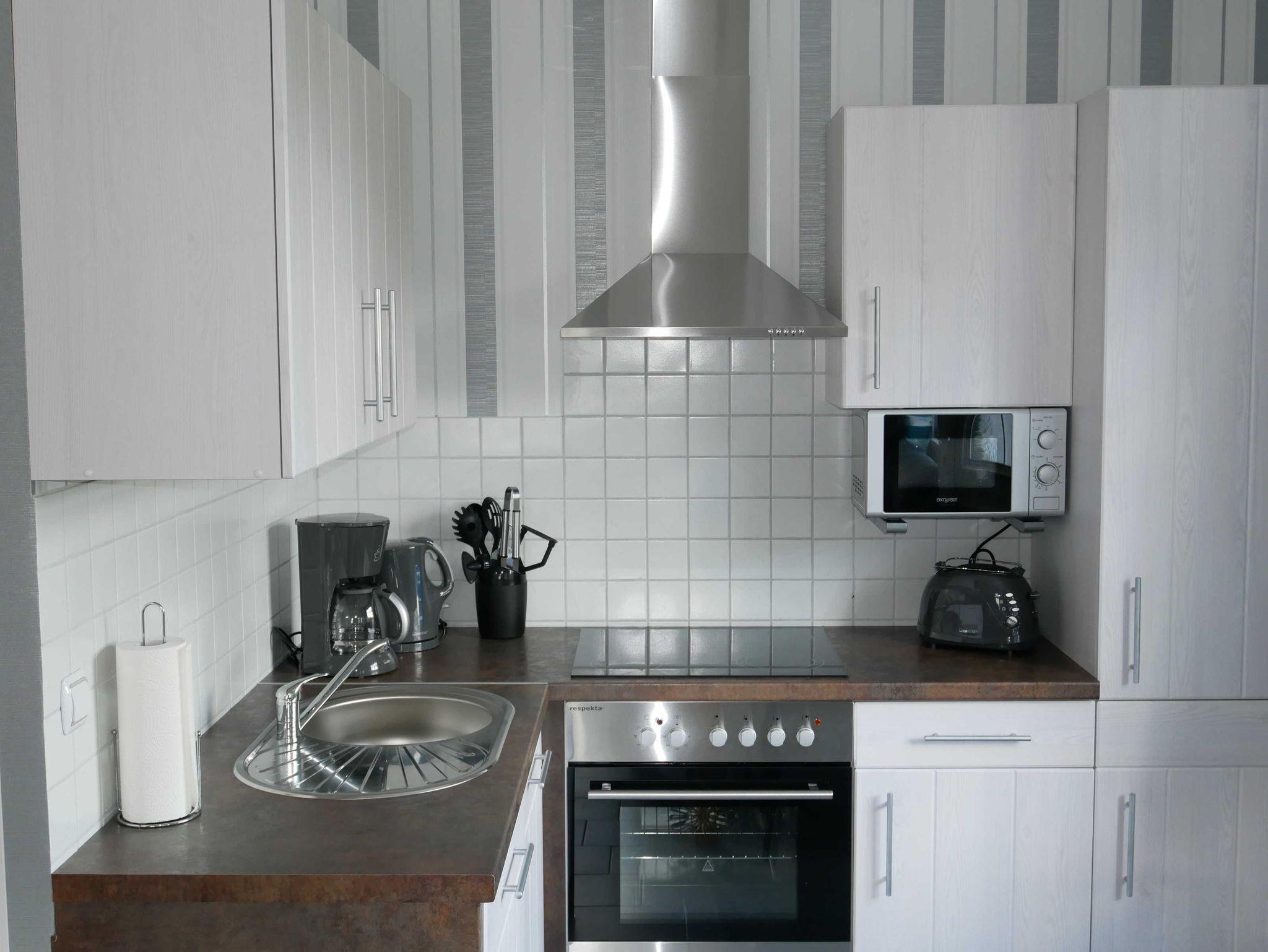 Die voll ausgestattete Küchenzeile verfügt über ein Cerankochfeld mit Backofen, Spülmaschine, Mikrowelle, Kühlschrank mit Gefriermöglichkeit, Kaffeemaschine, Wasserkocher und Toaster. Die Vermieter stellen ihnen außerdem Küchenrolle, Tabs für Spülmaschine, Müllbeutel, Spülmittel und Abwaschlappen bereit.