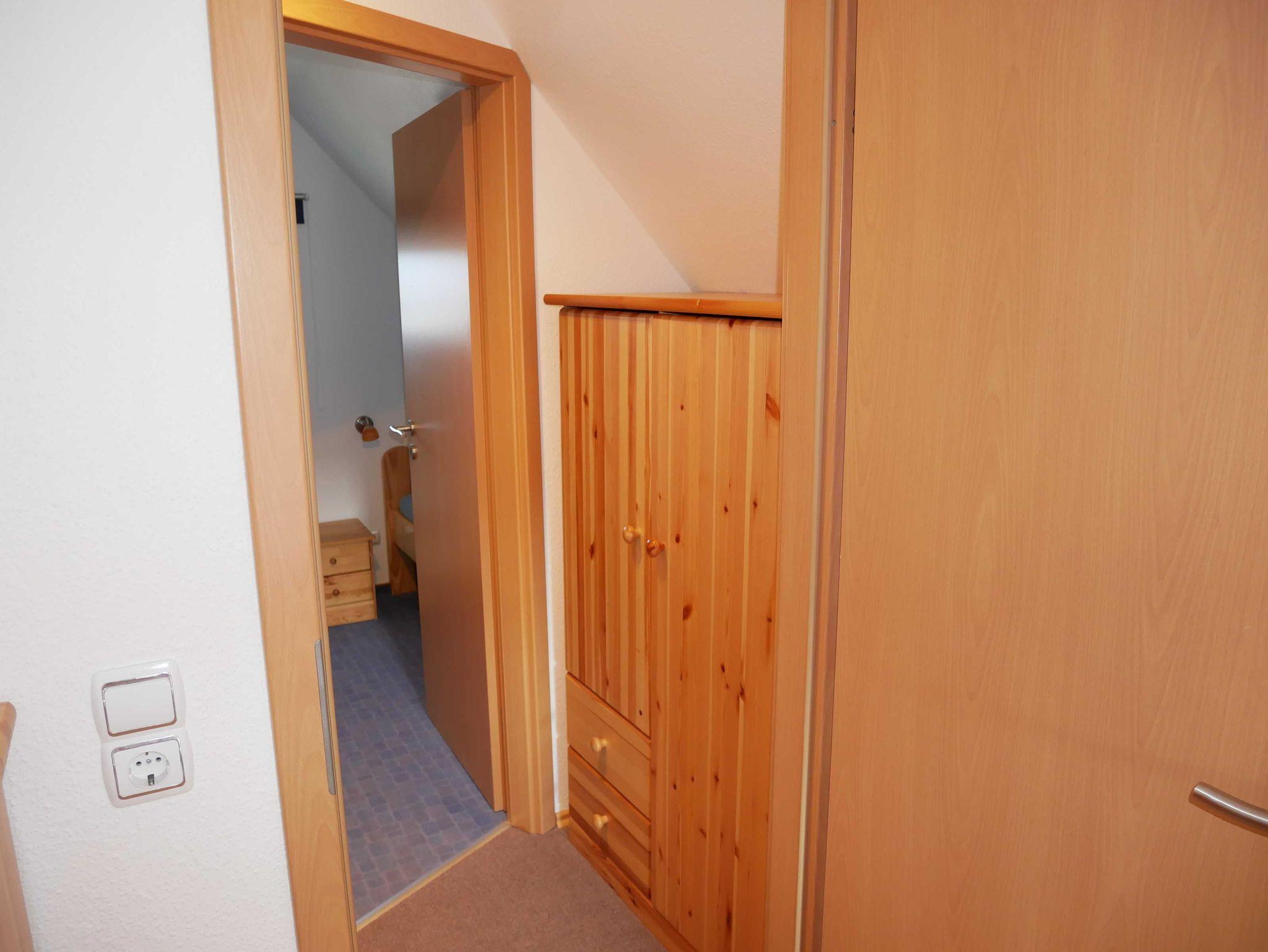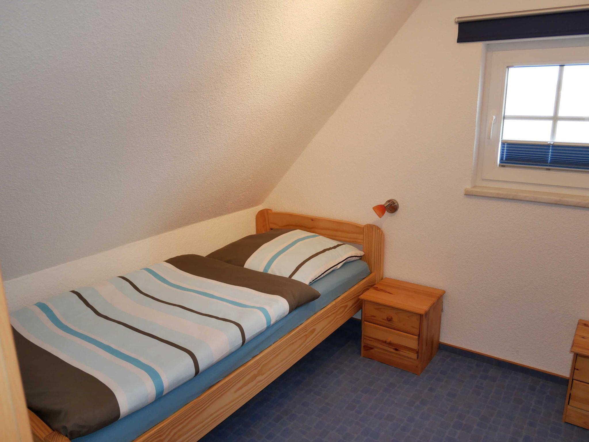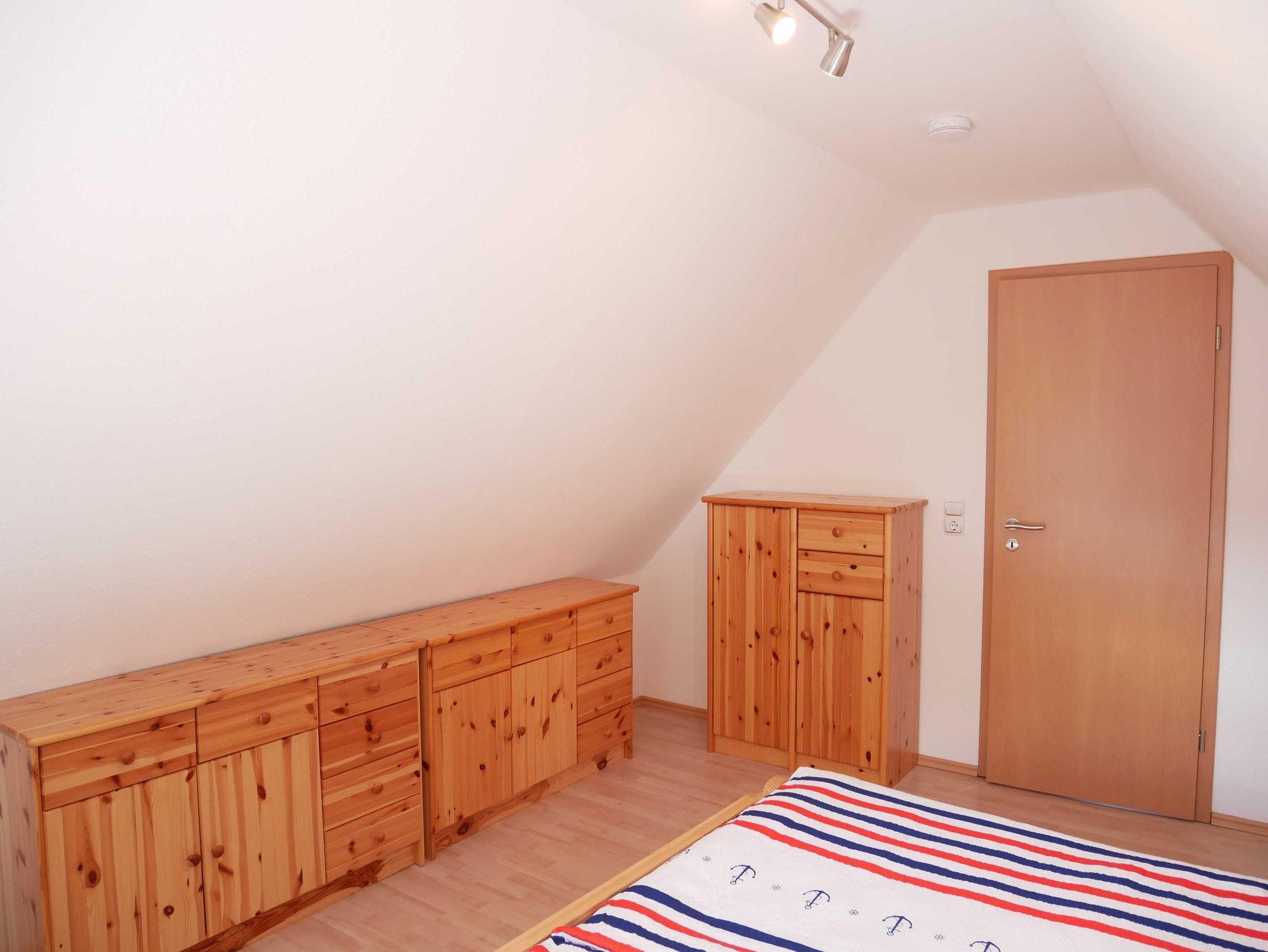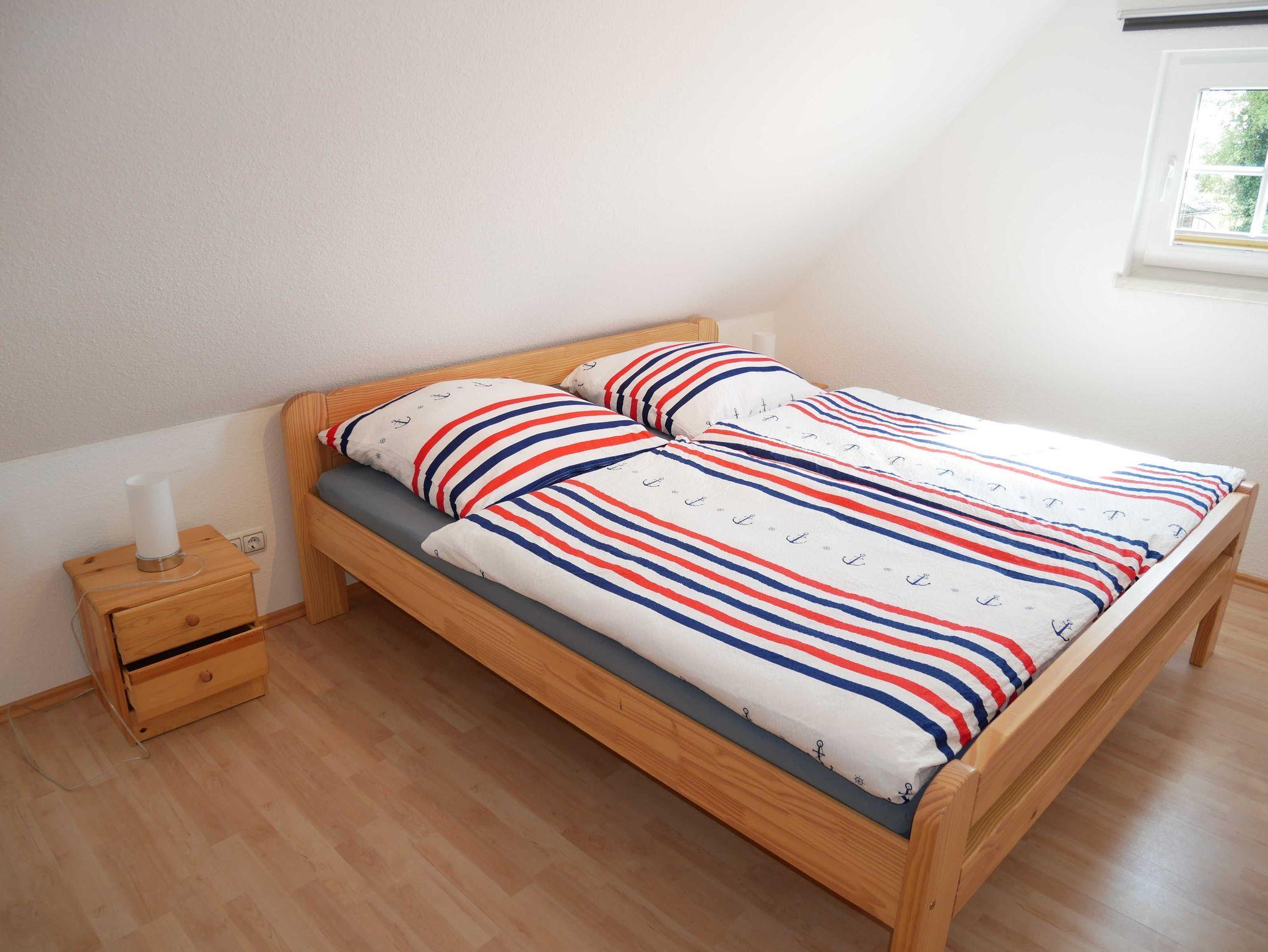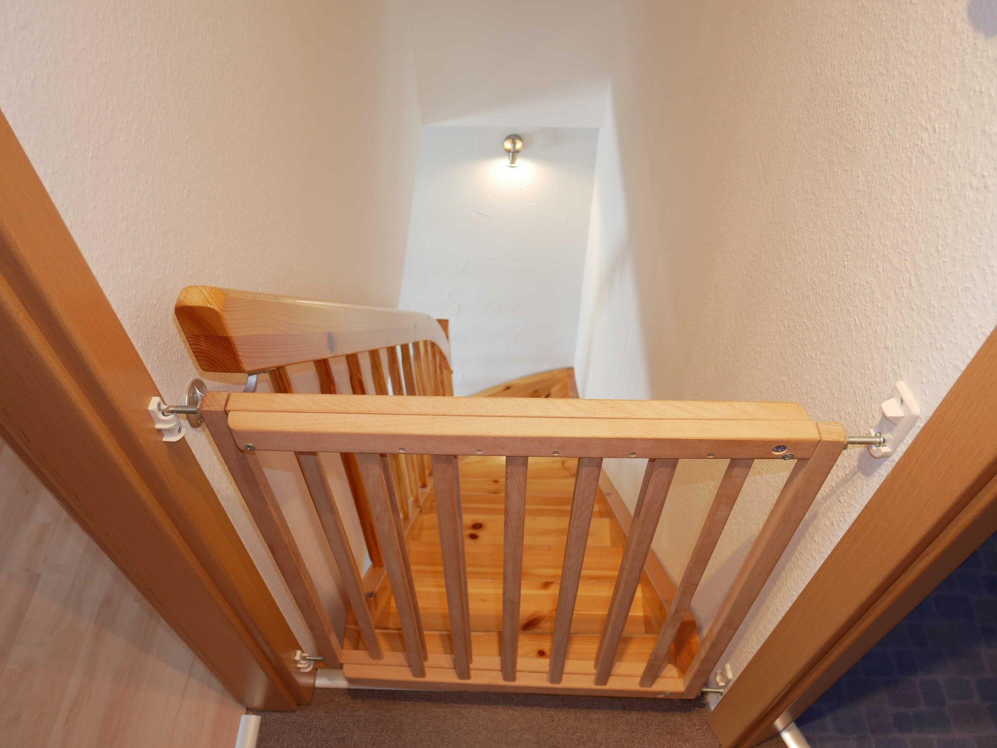 Im Obergeschoß befinden Sich die Schlafzimmer. Das große Schlafzimmer ist mit einen Doppelbett und das kleine mit 2 Einzelbetten ausgestattet. Die Treppe kann im oberen Stockwerk mit einem Treppenschutzgitter versehen werden.