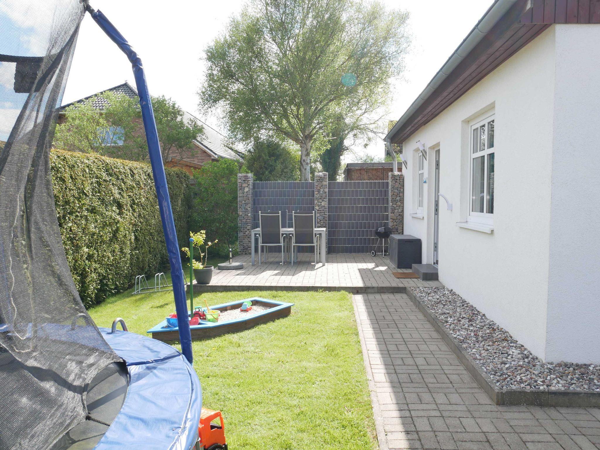 Die möblierte Terrasse befindet sich direkt vorm Haus und lädt zum Entspannen und Spielen ein. Trampolin, Sandkasten und ein Grill stehen Ihnen kostenfrei zur Verfügung. Fahrräder können ebenfalls vor dem Haus abgestellt werden. Ein kostenfreier PKW-Stellplatz und Internet via W-LAN ist vorhanden.