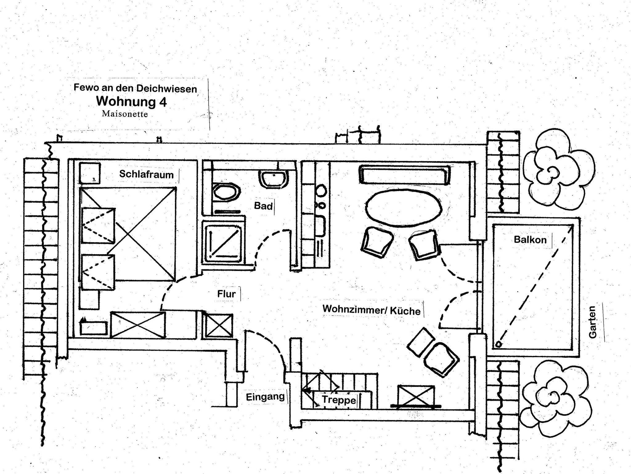 Die 2-Raum-Ferienwohnungen 01,02,05 und 06 befinden sich im Erdgeschoss und verfügen alle über eine Terrasse zum Garten.