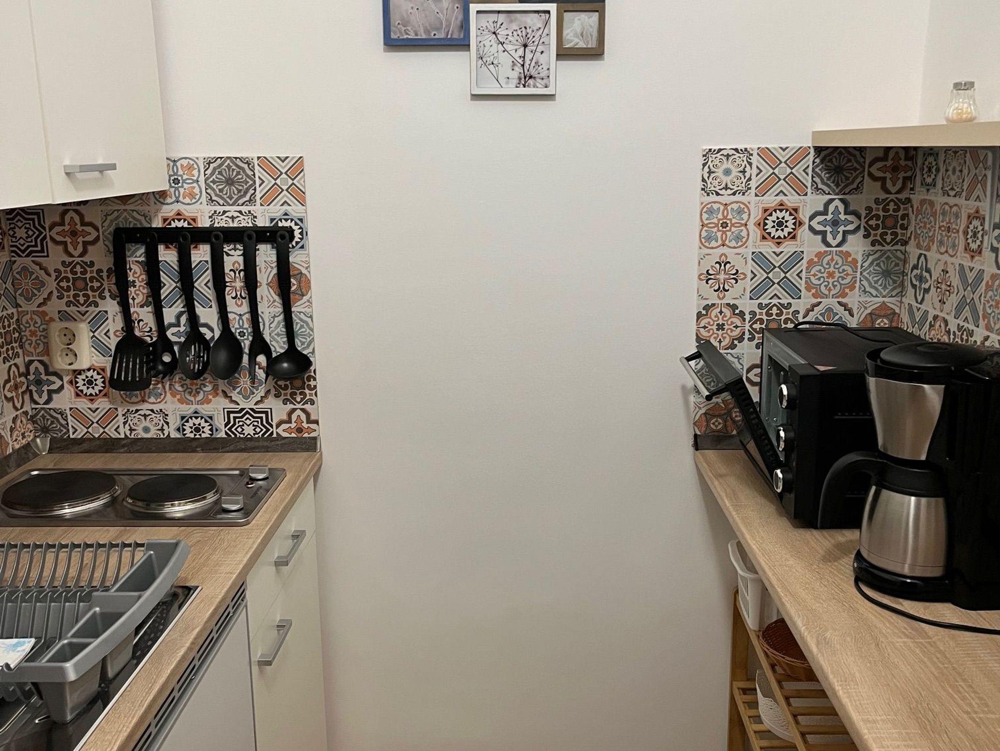 Küche mit Küchenzeile, Kochfeld, Kühlschrank mit Gefrierfach, Kaffemaschine, Wasserkocher, Backofen