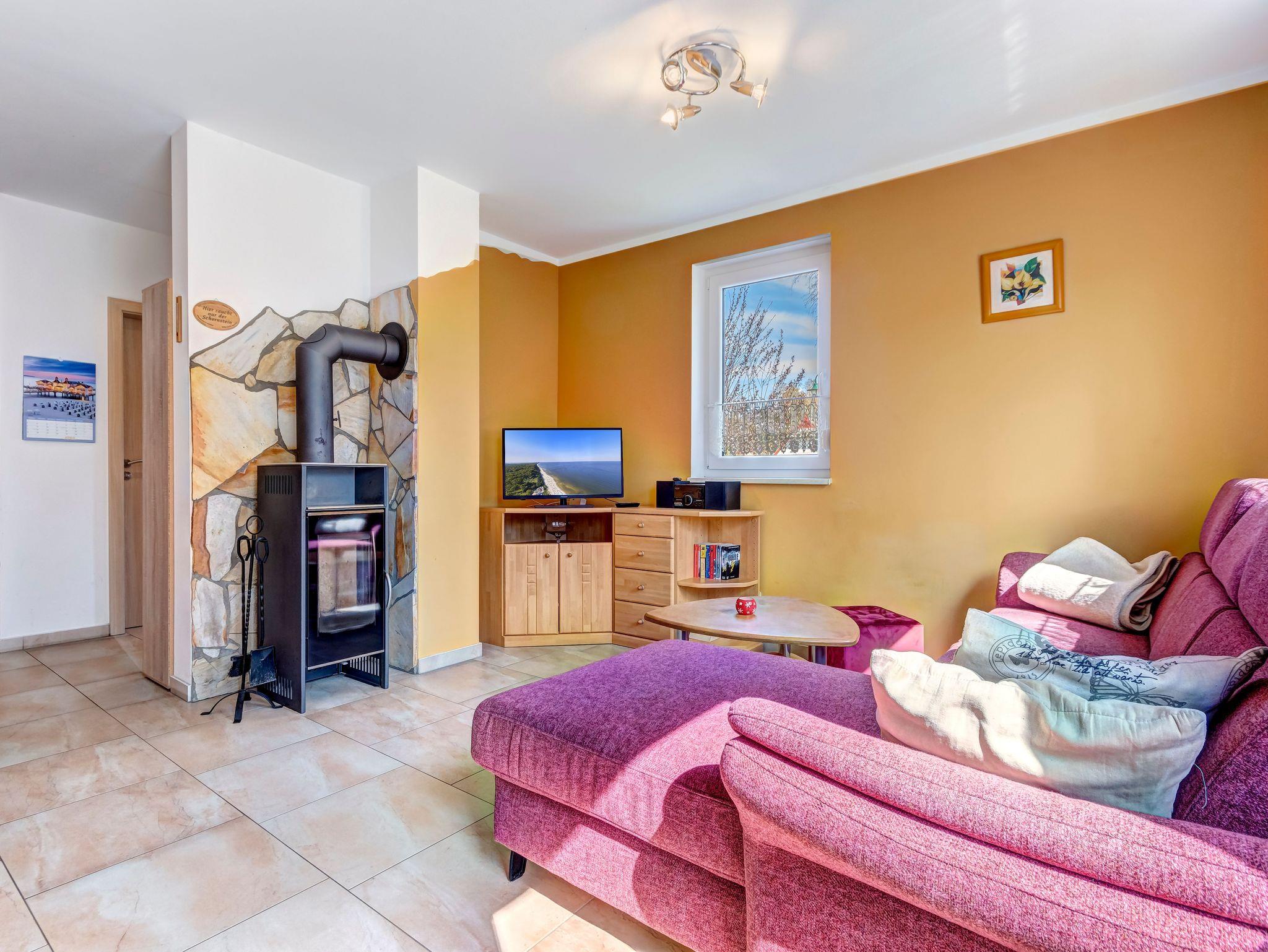 Das Wohnzimmer ist mit einer gemütlichen Schlafcouch, einem Kaminofen und TV ausgestattet.