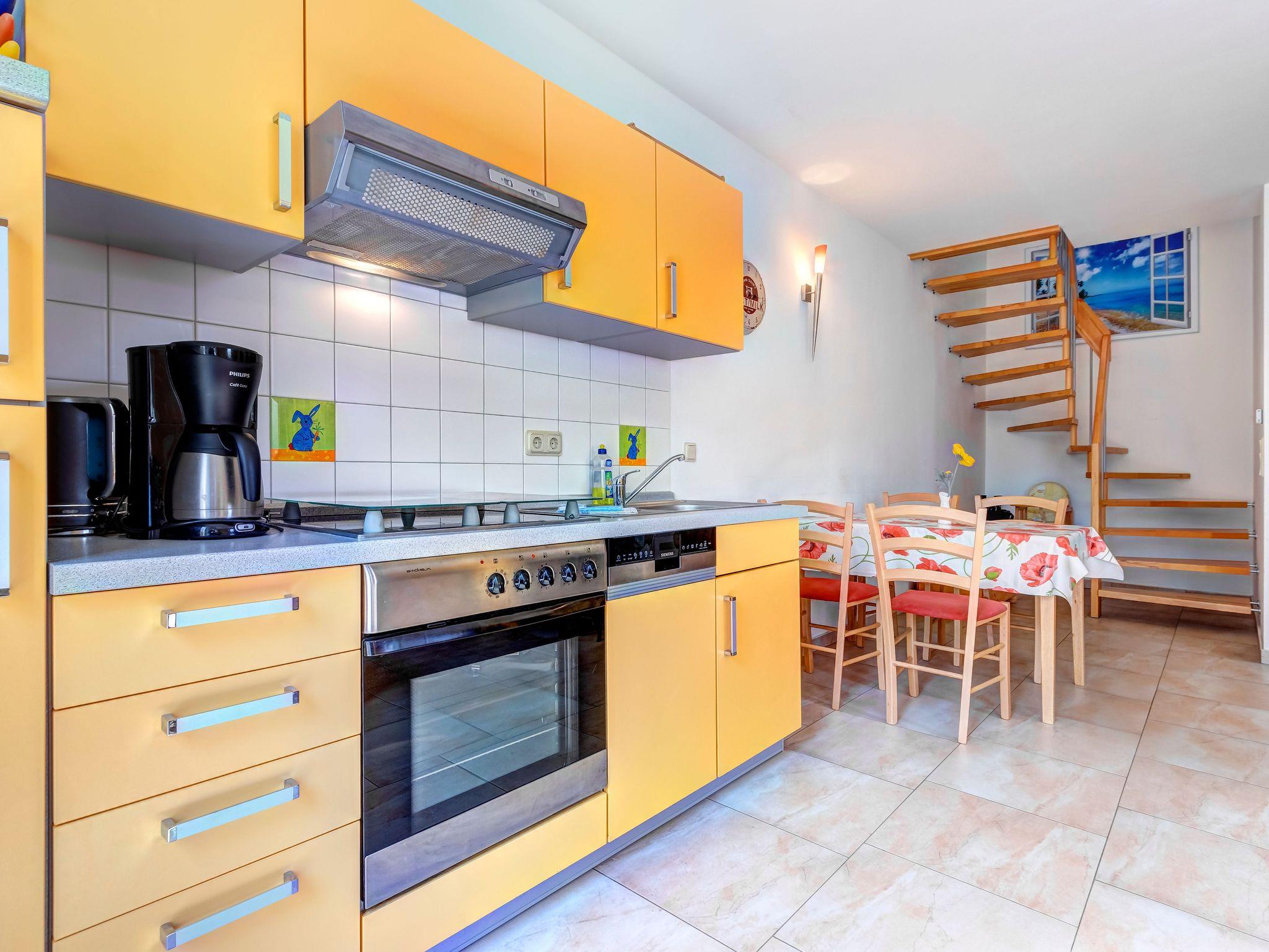 In der offenen Küchenzeile ist ein Geschirrspüler, ein Herd mit Backofen, eine Kühl-/Gefrierkombi und eine Mikrowelle integriert.