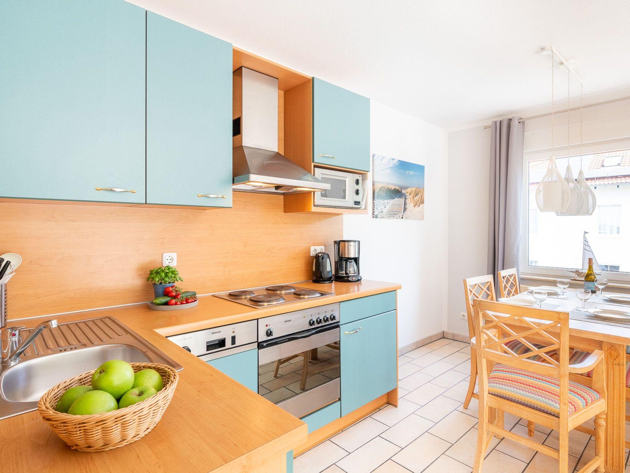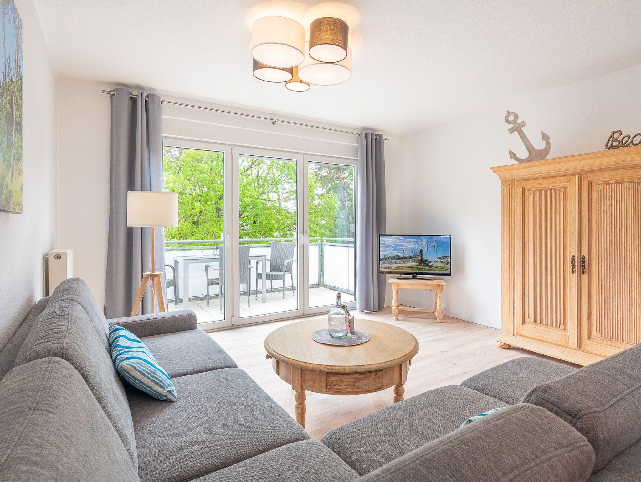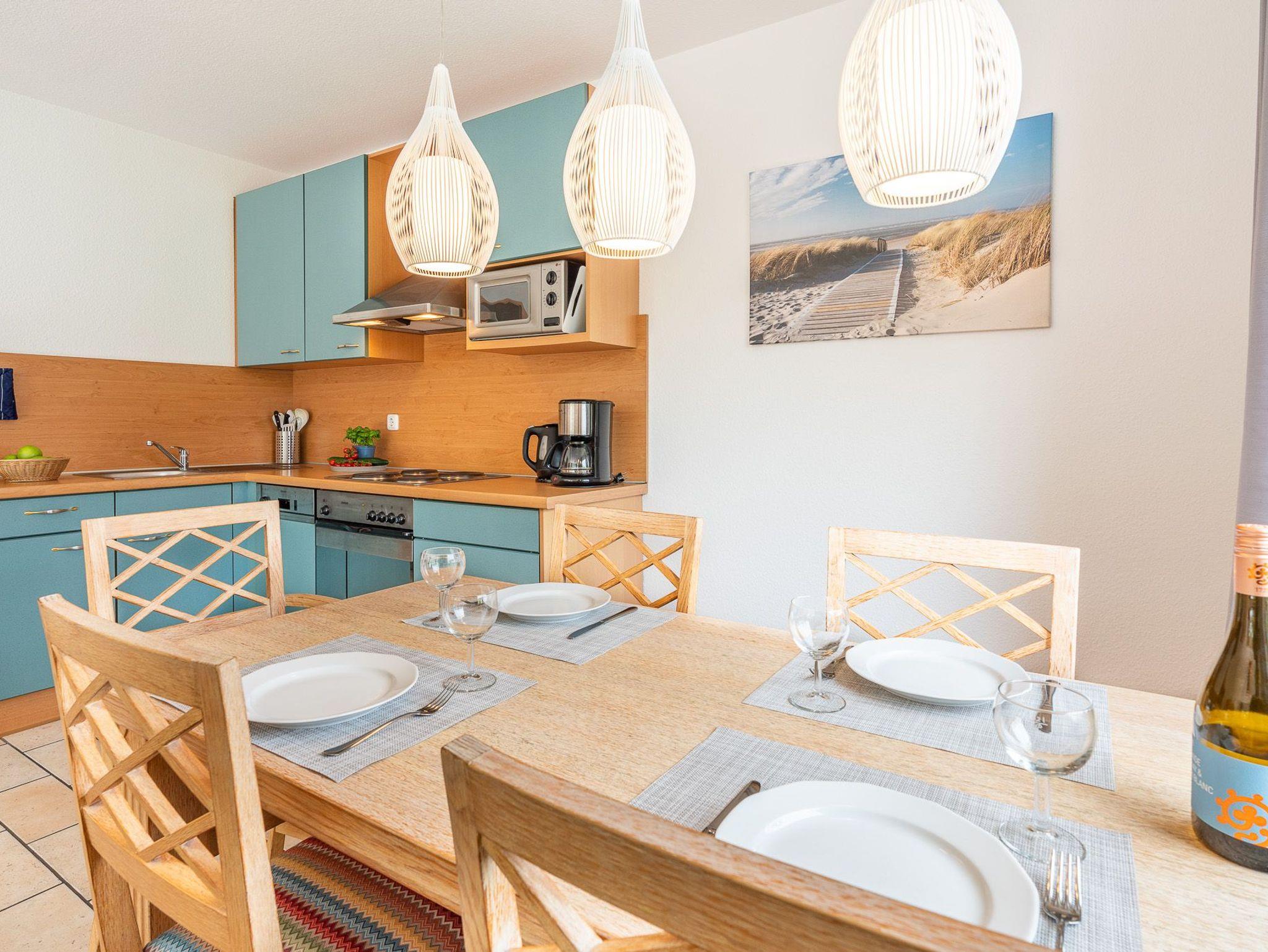 Der behagliche Wohnraum mit einer gemütlichen Sitzecke und einem Fernseher, sowie die komplett eingerichtete, offene Küche bieten einen guten Ort um sich gemeinsam in der Wohnung zu entspannen. Durch die zwei Schlafzimmer, gibt es jedoch auch einen ruhigen Rückzugsort um abzuschalten. Ein Schlafzimmer ist mit einem Doppelbett ausgestattet und eins mit zwei Einzelbetten. Das Badezimmer besitzt eine Dusche und ein WC. Auf dem Balkon können Sie gemütlich den Abend ein- und ausklingen lassen. WLAN ist vorhanden. Waschmaschine und Trockner können Sie gegen Entgelt verwenden. Natürlich stellen wir Ihnen ein PKW-Parkplatz vor dem Haus zur Verfügung. Zum feinsandigen, weißen Badestrand sind es nur ca. 3-4 Gehminuten.