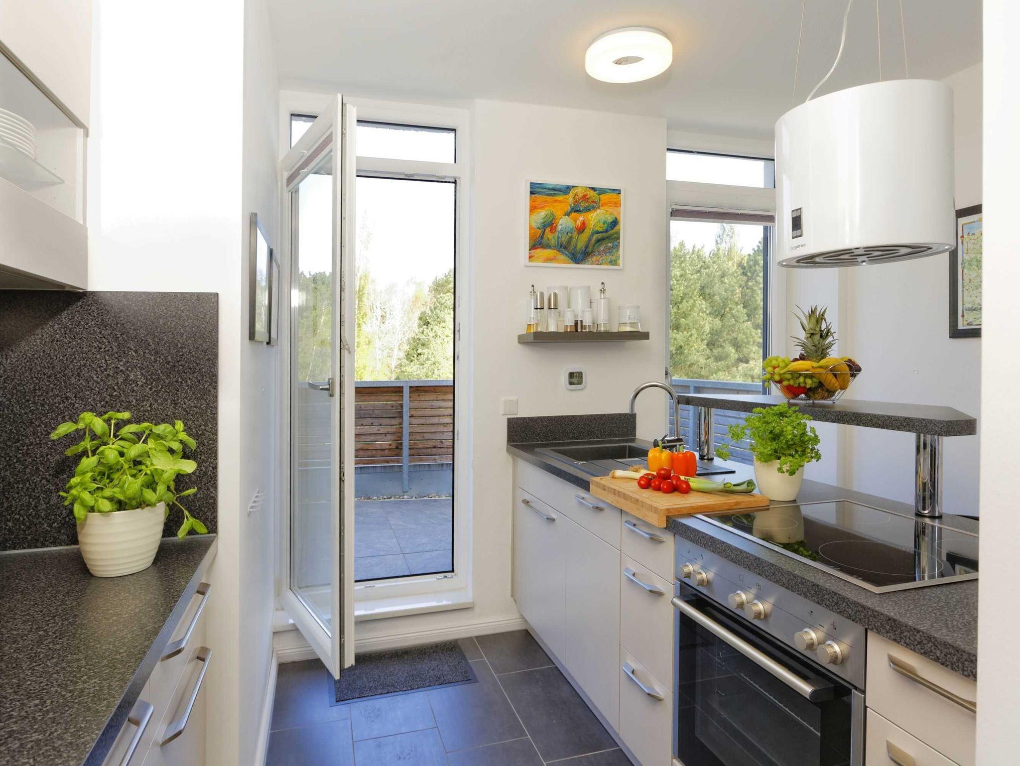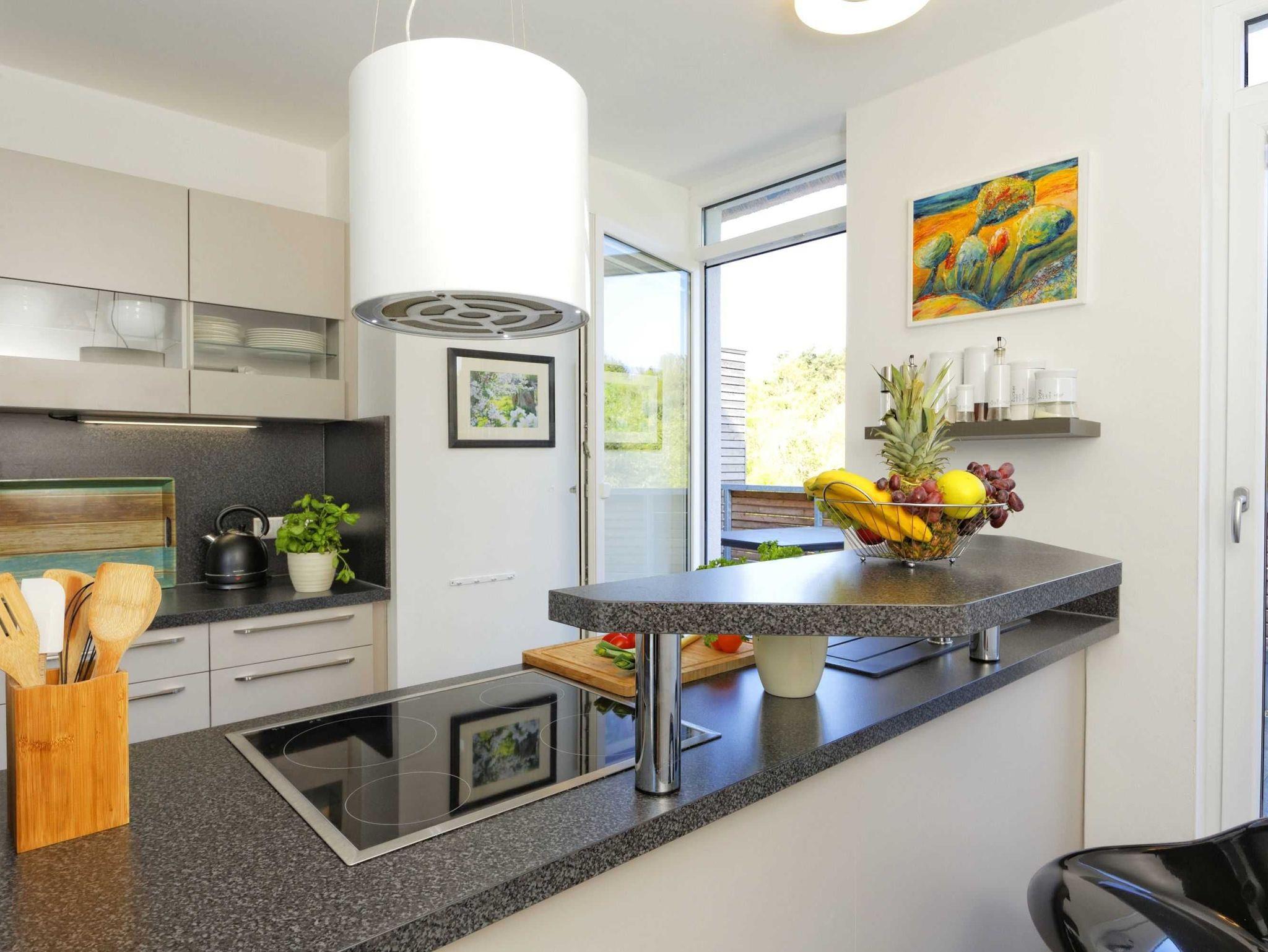 • offene Küche mit Frühstücksbar, Dunstabzugshaube, Backofen mit Ceranfeld, Kühlschrank mit Gefrierfach, Mikrowelle, Kaffeemaschine, Toaster und Wasserkocher, direkter Zugang zur Dachterrasse