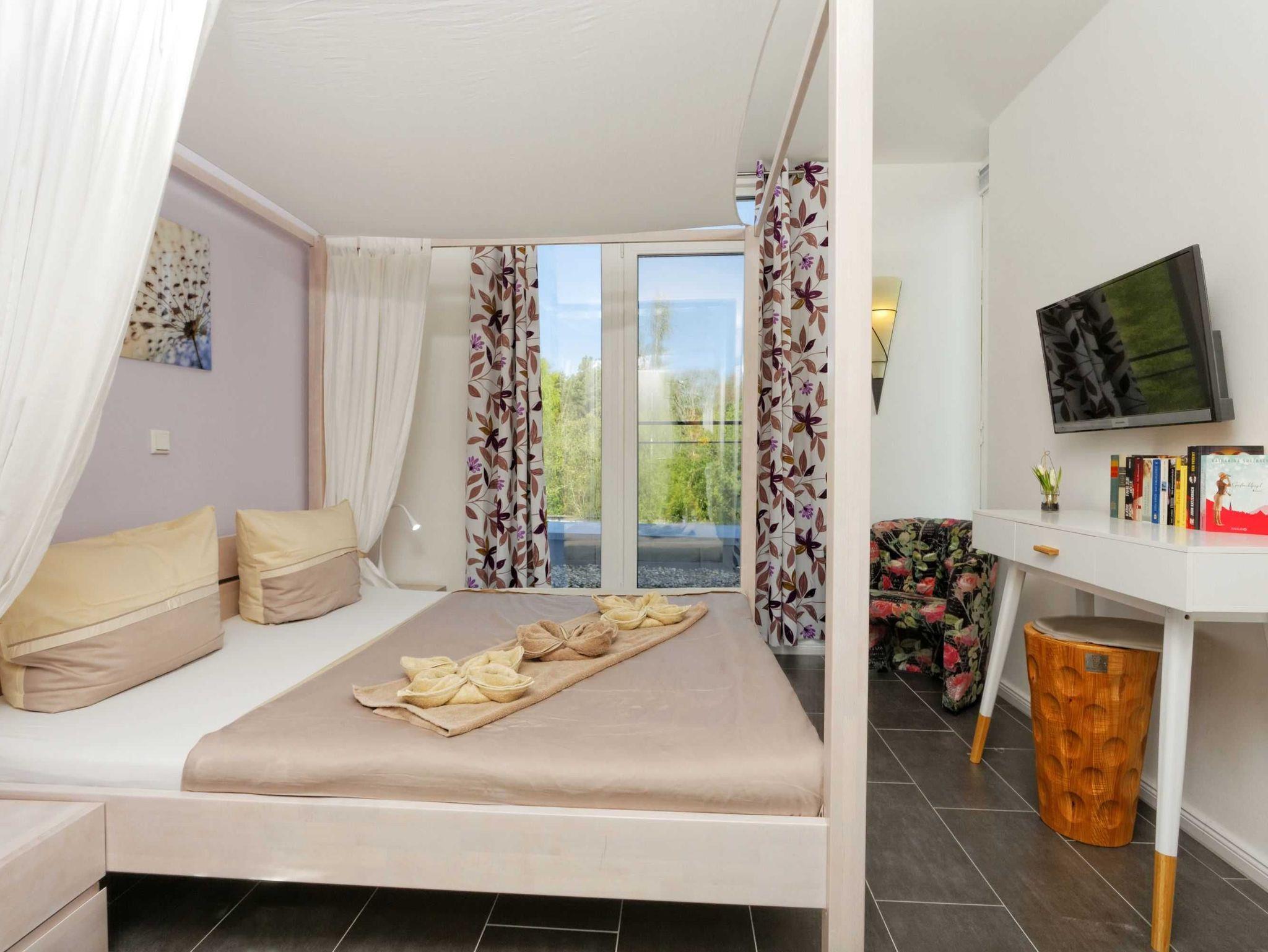 • 1 Schlafzimmer mit Himmelbett (Doppelbett 1,80 m x 2,00 m), TV und direktem Zugang zur möblierten Süd/Ost-Dachterrasse (ca. 6 m²)