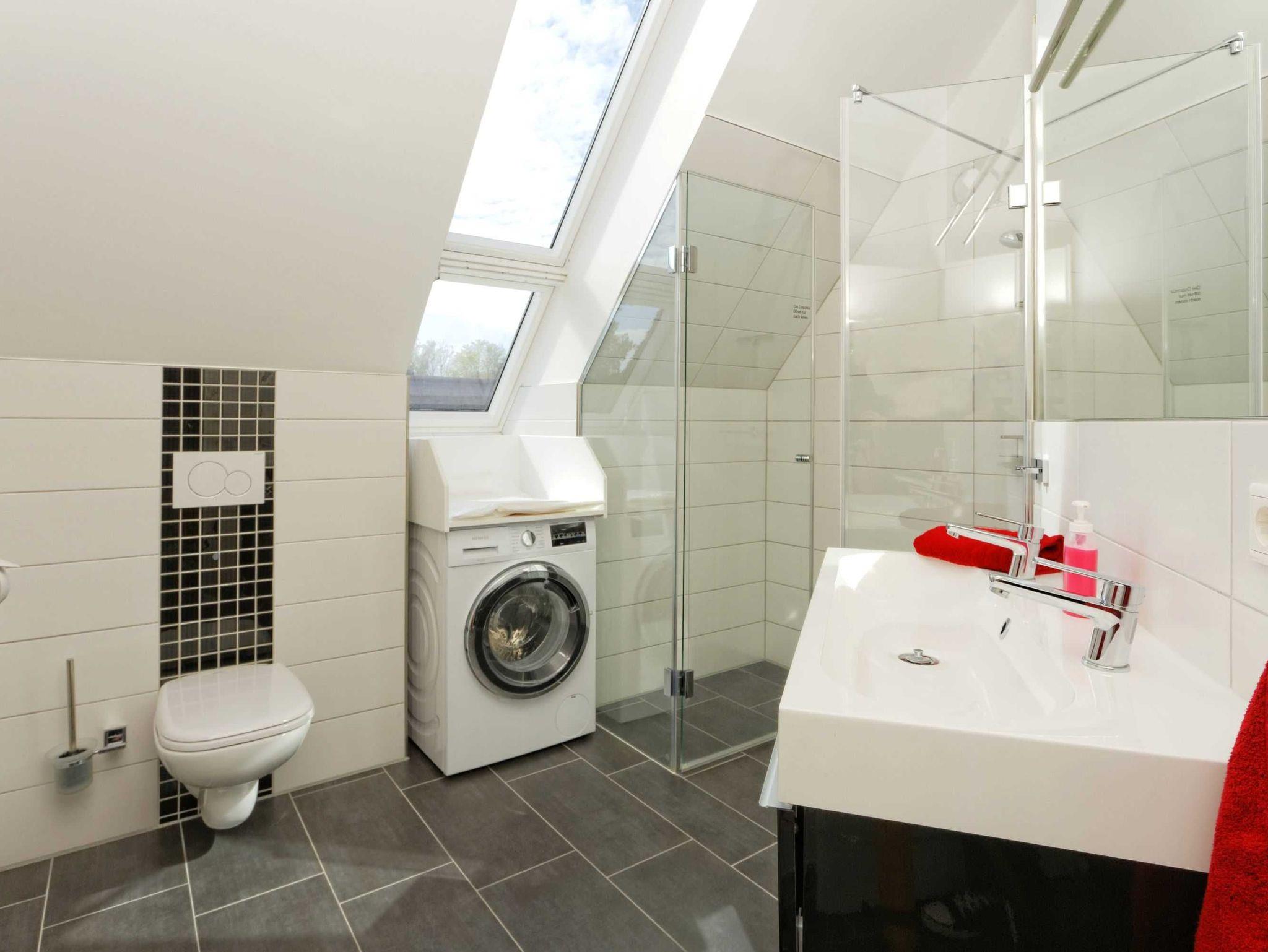 • Badezimmer mit barrierefreier Dusche, Doppelwaschbecken, WC, Kosmetik-Spiegel, Föhn, Waschmaschine mit integriertem Trockner