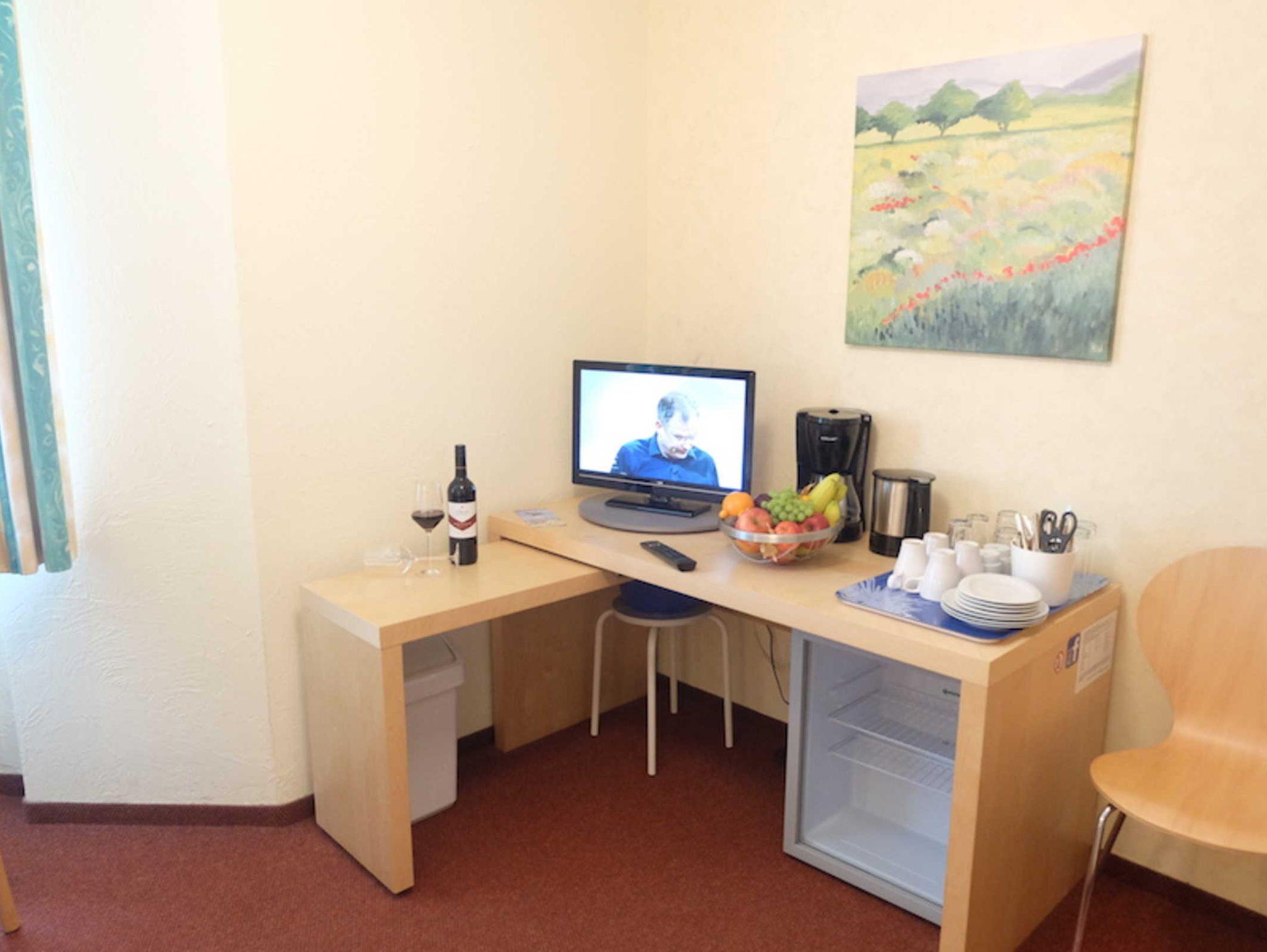 Kühlschrank, Kaffeemaschine, Wasserkocher, Geschirr und Besteck u.v.m. im Zimmer; keine Kochmöglichkeit