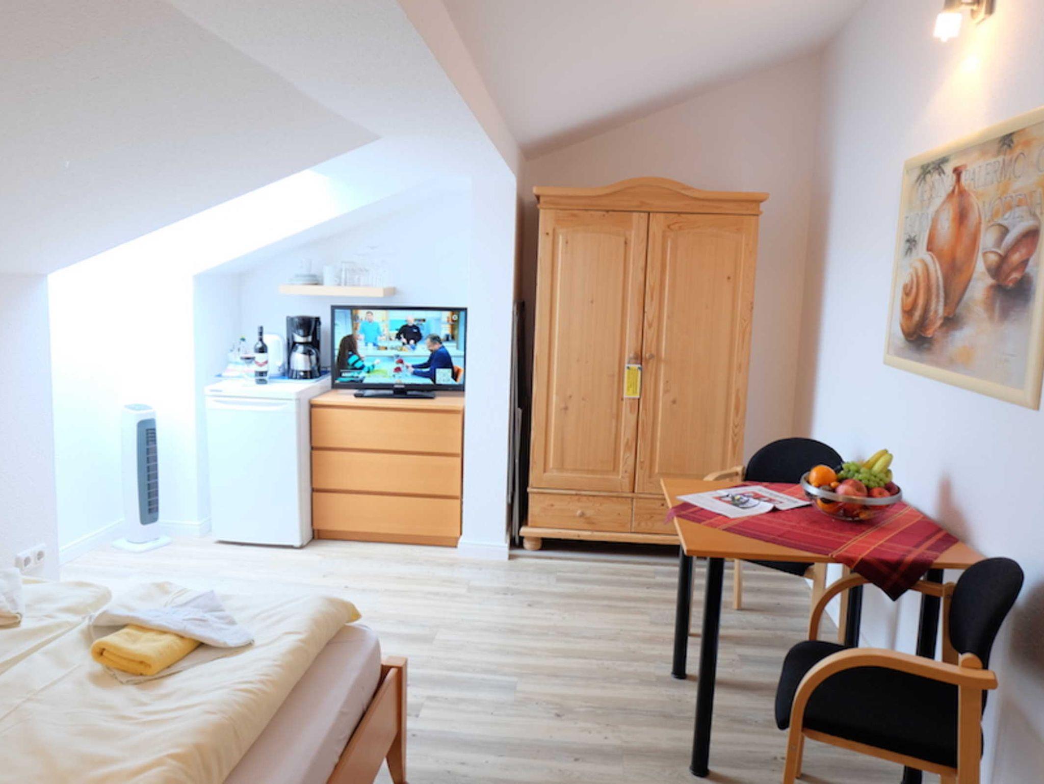 Jedes Zimmer verfügt über ein bequemes Doppelbett, eine kleine Sitzecke und einen praktischen Kleiderschrank. Für Unterhaltung sorgt ein moderner Flachbildfernseher mit integrierter Musikanlage, und dank kostenfreiem WLAN bleiben Sie auch im Urlaub jederzeit verbunden. Der kompakte Küchenblock mit Kühlschrank, Kaffeemaschine, Wasserkocher und Geschirr ermöglicht Ihnen eine flexible Selbstversorgung, während eine Garderobe und zusätzliche Ablagemöglichkeiten für Ihr Gepäck den Komfort abrunden.