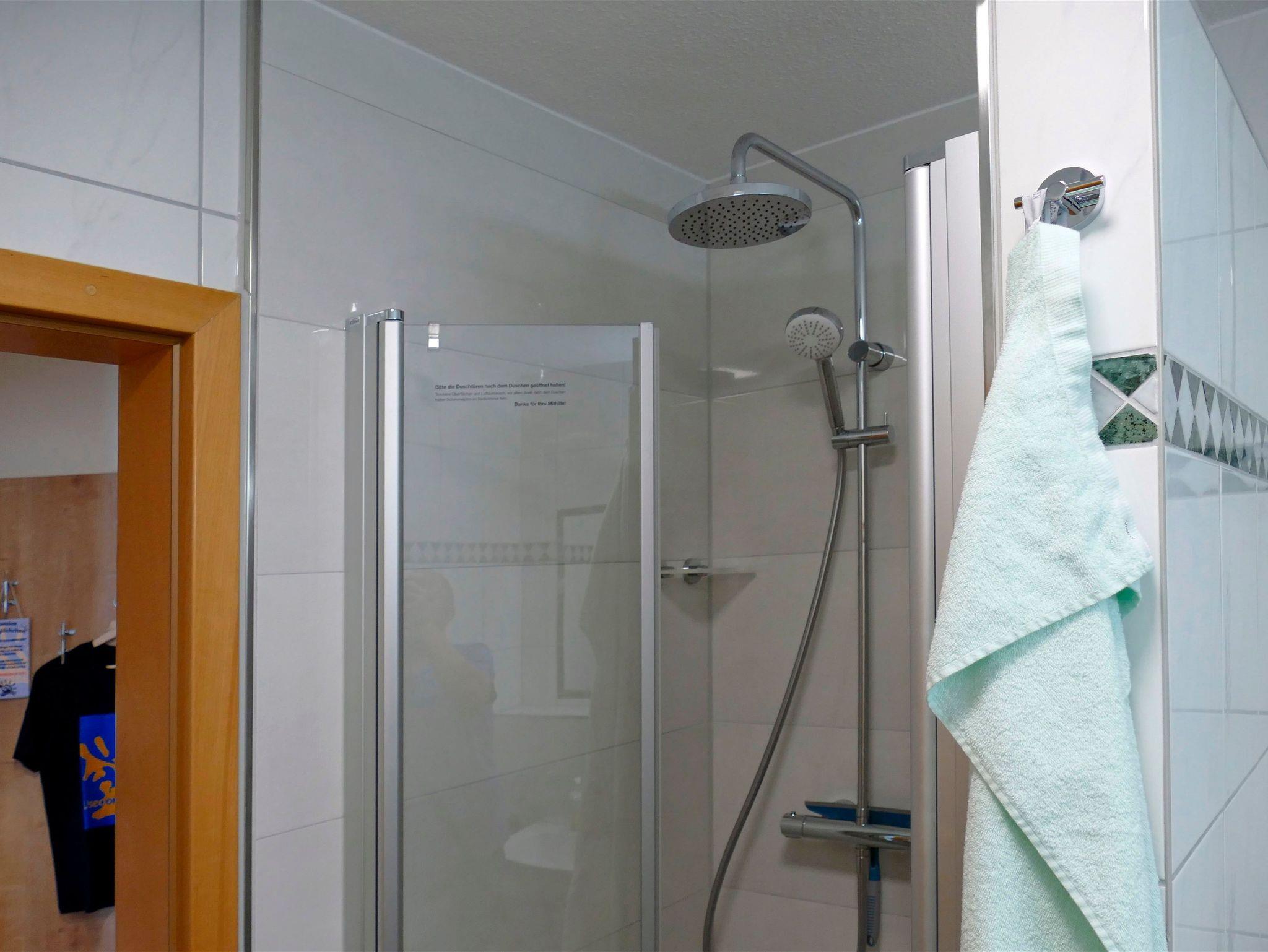 Das moderne Badezimmer ist mit einer großzügigen Regen-Shower-Dusche, einem eleganten Waschtisch und einem WC ausgestattet. Ein Haartrockner, ein Badezimmerhocker und hochwertiges Duschgel ergänzen die Ausstattung und sorgen dafür, dass Sie sich vom ersten Moment an wohlfühlen.
