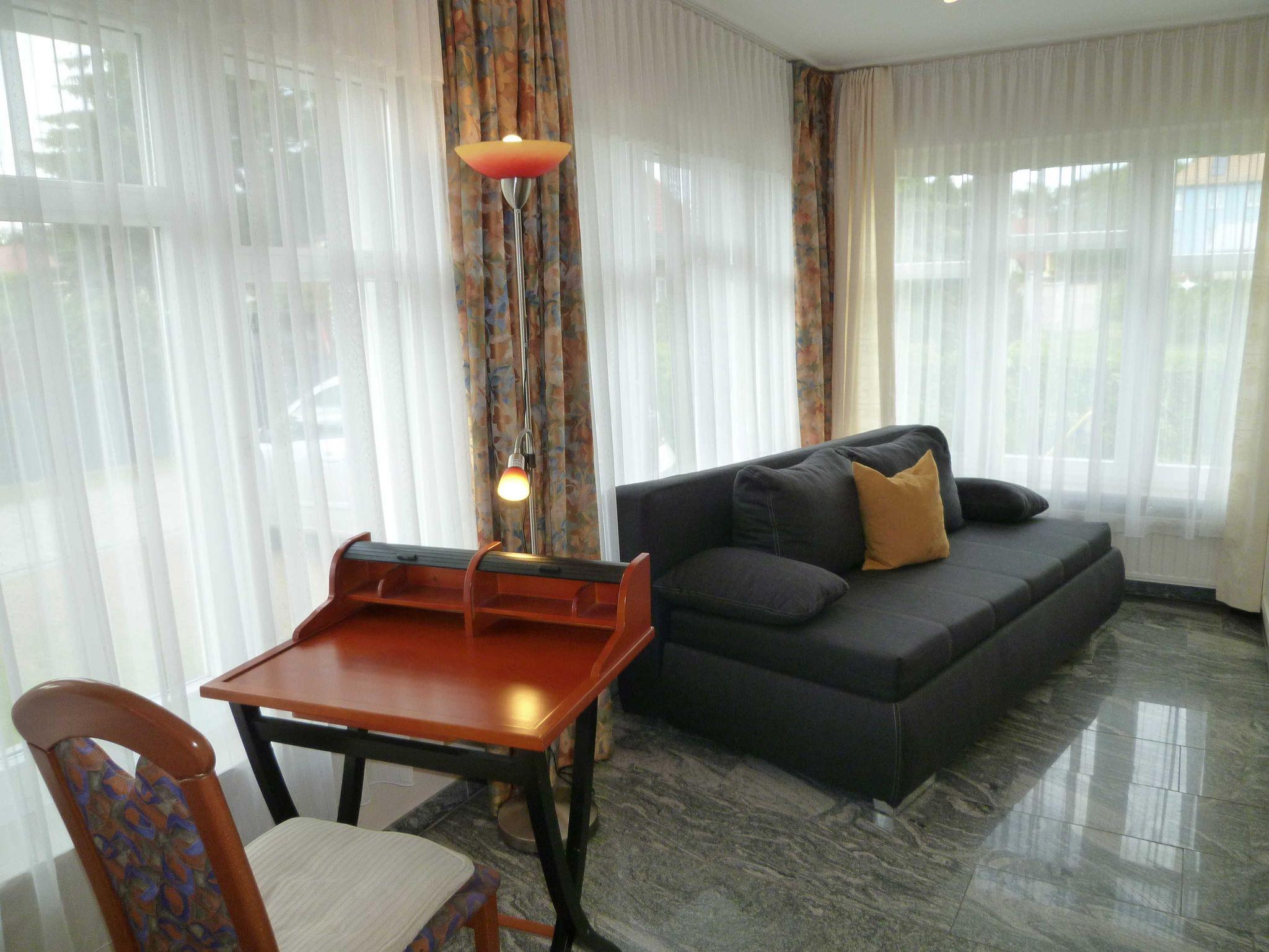 Komfortables und sehr geschmackvoll ausgestattetes Wohnzimmer mit 29 m². Eigene Terrasse vor dem Haus mit Möblierung und Schirm. Außerdem verfügt das Haus über zwei Schlafzimmer und ein weiteres kombiniertes Wohn-/Schlafzimmer. Im Anbau befindet sich ein separates App. für max. 2 Personen. Dieses App. kann, sofern es noch frei ist, dazu gebucht werden. Für Fahrräder stehen Fahrradständer am Haus bereit. Der Autoabstellplatz befindet sich direkt neben dem Haus.