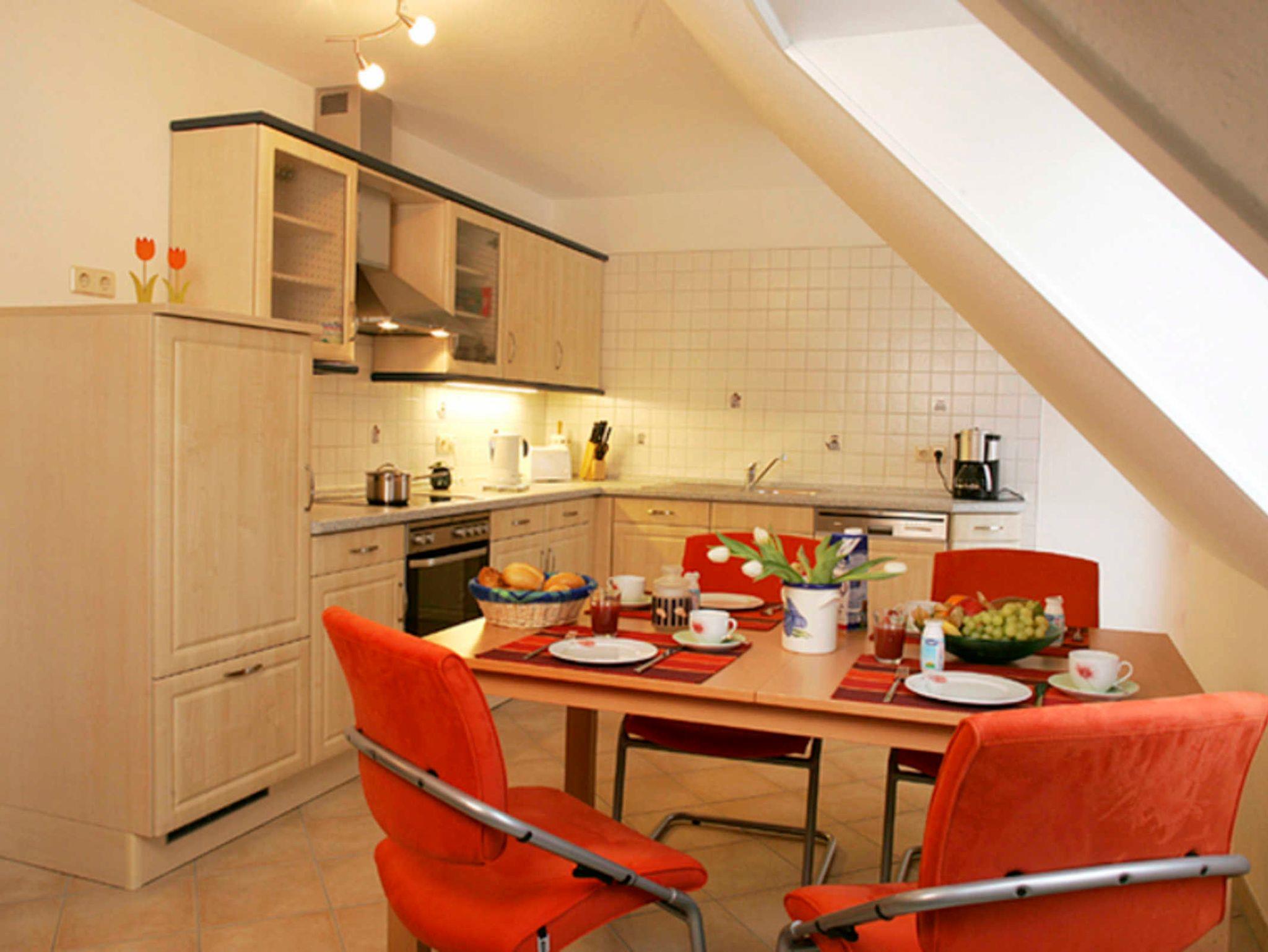 Unsere Maisonette-Wohnung befindet sich in einem Haus mit 6 Ferienwohnungen. Jede Wohnung hat einen separaten Einang. Unseren Gästen stehen 2 PKW-Stellplätze und ein Gartenhaus mit 2 Fahrrädern ( 2 x 28 Zoll ) zur Verfügung (Nutzung auf eigene Gefahr). Die Wohnung erstreckt sich über 2 Etagen und ist für 4 Erwachsene/ Kinder eingerichtet. Im Obergeschoß des Hauses befinden sind Flur, Bad mit Dusche und WC, die Küche mit Essplatz sowie das Wohnzimmer mit Balkon und ein Abstellraum. Vom Wohnzimmer aus gelangen Sie in das Dachgeschoß mit 2 Schlafzimmern. Ein Zimmer ist mit einem Doppelbett 180 cm x 200 cm möbliert; im zweiten Schlafzimmer finden Sie zwei Einzelbetten 90 cm x 200 cm. Wir möchten, dass Sie sich wohlfühlen und haben daher viel Wert auf eine gehobene Ausstattung gelegt: Die Winkeleinbauküche verfügt über eine Kühlschrank mit Gefrierfach, eine Mikrowelle, ein Ceran-Kochfeld, Backofen und Dunstabzughaube, eine Geschirrspülmaschine, Kaffeemaschine, Wasserkocher und Toaster. Des Weiteren ist sie mit allen Haushaltsgegenständen wie Geschirr, Gläsern, Töpfen, Besteck, usw. bestückt. Ein großer Esstisch mit 4 Stühlen lädt zum Verweilen ein. Ein Kinderhochstuhl, Kindergeschirr- und -besteck sind ebenfalls verfügbar. Im Wohnzimmer steht Ihnen neben einer Sitzgruppe ein Hochlehnsessel für gemütliche Schmökerstunden zur Verfügung. Ein Fernsehgerät, ein DVD-Player und eine kleine Stereo-Anlage (Radio, CD,Kassettenteil ) sind ebenfalls vorhanden. Das Bad bietet ausreichend Stauraum und ist mit einem Handtuch-Heizkörper ausgestattet. Auf dem Balkon befinden sich ein Tisch und vier Stühle. Bitte beachten Sie, das es sich um eine Nichtraucherwohnung handelt - Rauchen können Sie auf dem Balkon! Da wir die Wohnung auch an Allergiker vermieten möchten, bitte keine Haustiere mitbringen!