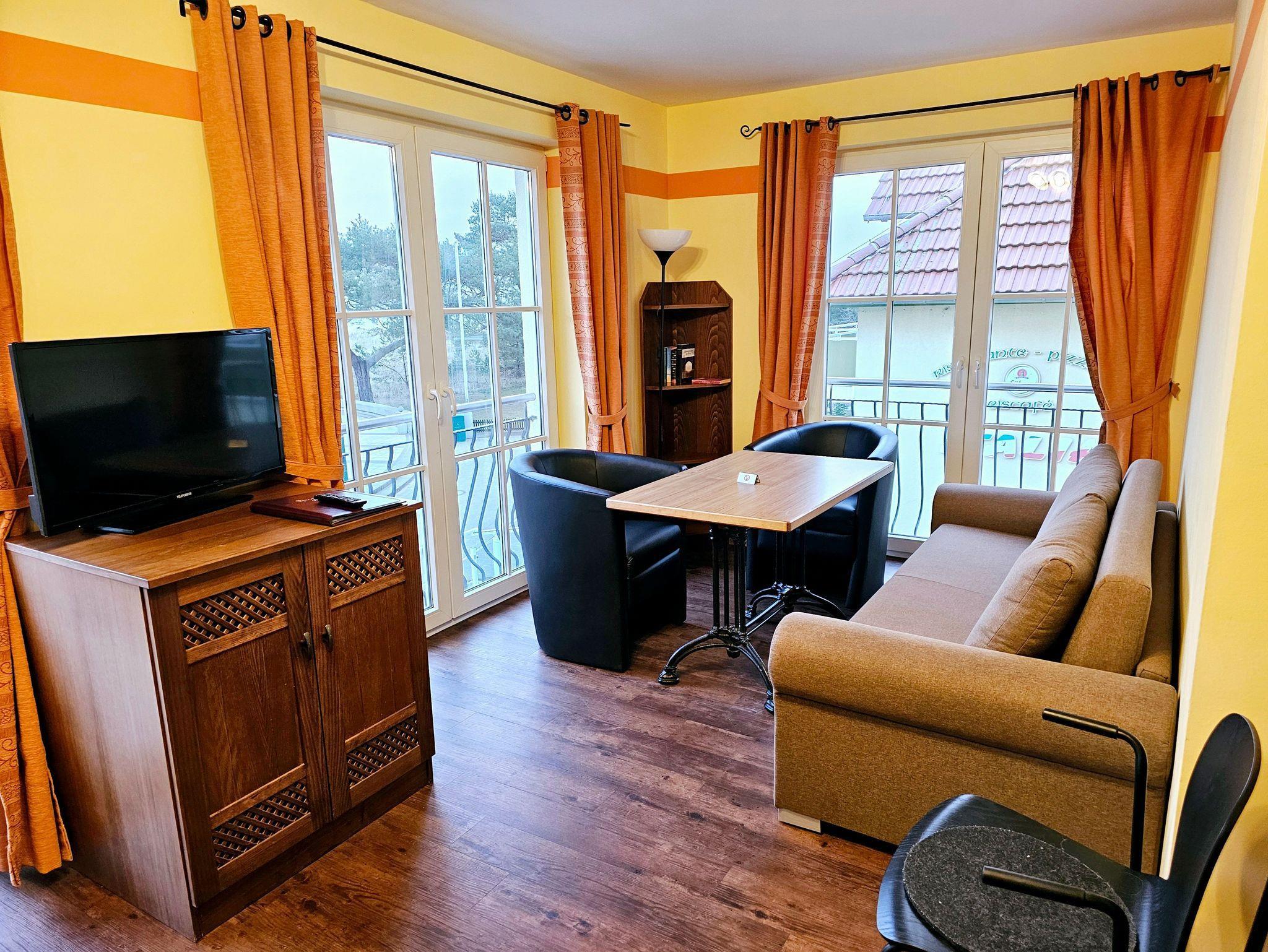 Das attraktive Ferienappartement im 1.OG besteht aus einem Schlaf- und einem Wohnraum mit Balkon. Vom Wohnzimmer und dem Balkon hat man einen herrlichen Blick auf die Ostsee. Die Küche ist ausgestattet mit Geschirrspüler, Herd mit Ceranfeld, Mikrowelle mit Grill- und Backfunktion, Kühlschrank, Toaster und Kaffeemaschine. Im Wohnraum befindet sich ein Mediencenter mit SAT-TV, Radio und DVD-Spieler. Sie können die Mahlzeiten entweder im Restaurant im EG oder auf dem eigenen Balkon genießen. Neben dem Doppelbett im Schlafzimmer kann die Schlafcouch im Wohnzimmer zur Aufbettung genutzt werden. Der Boden ist mit Fußbodenheizung ausgestattet und mit Design-Vinyl Bodenbelag oder Fliesen belegt.