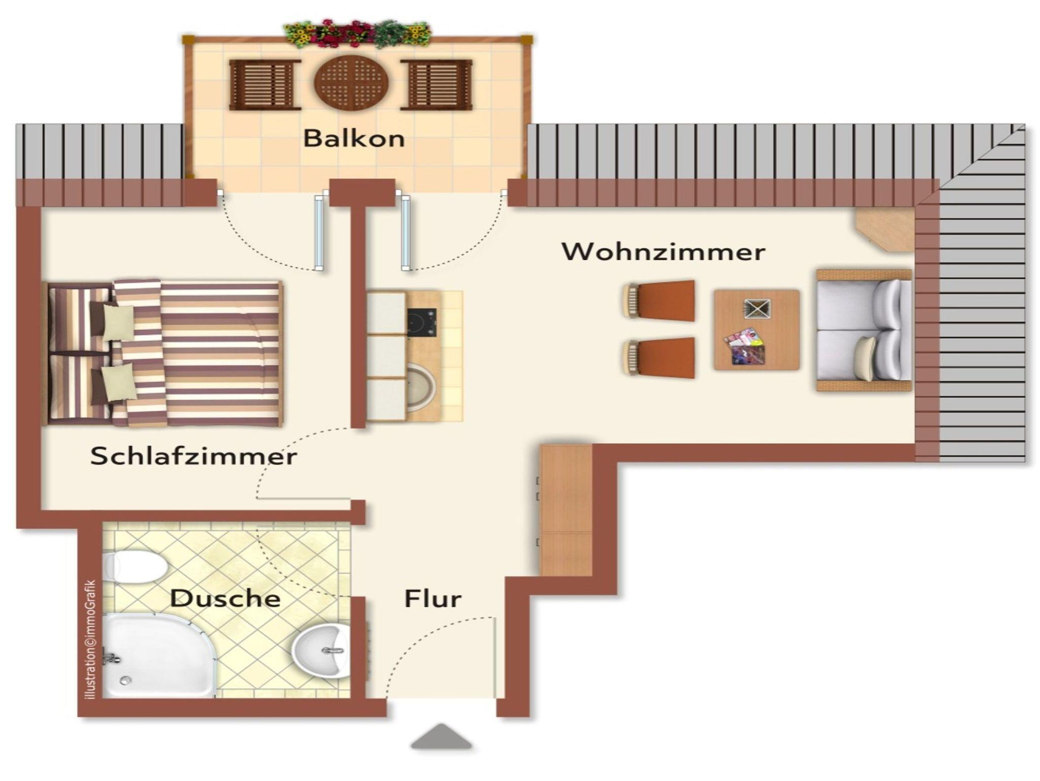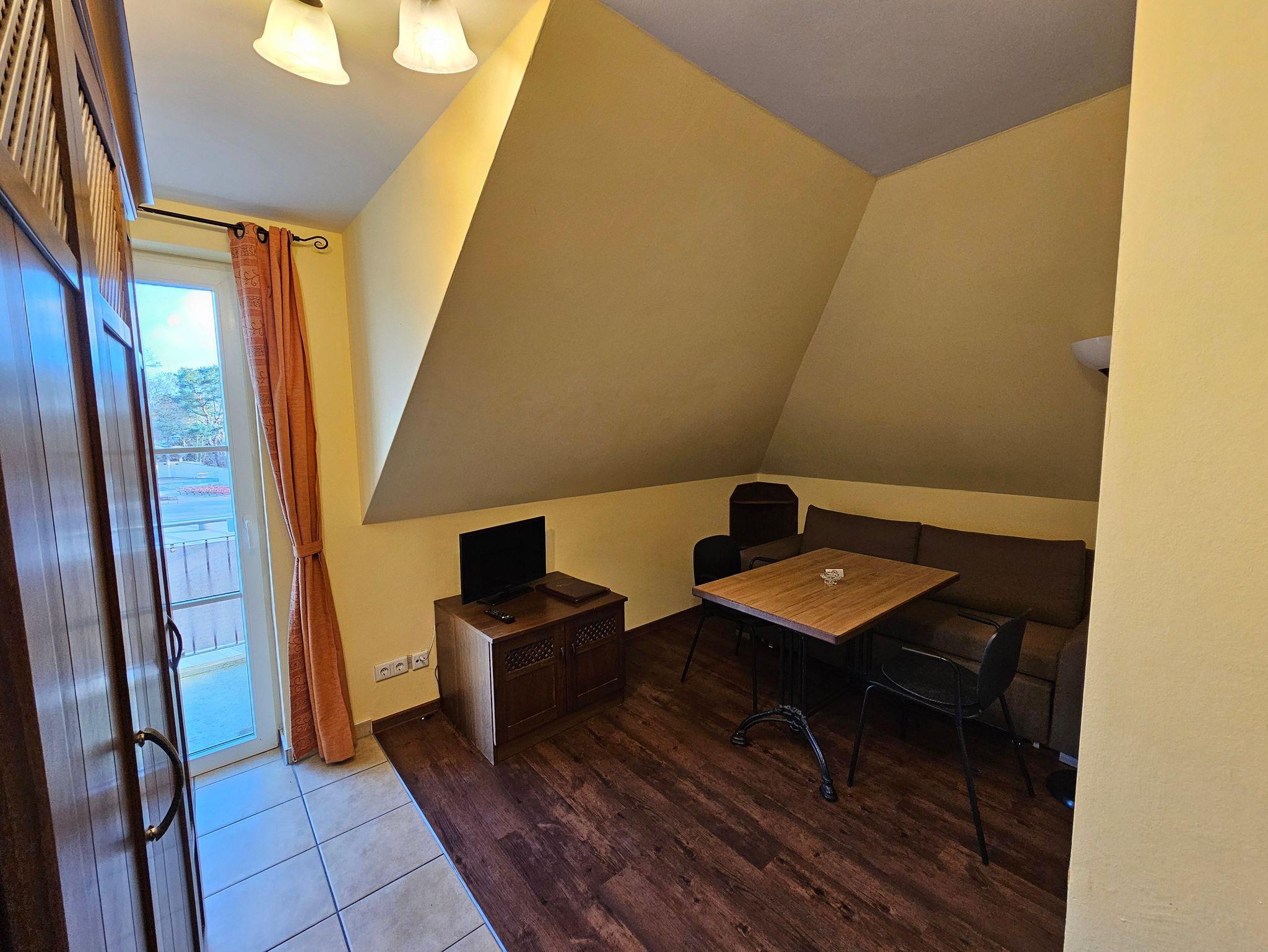 Das attraktive Ferienappartement im 2.OG besteht aus einem Schlaf- und einem Wohnraum mit Balkon. Vom Balkon hat man einen herrlichen Blick auf die Ostsee. Die Küche ist ausgestattet mit Geschirrspüler, Herd mit Ceranfeld, Mikrowelle mit Grill- und Backfunktion, Kühlschrank, Toaster und Kaffeemaschine. Im Wohnraum befindet sich ein Mediencenter mit SAT-TV, Radio und DVD-Spieler. Sie können die Mahlzeiten entweder im Restaurant im EG oder auf dem eigenen Balkon mit Blick auf die Ostsee genießen. Der Boden ist mit Fußbodenheizung ausgestattet und mit Design-Vinyl Bodenbelag oder Fliesen belegt.