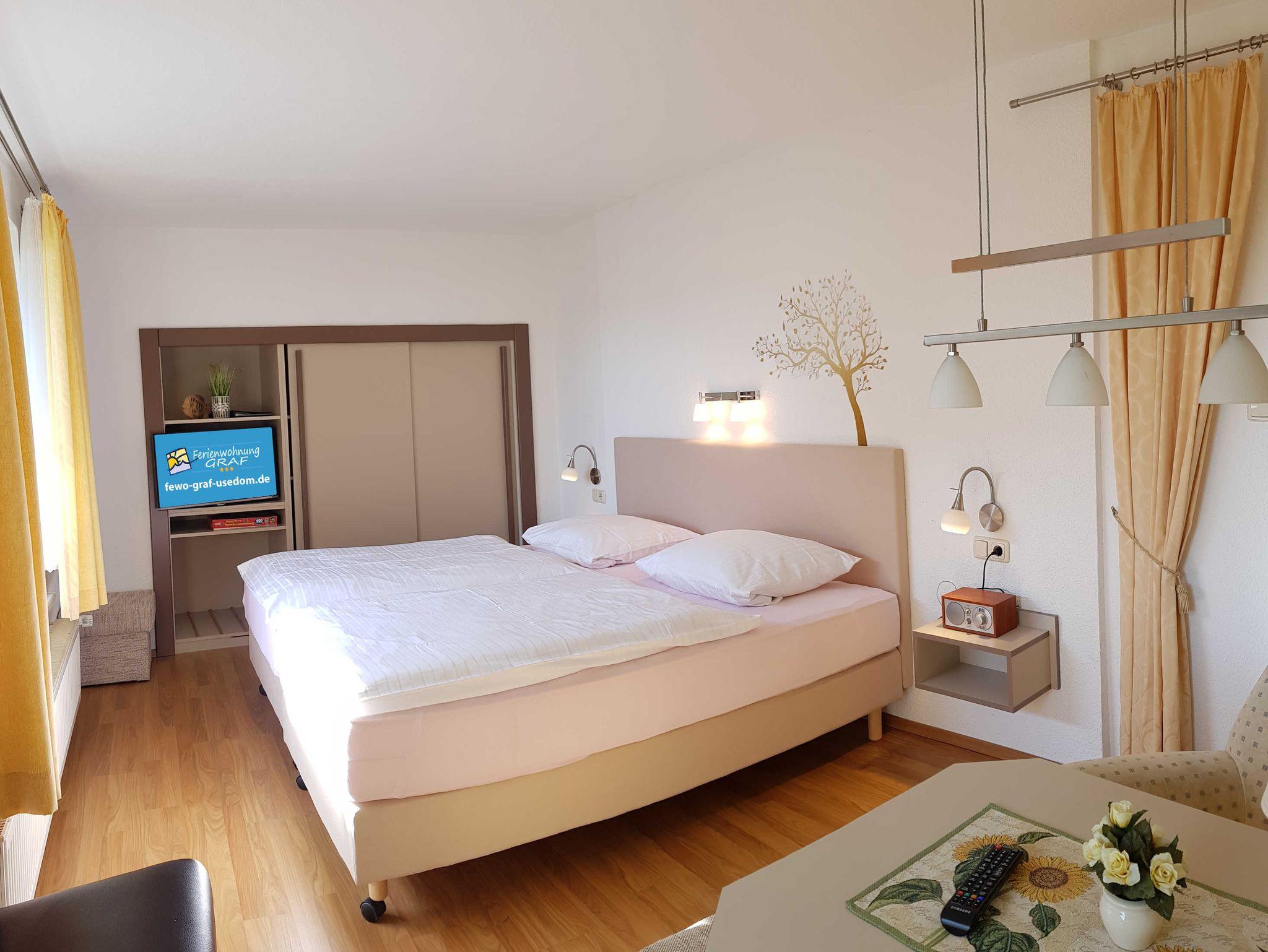 Der Wohnbereich mit Sesseln, Beistelltisch, TV und Radio ist mit dem Schlafraum kombiniert. Die bequemen Betten mit Blickrichtung ins Grüne laden zur Entspannung ein. Der geräumige Schrank bietet Platz für Ihre persönlichen Sachen. Die Küchenzeile ist mit Kühlschrank, Kaffeemaschine, Wasserkocher, Mikrowelle, Cerankochfeld und Toaster ausgestattet. Zusätzlich zählen Geschirr, Gläser, Besteck und verschiedene Kochutensilien zum Kücheninventar. Zur Grundausstattung des Tageslichtbades gehören Haartrockner, Duschmatte, Zahnputzbecher und Seifenspender.