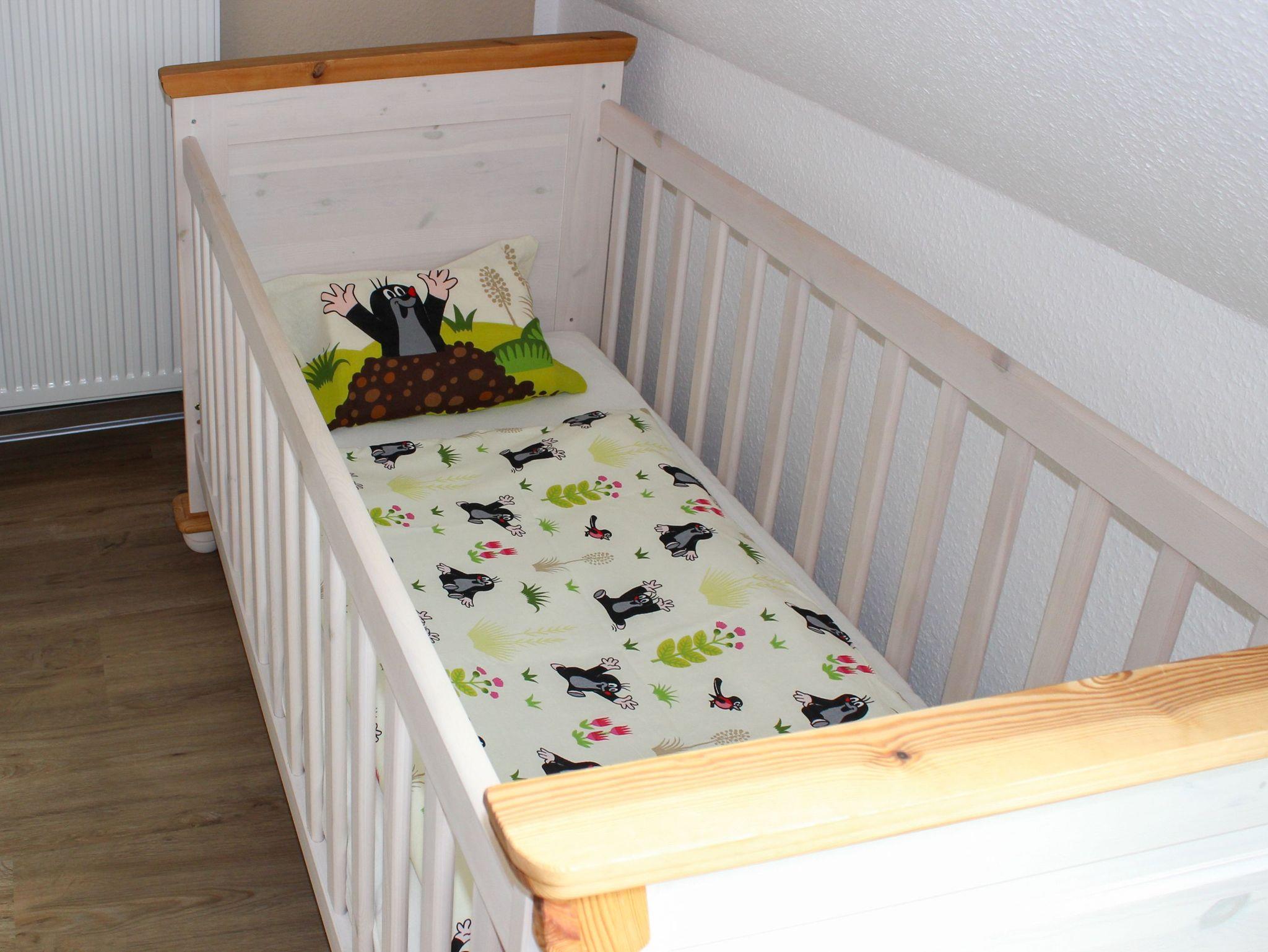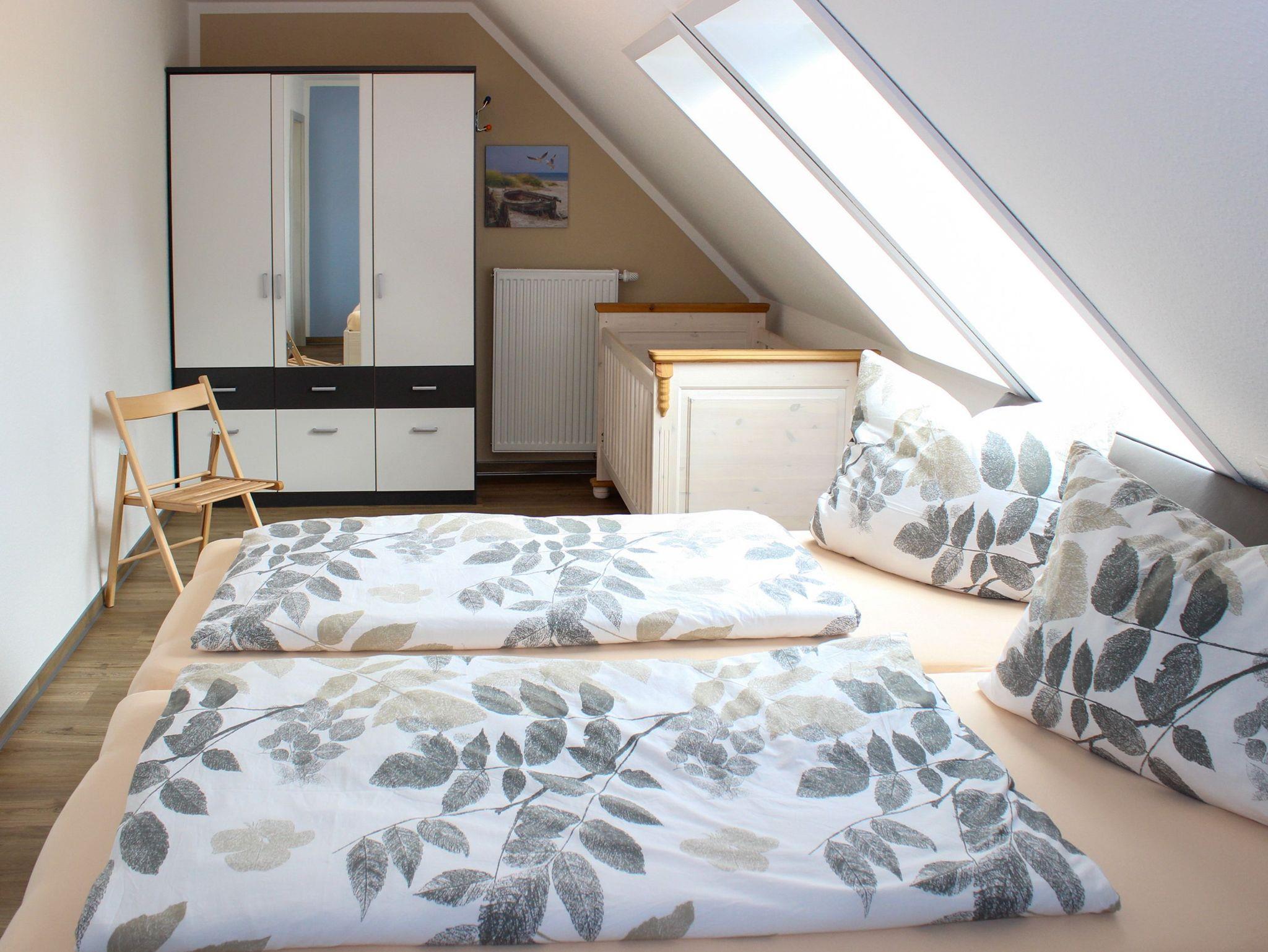 Highlight der Fewo Anna: Sie ist mit 58 m² die größte der Fewos und die beiden Schlafräume im Obergeschoss sind recht großzügig geschnitten. Im Schlafzimmer der Eltern gibt es ein festes Kinderbett.