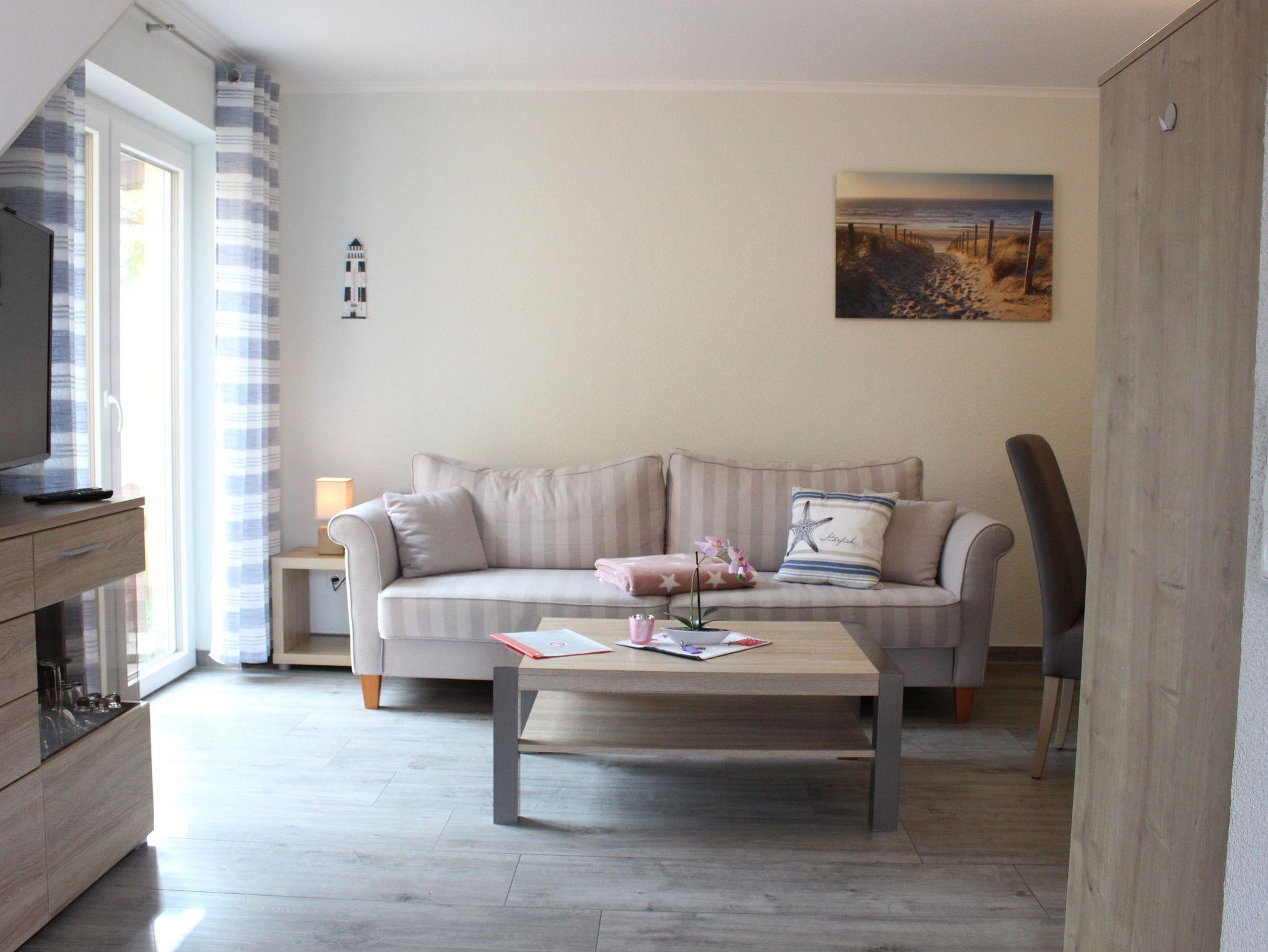Der Wohnbereich ist mit Esstisch, Schlafcouch und LED-TV mit Sat-Empfang ausgestattet.