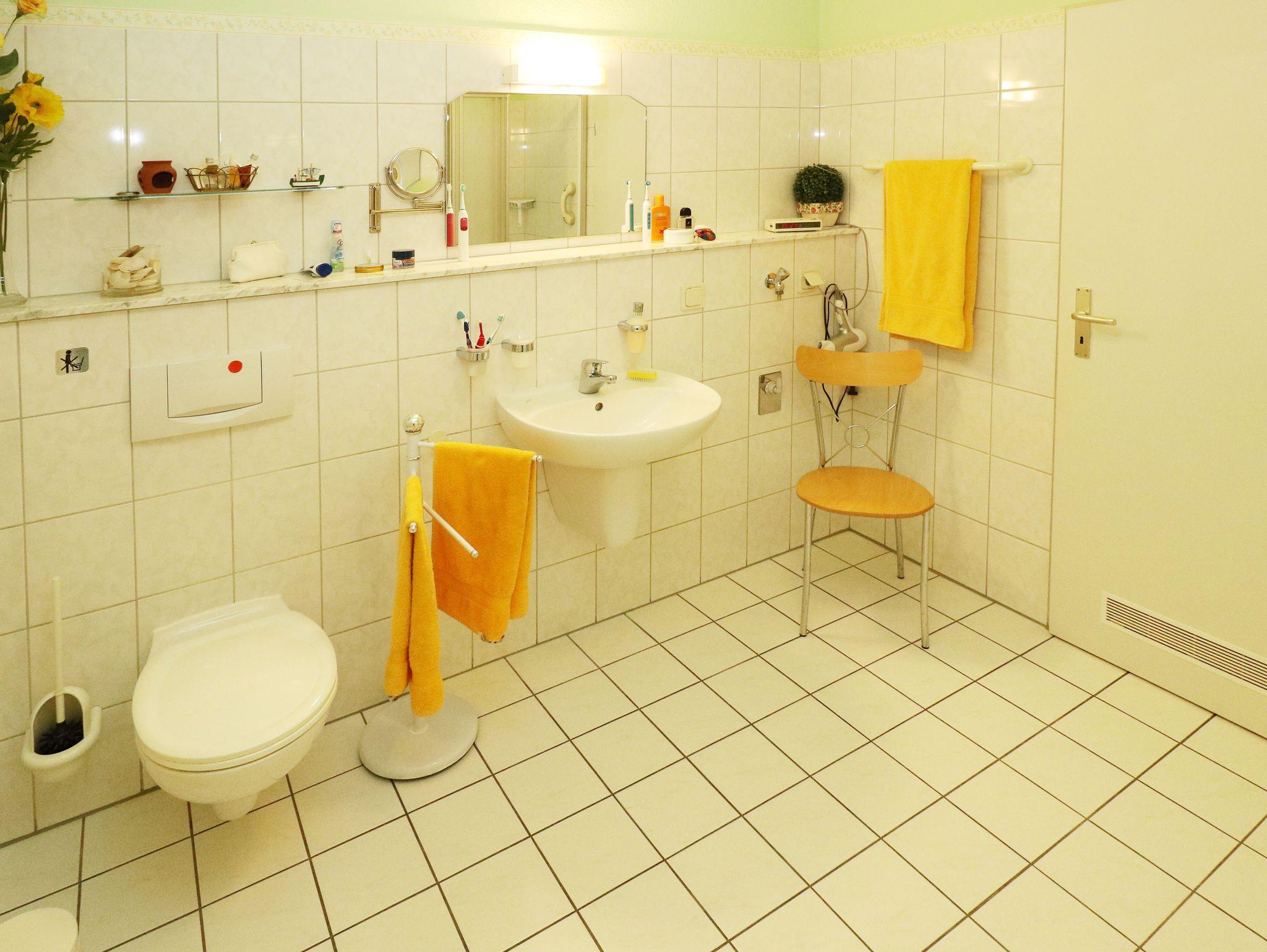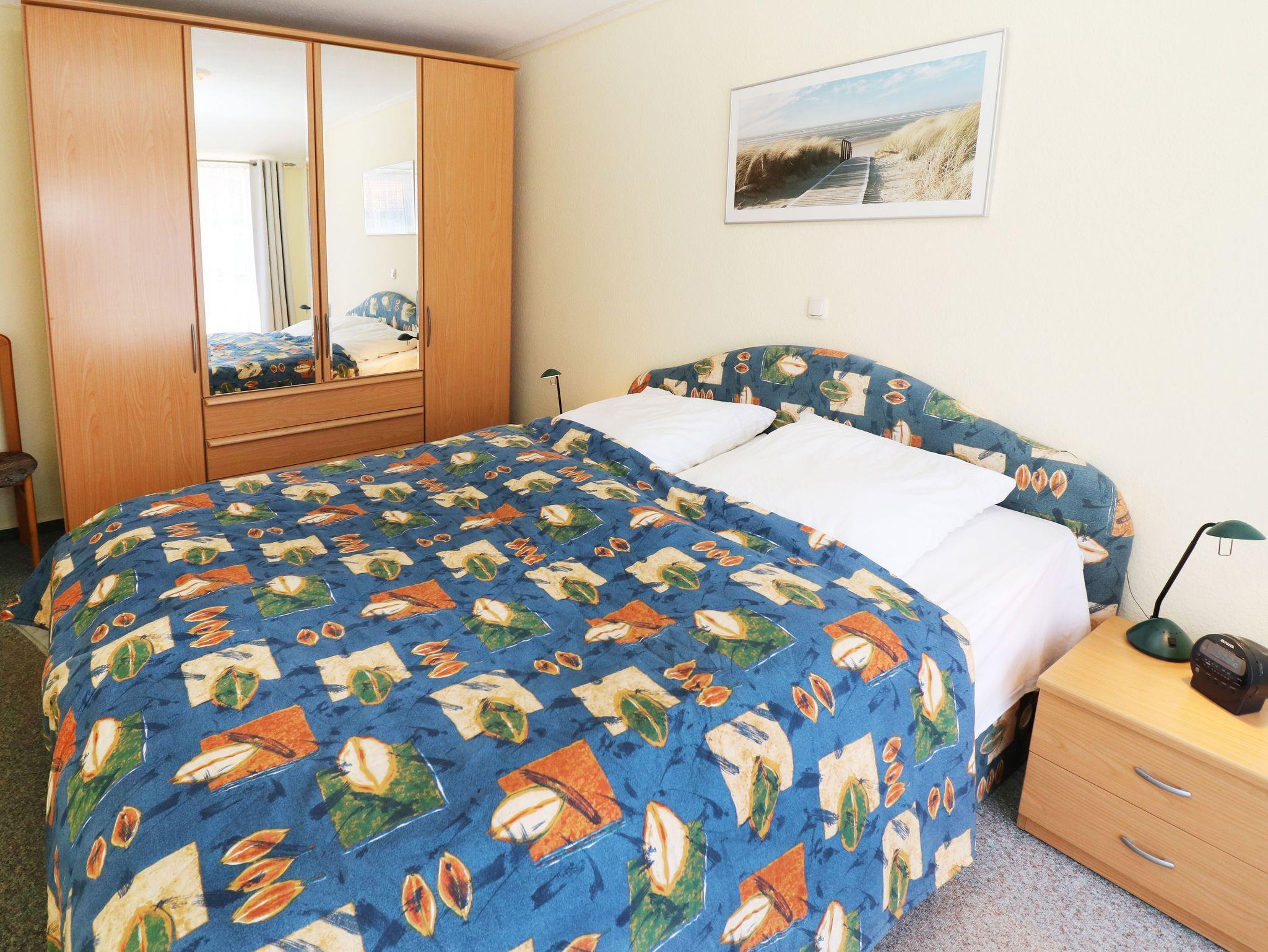 Das Doppelbett im Schlafzimmer hat eine Matratzenhöhe von 55 cm, also eine bequeme „Einstiegs“-Höhe. Dort ist auch ein zweites TV-Gerät installiert.